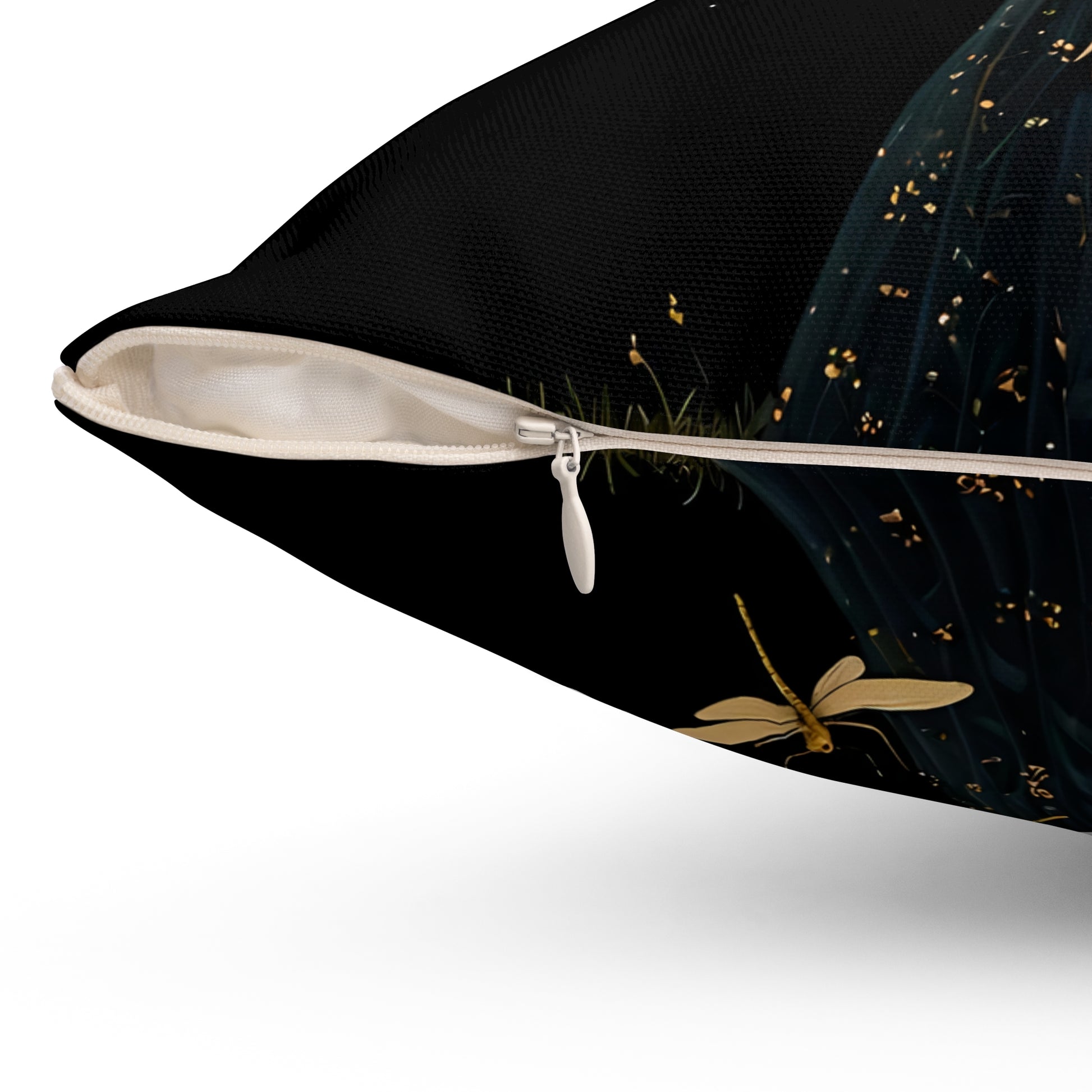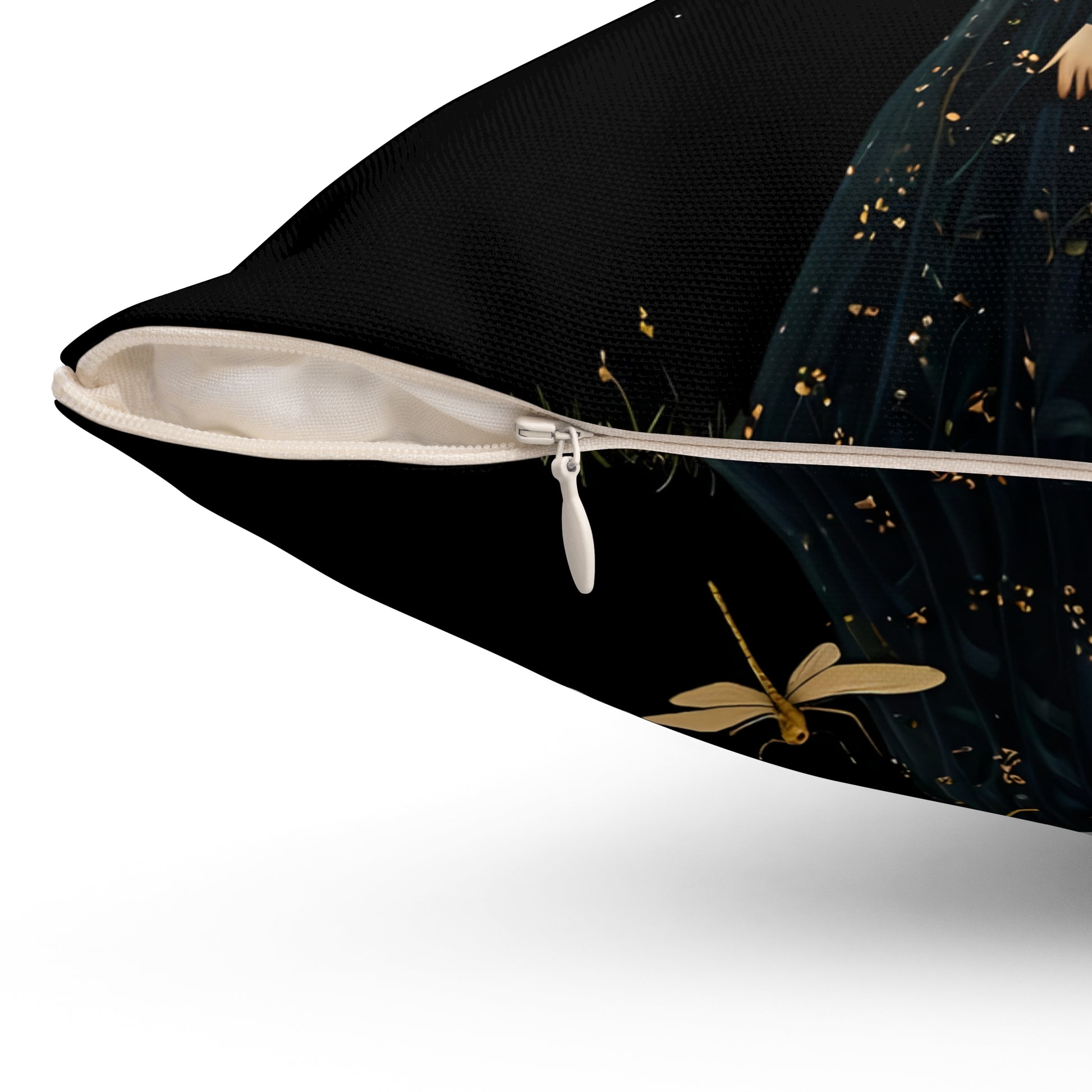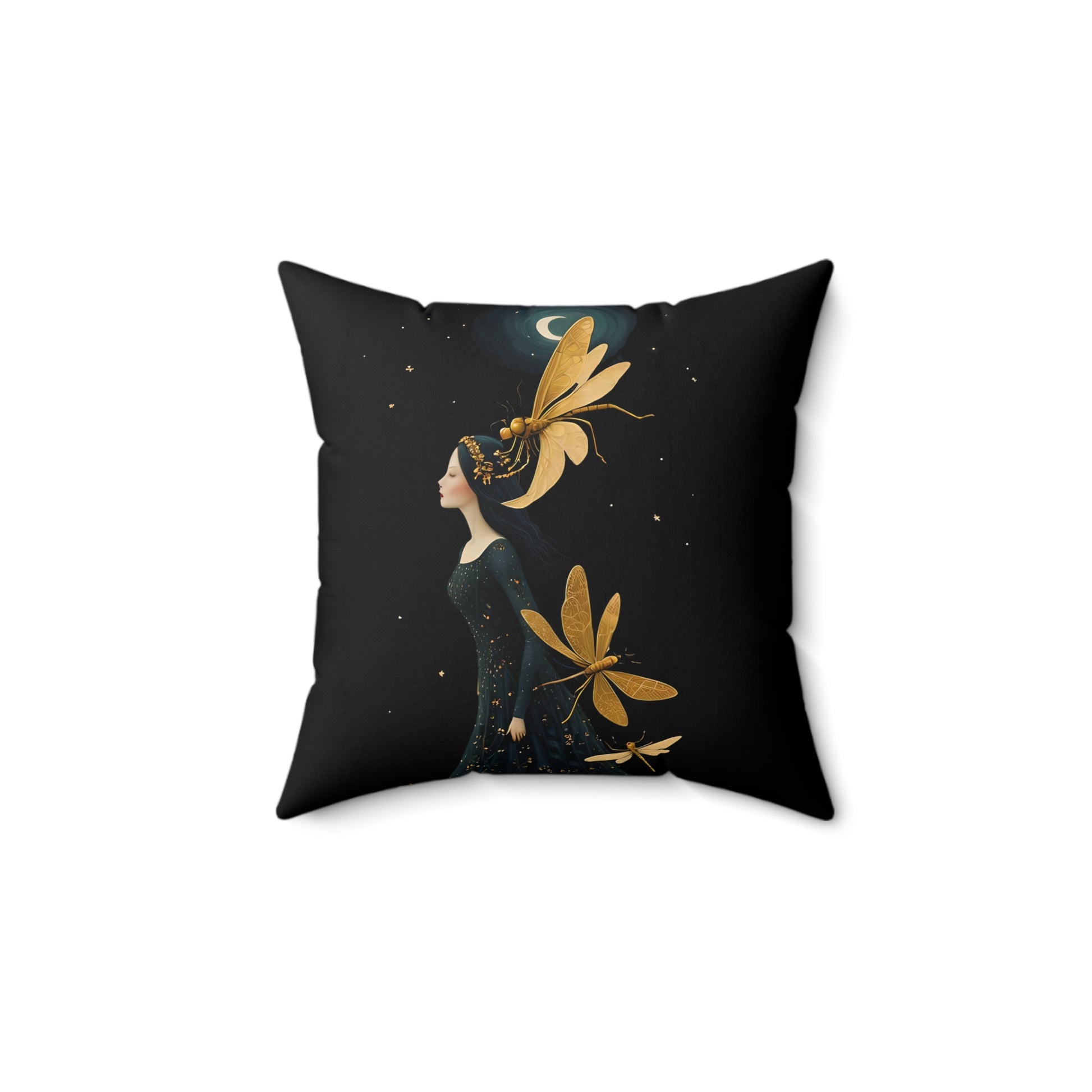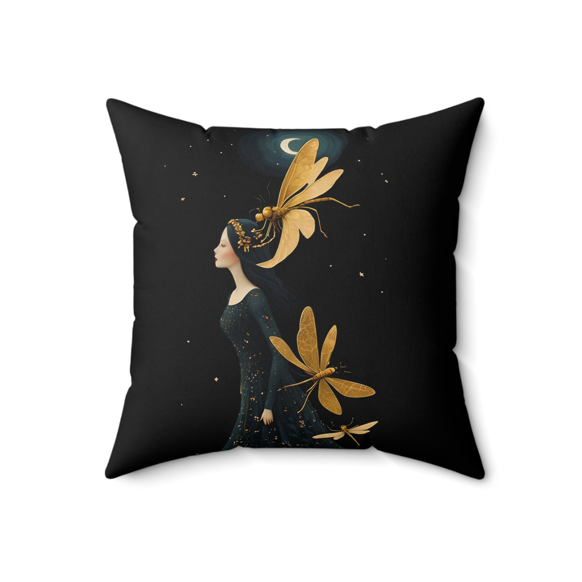 A Square Pillow featuring Midnight Girl followed by golden dragonflies at night art by Fairyhill studio. This pillow gives off a mystical and magical vibe, perfect for those who love fantasy and nature themes. Ideal for adding a touch of enchantment to your home decor or as a thoughtful gift for fans of dragonflies and fairytale art. Great for birthdays, Christmas, or housewarmings.