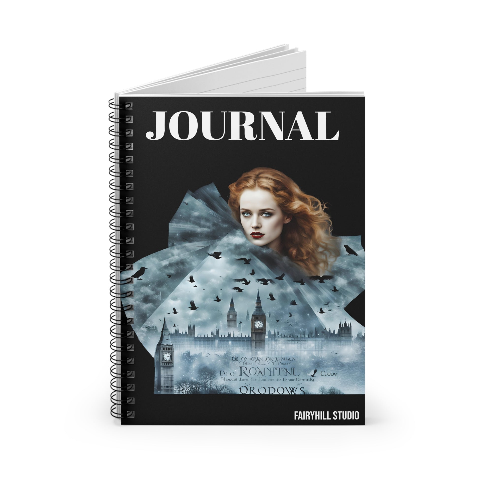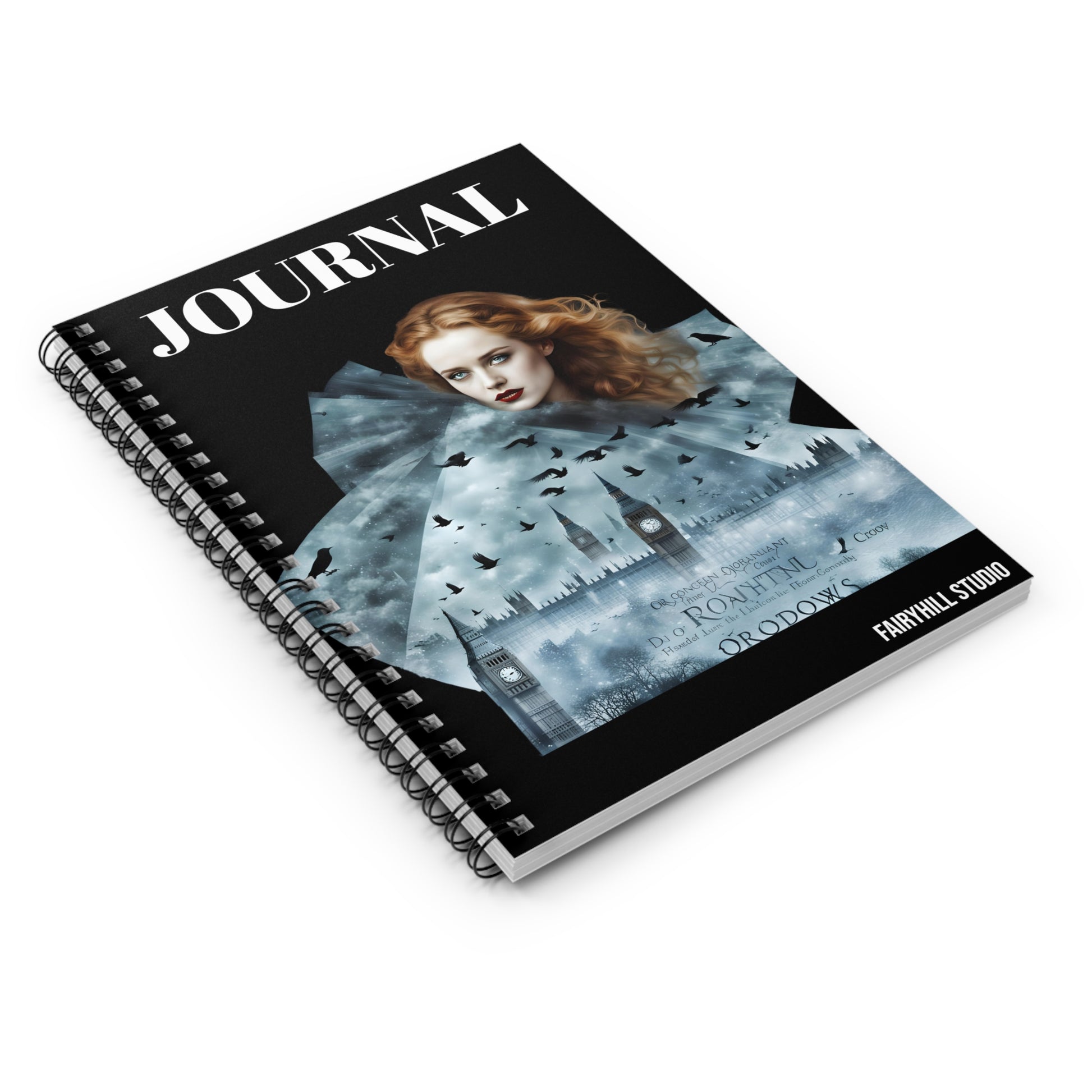 Gothic Fashion Model in London night city line at background Spiral Notebook - perfect for writing notes or journaling with a stylish and edgy vibe. Ideal for those who love gothic fashion and trendy cityscapes. Relevant for Halloween, fashion enthusiasts, and students.