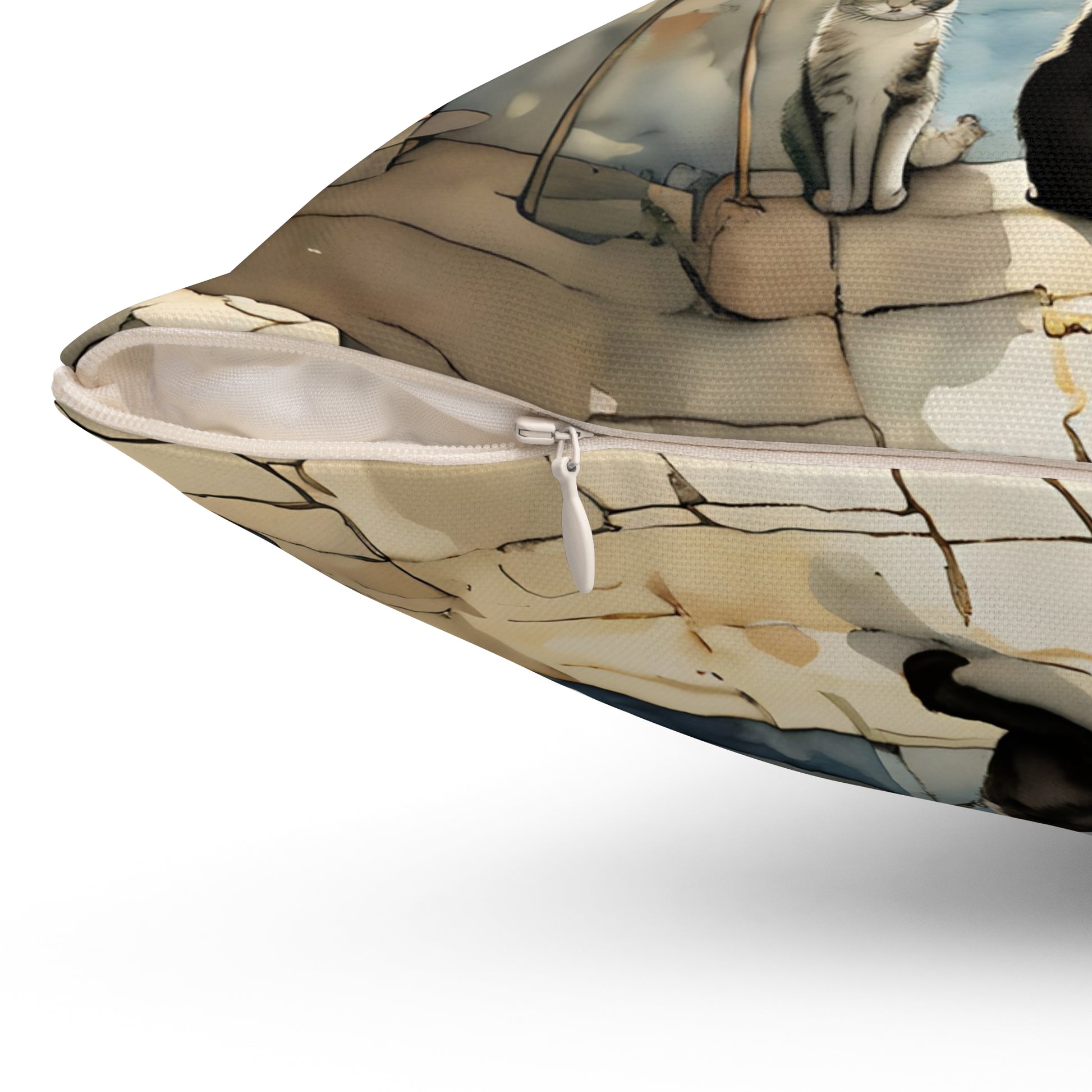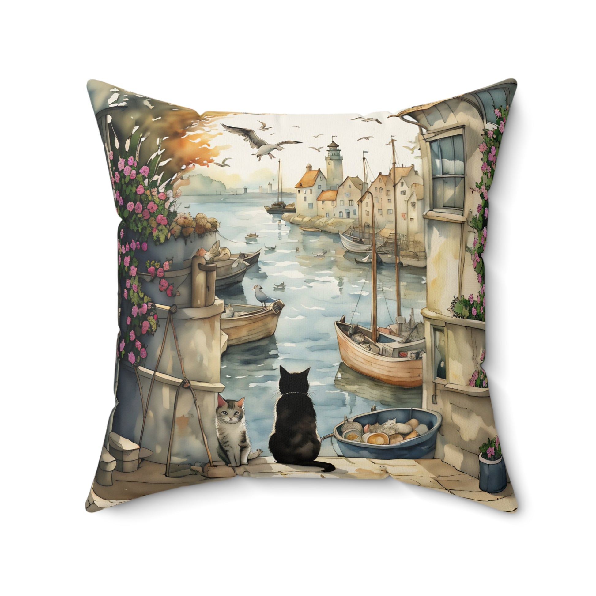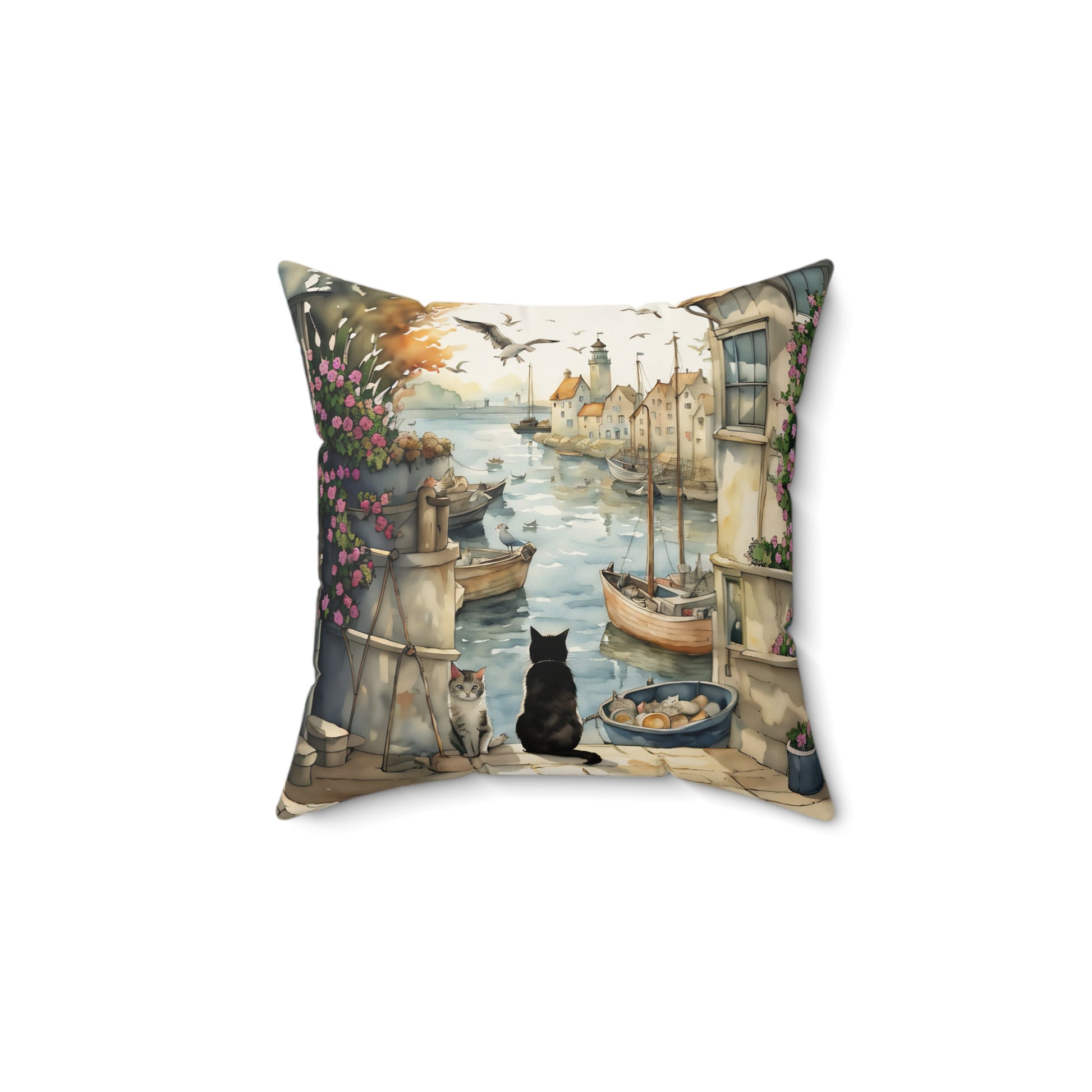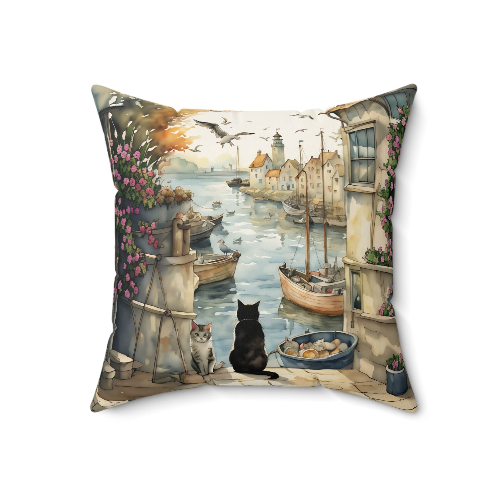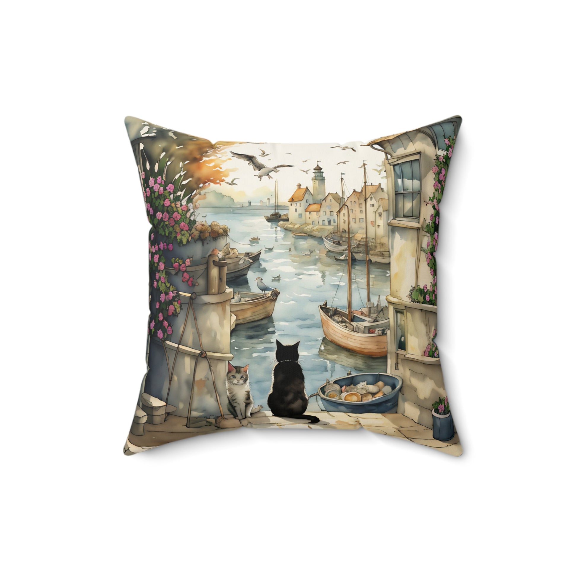 This double-sided printed Harbour cats Square Pillow - by Fairyhill Studio Square  pillow features a Black cat on a balcony  Square Pillow by fairyhill studio, giving off a whimsical and charming vibe. Perfect for  book art lovers lovers and those who enjoy a touch of whimsy in their decor. Ideal for spring and summer home decor, garden parties, and cat-themed celebrations.