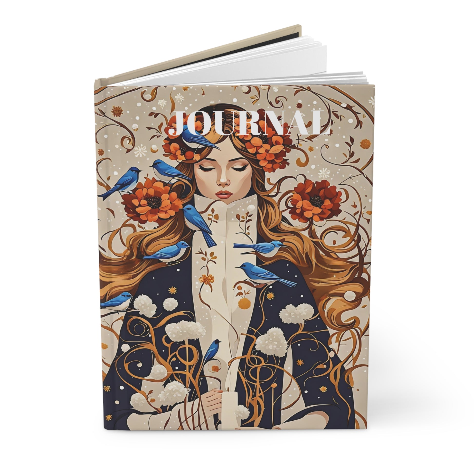 This Journal features a design of a young girl with a hat and dragonfly in front of a fairy tale cottage, giving off a whimsical and magical vibe. Perfect for journaling, sketching, or note-taking. Ideal for those who love fairy tales and nature. Great for gifting during birthdays, holidays, or as a special keepsake.