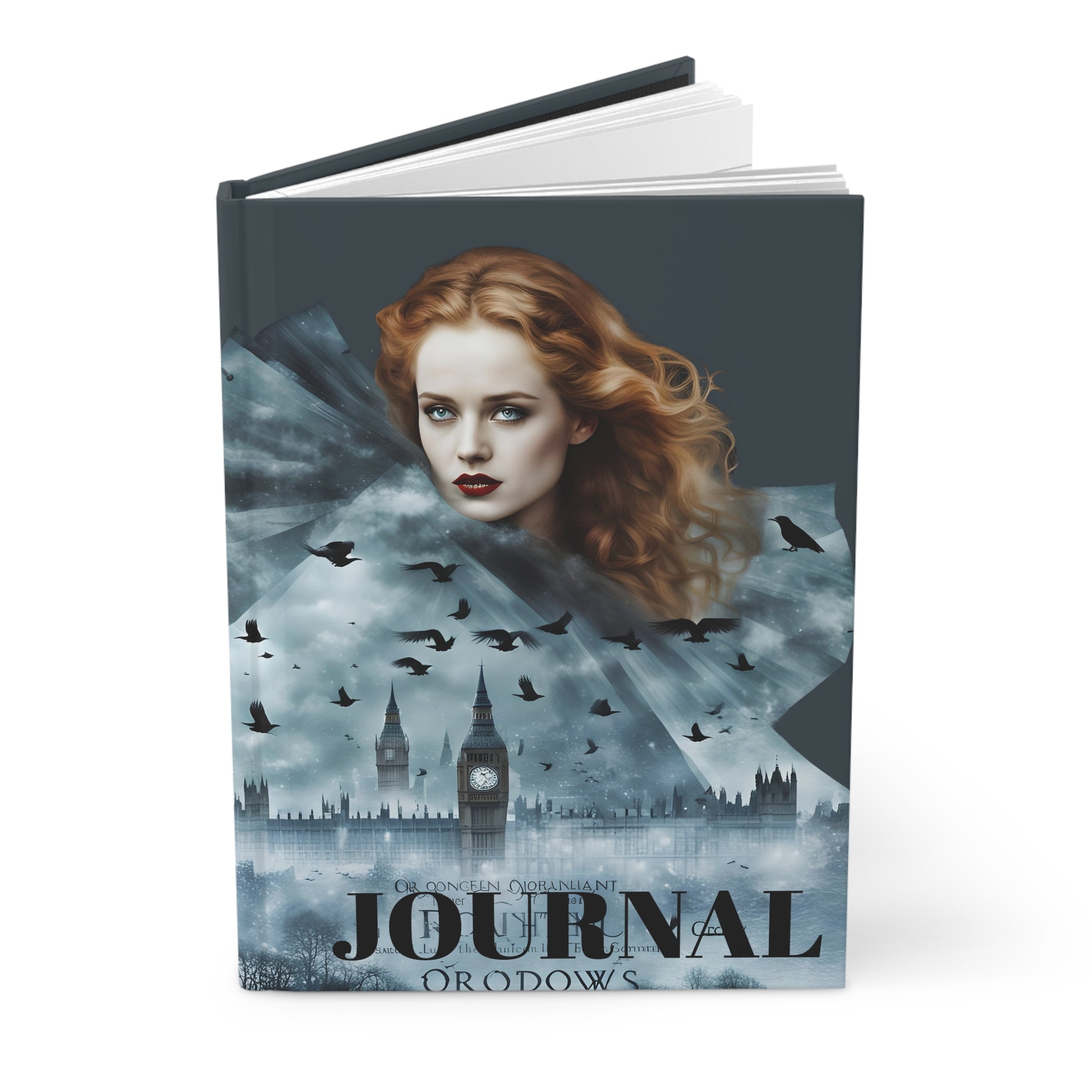A stunning hardcover journal featuring a beautiful red head fashion model in front of the Big Ben clock with the London city skyline at night. This journal is perfect for London, travel, and art lovers. Ideal as a gift for holidays, birthdays, and all occasions.