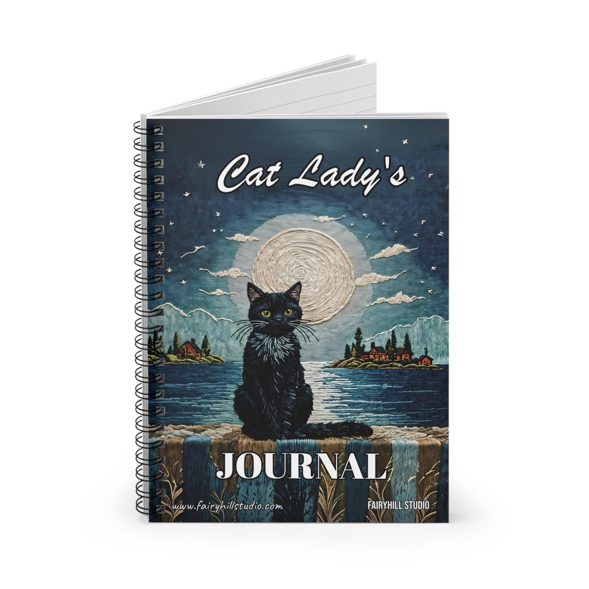 This Hardcover Journal features a Matte Black Cat sitting on a seashore under a full moon, creating a mysterious and magical vibe. Perfect for writers and artists looking for inspiration, this notebook is relevant for Halloween, cat lovers, and anyone who enjoys mystical themes.