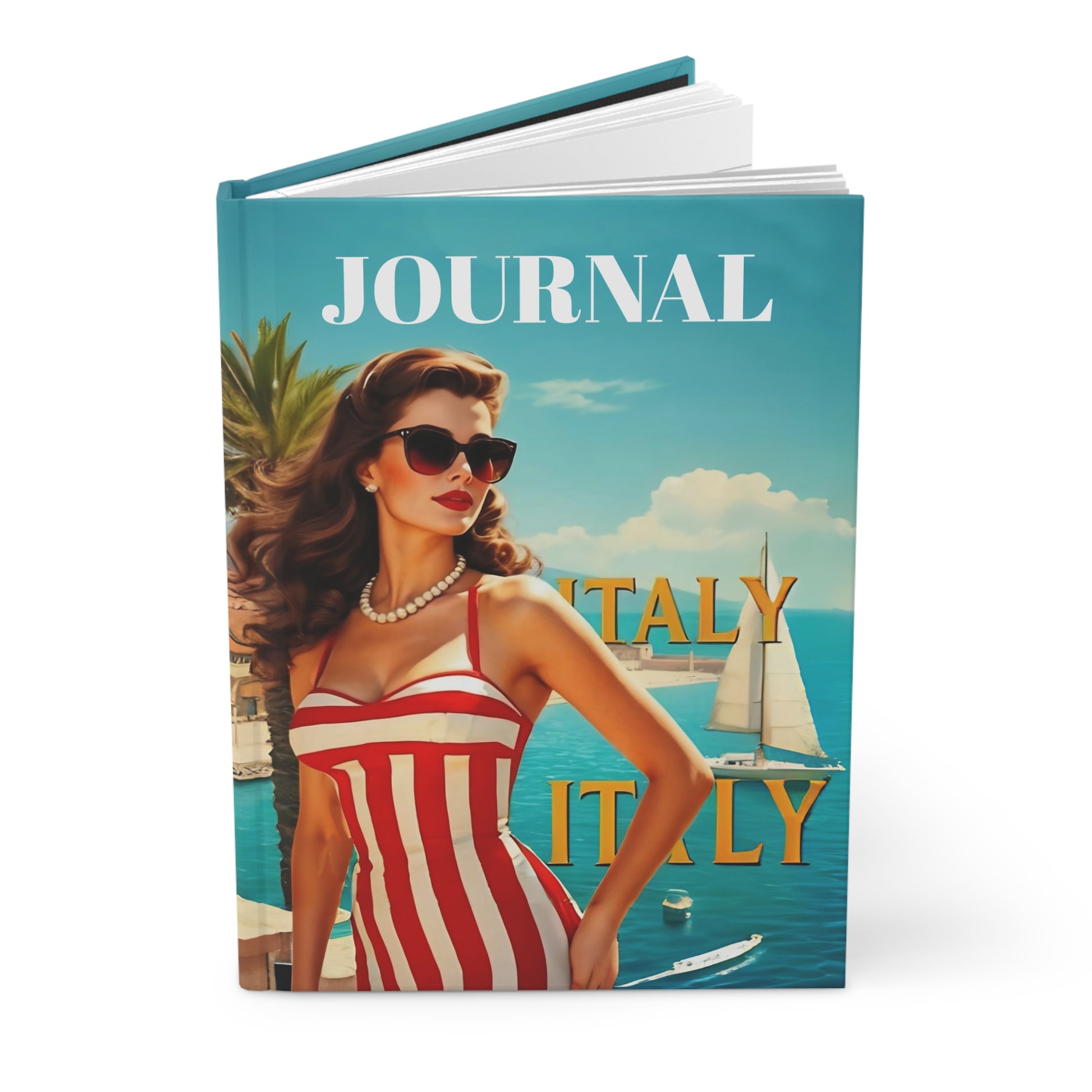 Capturing the charm of 1920's Italy, this journal features a beautiful girl in a red and white striped dress with a scenic sea and boat background. Perfect for those who love vintage aesthetics and enjoy jotting down their thoughts or sketches. Ideal for travel enthusiasts, history buffs, and art lovers. Great for gifting on birthdays, holidays, or as a special keepsake.