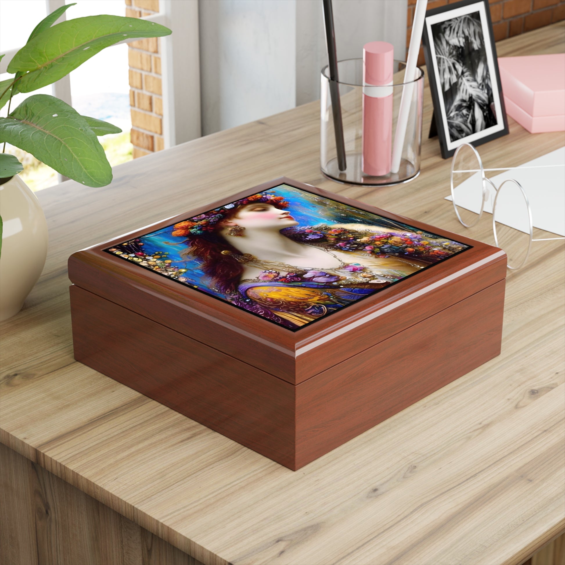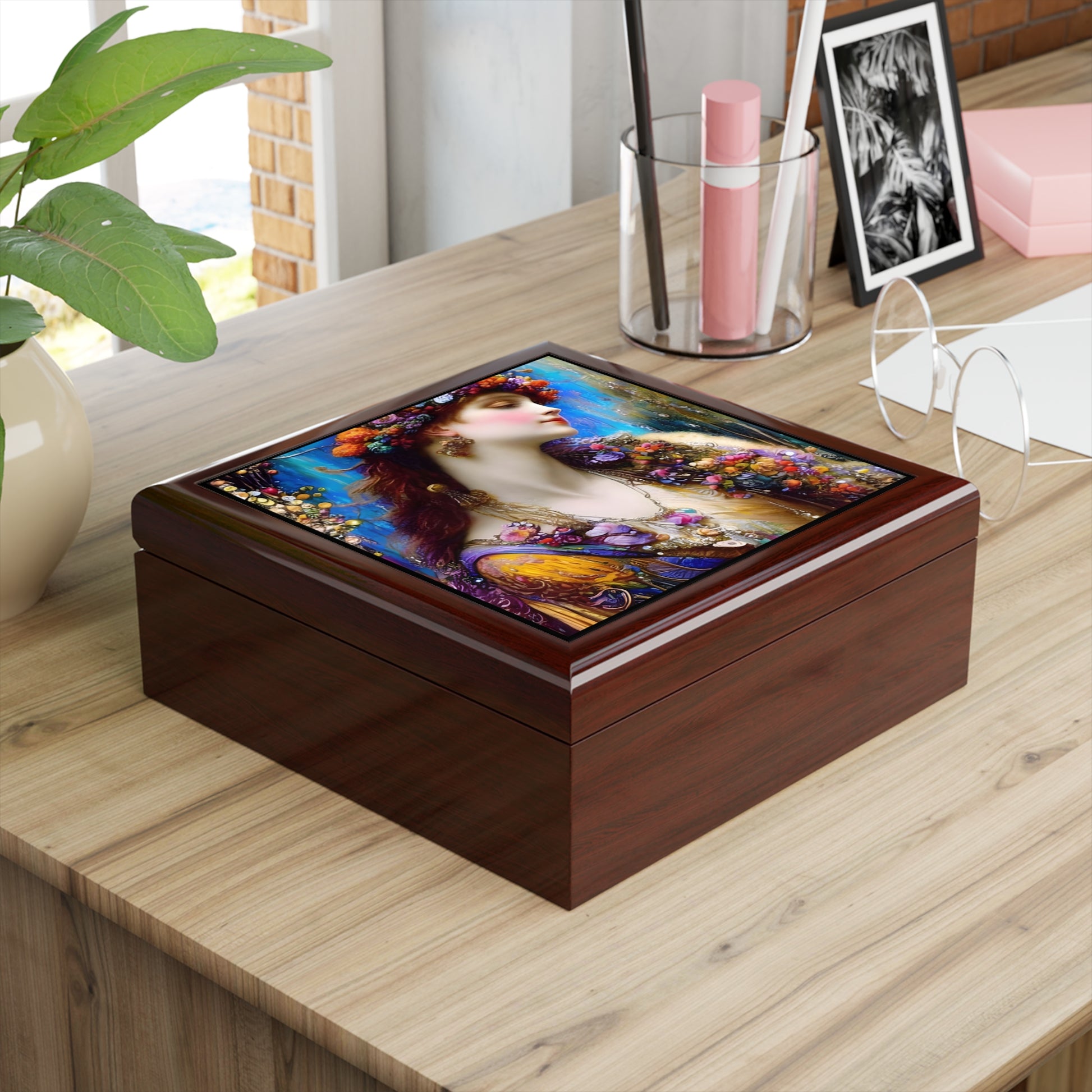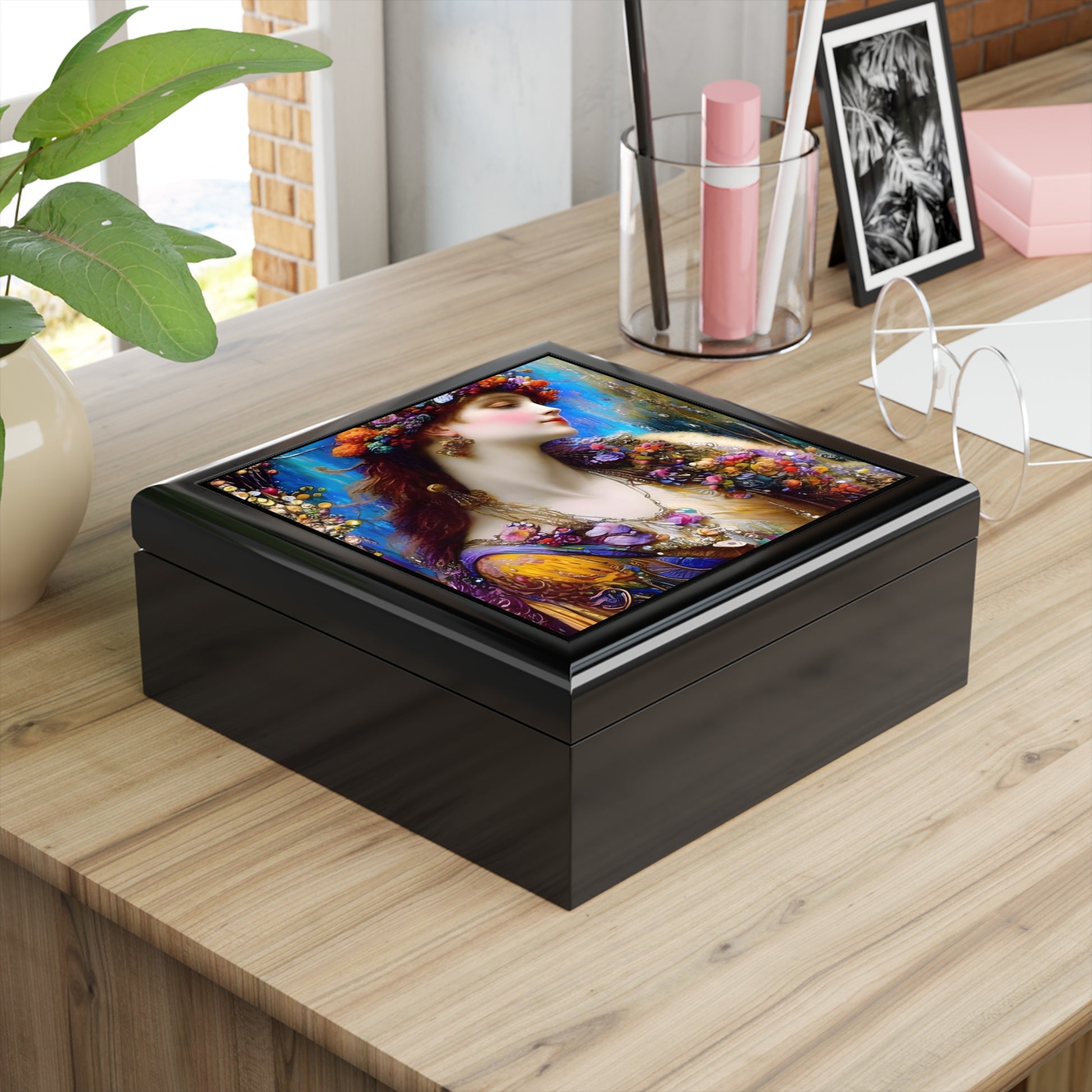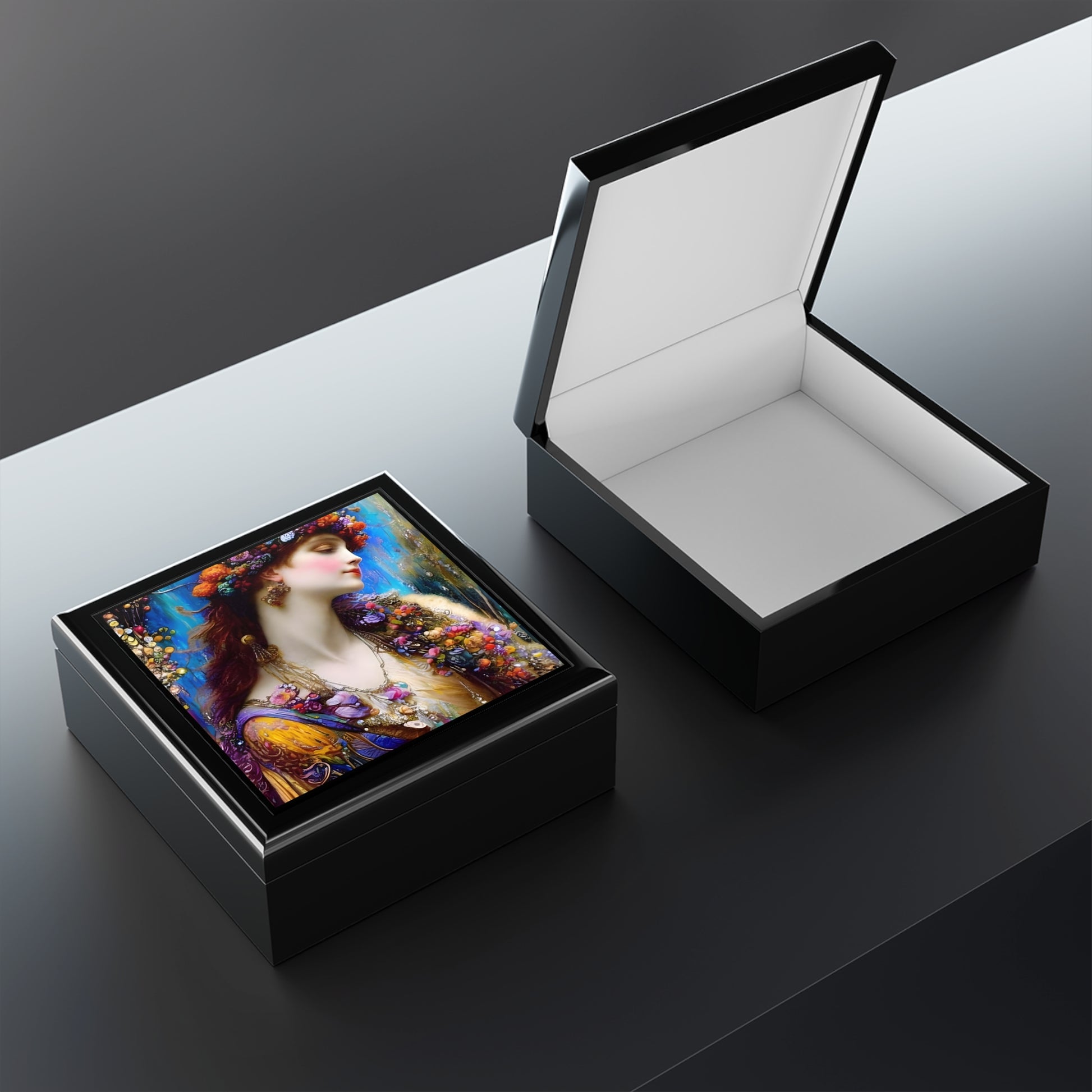 Keep all your valuables safe in custom style with this - Spring Offering Alma Tadema Style Art Inspired personalized jewelry box. Available in multiple colors, this jewelry box features dual hinges which lock at 90 degrees, an elegant glossy finish, and a soft interior lined with felt material.
