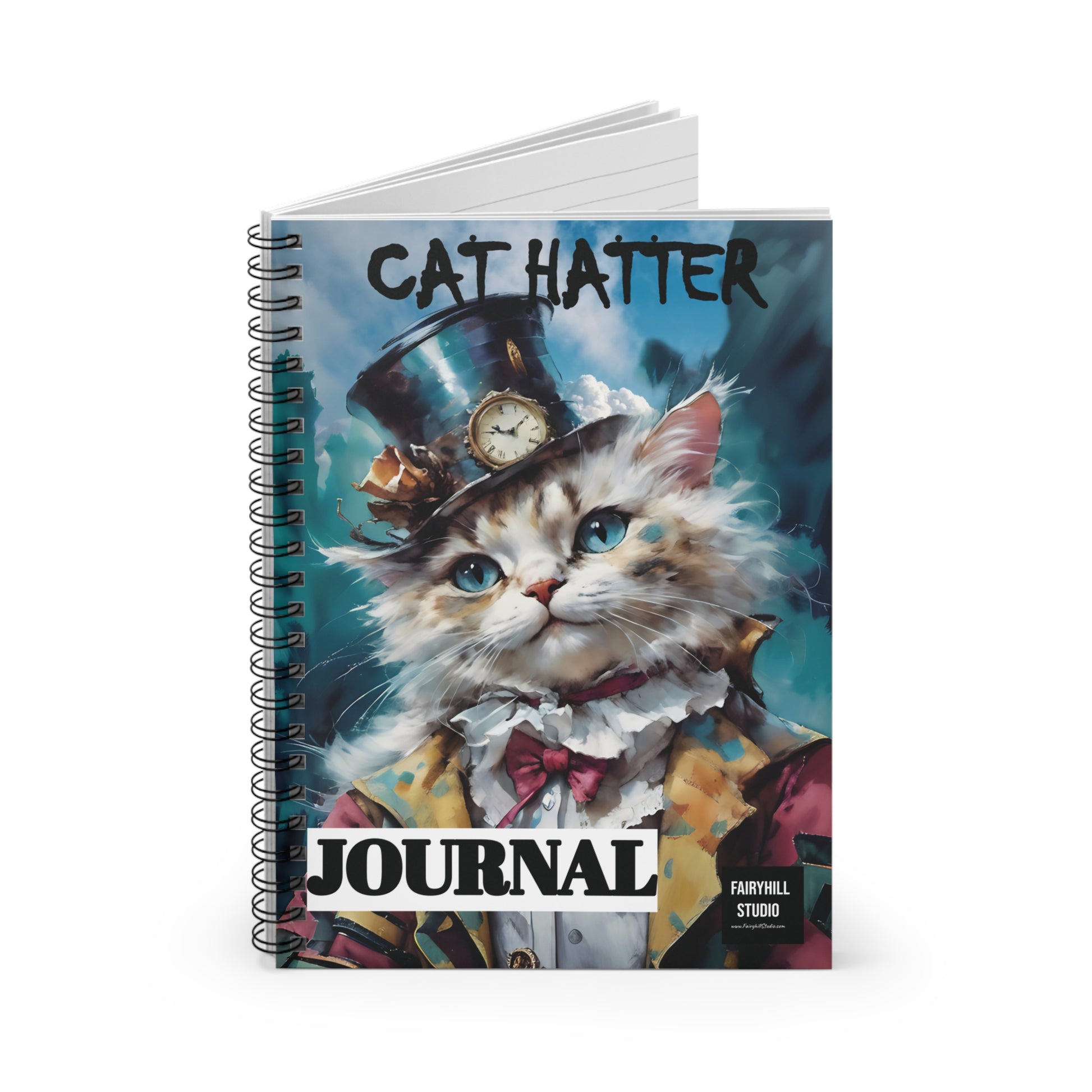 A ruled line journal featuring a Mad Hatter Style Cat with a top hat design, perfect for Alice in Wonderland lovers. This notebook is whimsical and charming, making it a great addition to any creative soul's collection. Ideal for journaling, note-taking, or doodling, this journal is a perfect gift for fans of the classic tale.