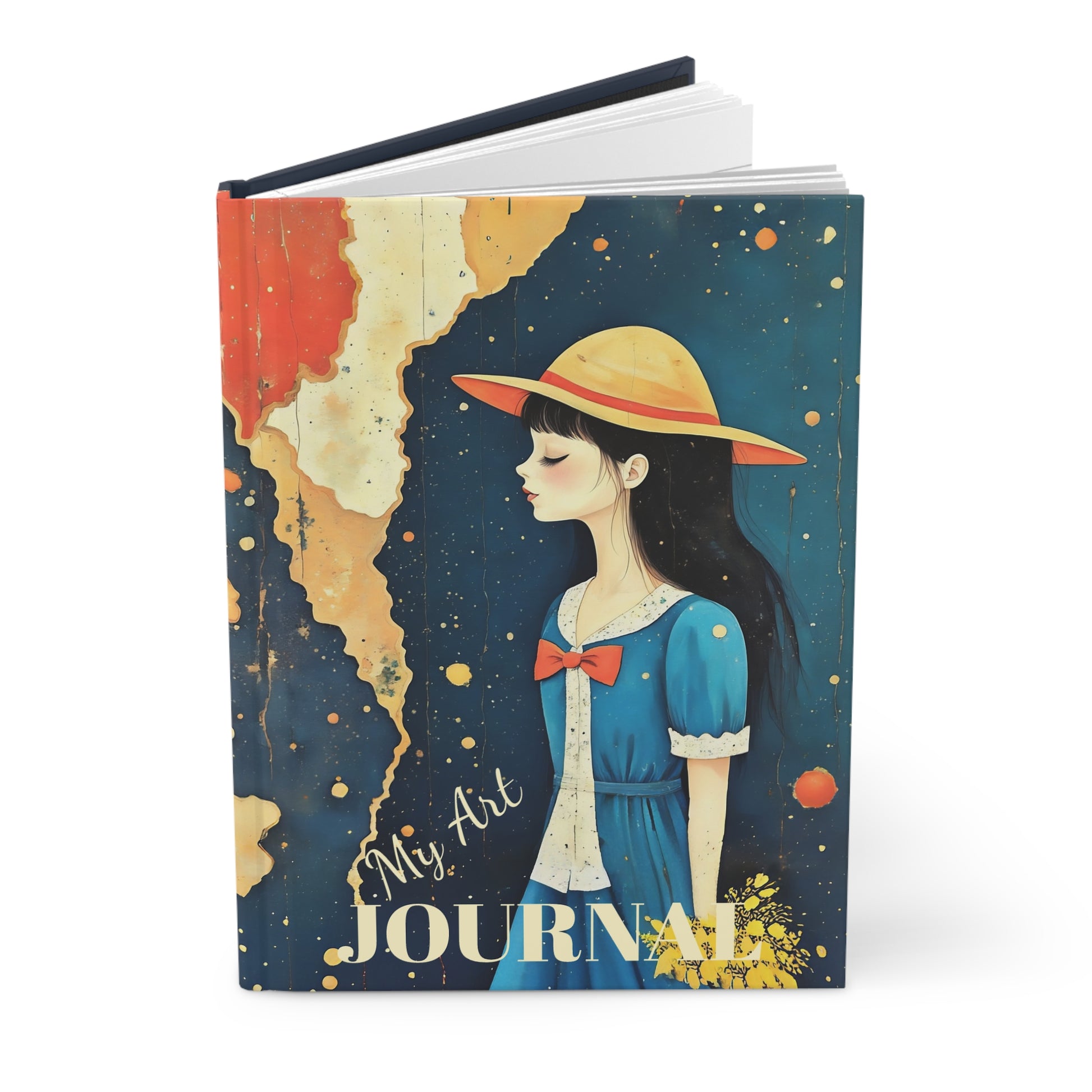 Hardcover Customized Girl with a yellow hat  art Mindful  Journal Hardcover Journal by fairyhill studio. This journal gives a whimsical and nature-inspired vibe, perfect for nature lovers, gardeners, and bee enthusiasts. Ideal for journaling, note-taking, or sketching. Great for gifting on birthdays, Mother's Day, or as a back-to-school gift.Madeline school girl art lovers.
