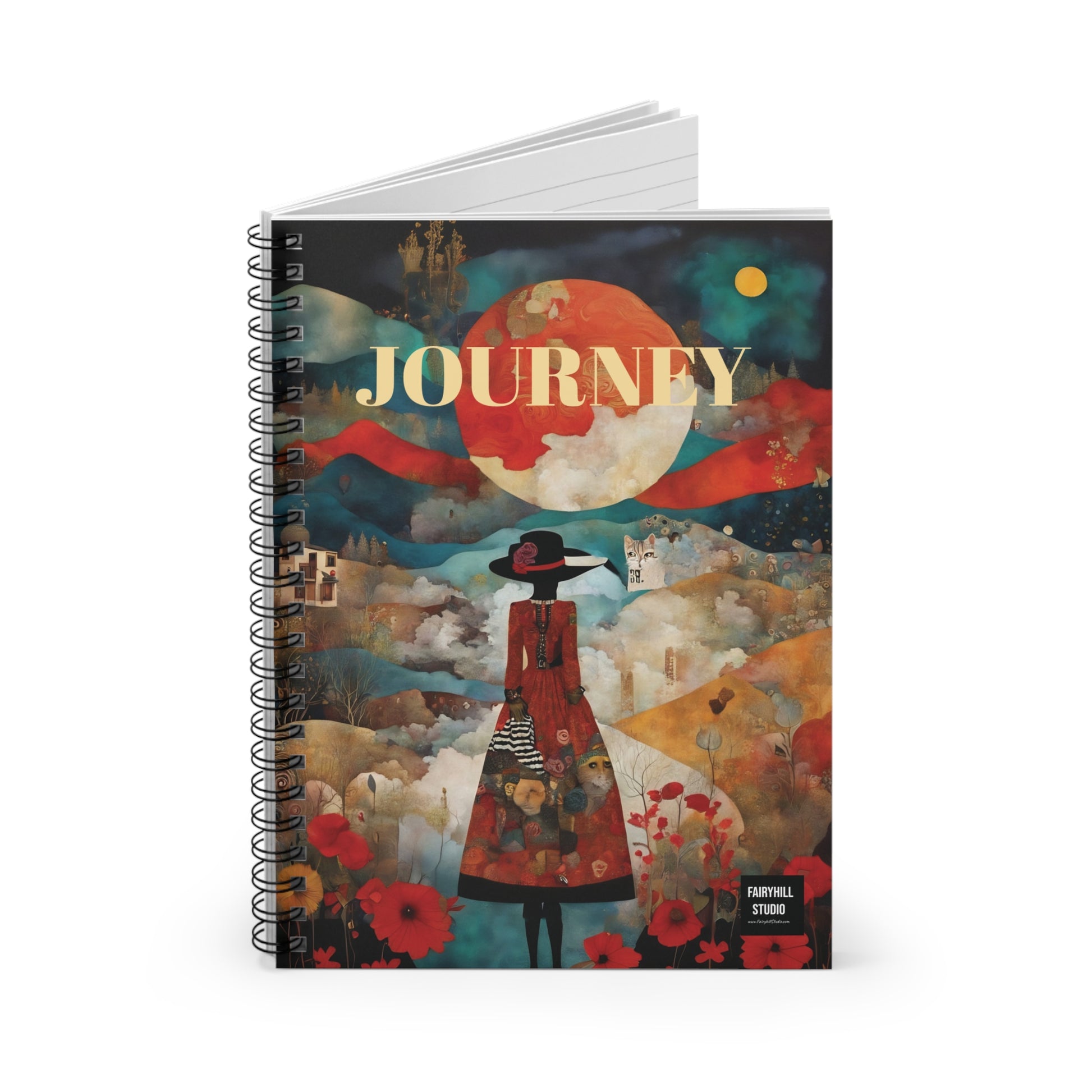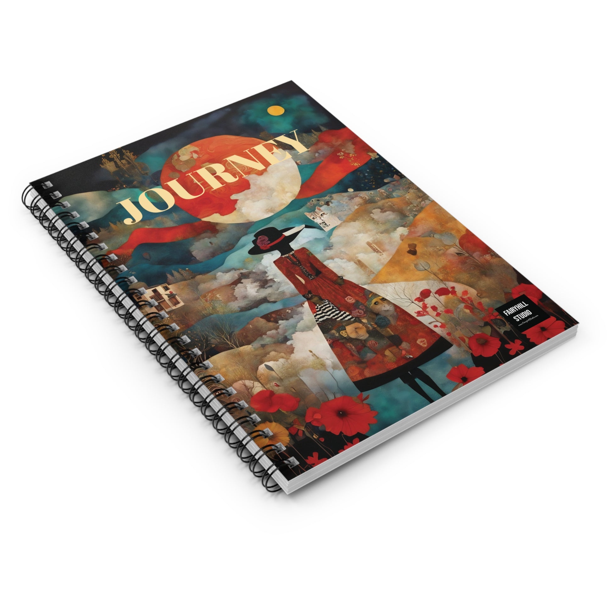 A Spiral Notebook journal featuring Moon and Poppies by Fairyhill studio, perfect for writing down thoughts and ideas. The ruled line pages provide structure while the metal spiral binding adds a fancy touch. This notebook is ideal for creative individuals looking to add a touch of whimsy to their everyday life. Perfect for students, artists, and music lovers. Great for back to school, birthdays, or as a thoughtful gift for any occasion.