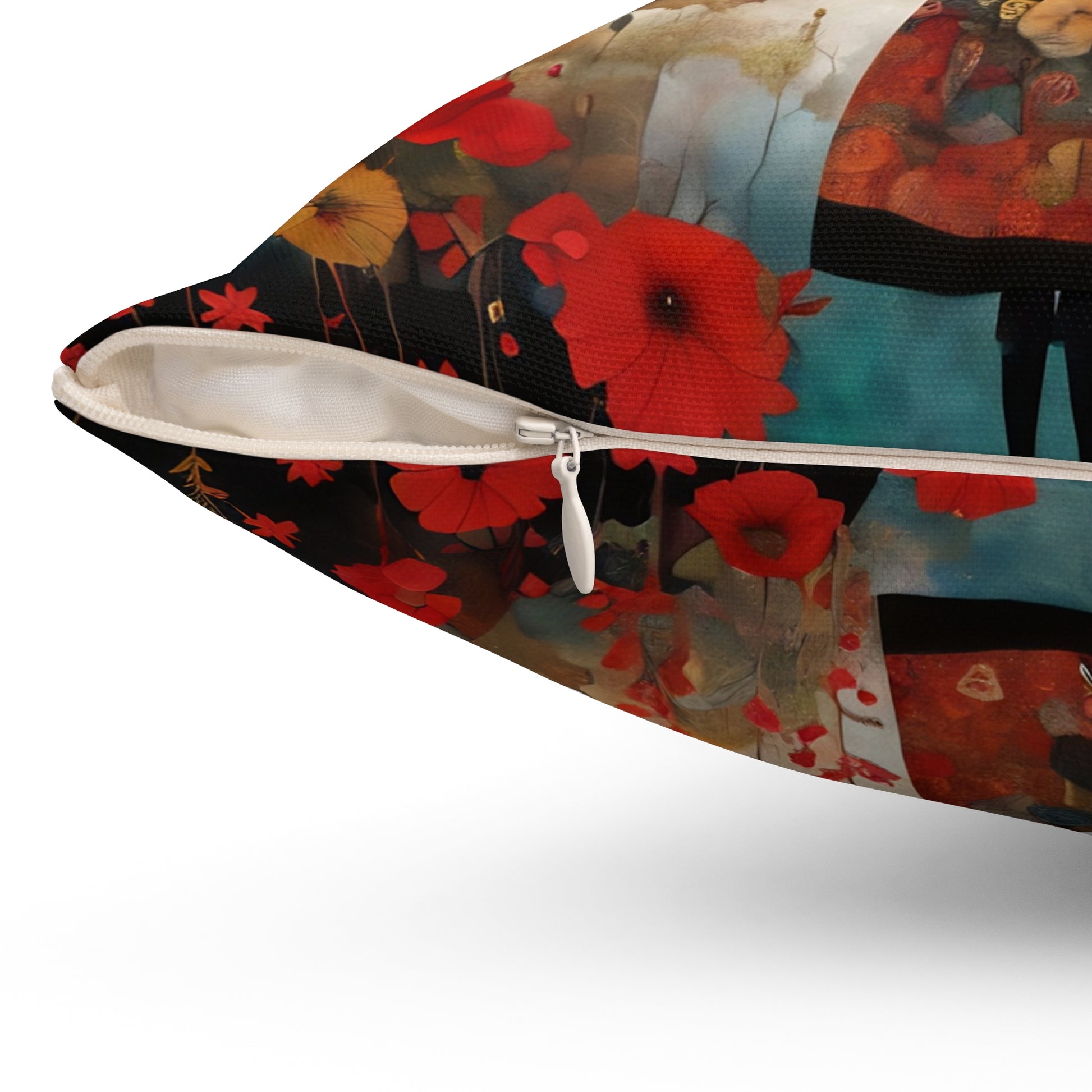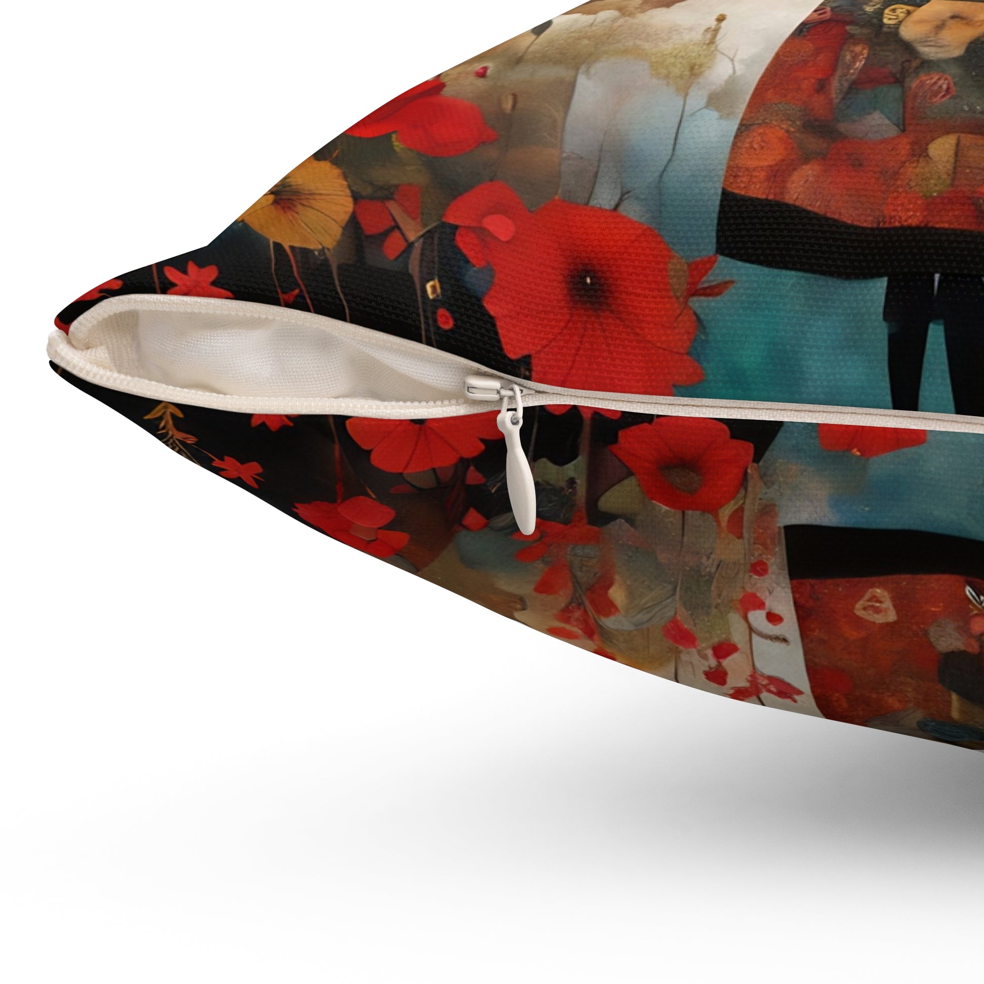 This double-sided printed Moon struck/Red poppies     Square Pillow   pillow features Madeline with yellow hat   Square Pillow by fairyhill studio, giving off a whimsical and charming vibe. Perfect for Madeline book art lovers lovers and those who enjoy a touch of whimsy in their decor. Ideal for spring and summer home decor, garden parties, and bee-themed celebrations.