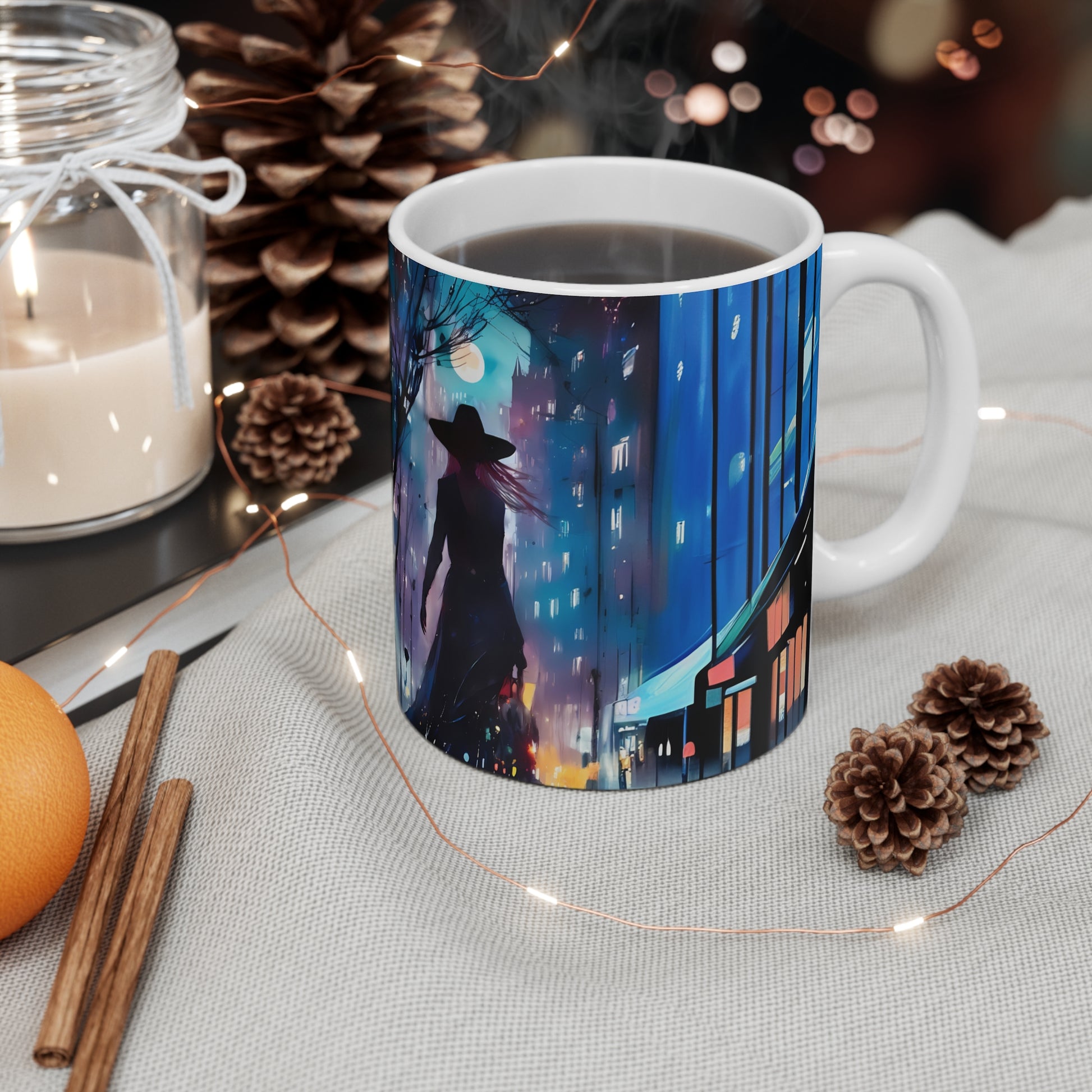 Elegant and witchy mug featuring a city life night shopping scene with a sophisticated woman. Perfect for those who love a touch of magic in their daily routine. Ideal for Halloween, spooky season, or witchy vibes enthusiasts.