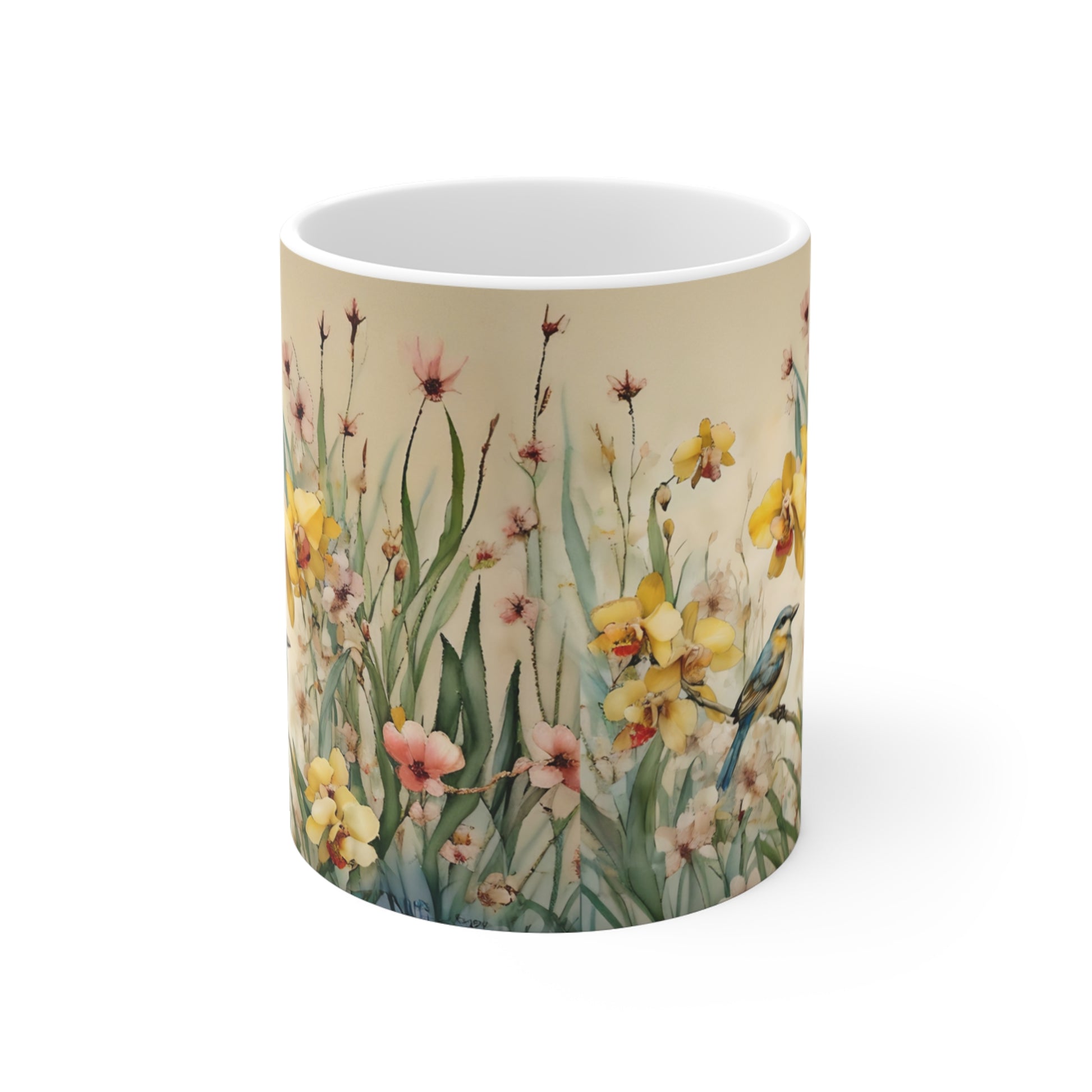 A charming 11oz ceramic mug featuring a blue bird nestled in a field of yellow wildflowers, designed by Fairyhill studio. The serene design brings a touch of nature and tranquility to your morning coffee routine. Perfect for bird lovers and nature enthusiasts. Ideal gift for birthdays, Mother's Day, or as a thoughtful gesture to show appreciation.