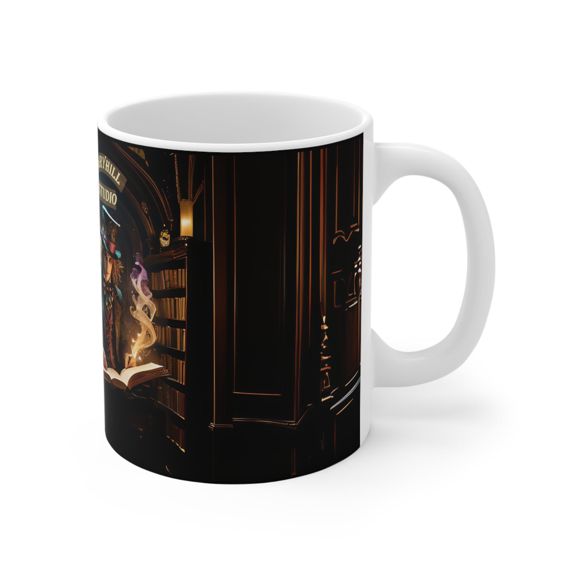 A cheerful 11oz mug featuring a whimsical art by Fairyhill studio of a mad hatter-like character in a library, radiating good vibes. Perfect for coffee or tea lovers looking for a unique and artistic touch to their morning routine. Ideal gift for bookworms, artists, and fans of Alice in Wonderland. Great for birthdays, Christmas, and literary-themed celebrations.