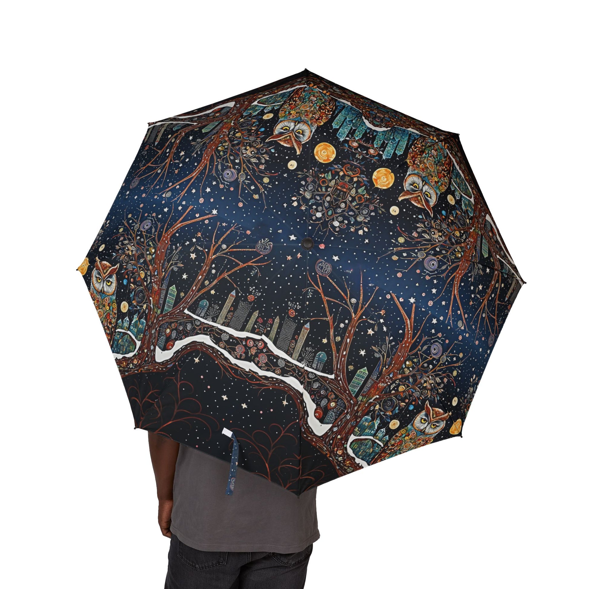 Introducing a stylish and functional semi-automatic foldable umbrella that elevates your rainy day experience. With its artistic design featuring whimsical owls and a serene nighttime backdrop, this umbrella brings a touch of enchantment to every gloom-filled day. It offers effortless one-handed operation, making it easy to stay dry without fumbling. Perfect for busy individuals, this umbrella is ideal for commuting, outdoor events, or leisurely strolls in the park. A must-have for nature lovers, owl enthusiasts, or anyone looking to express their unique style, it makes a thoughtful gift for birthdays or holidays. Embrace the beauty of rainy days with a pop of color and character!