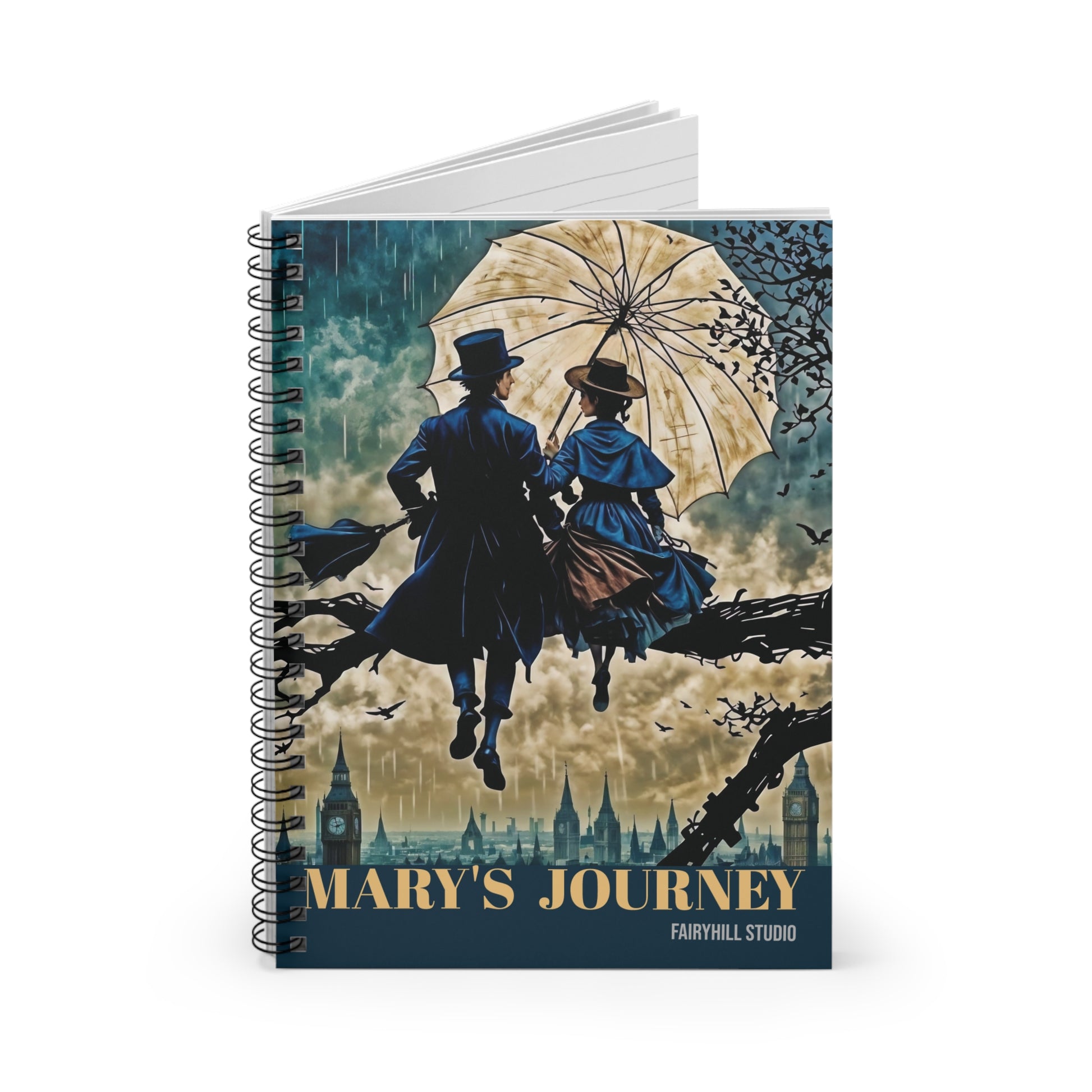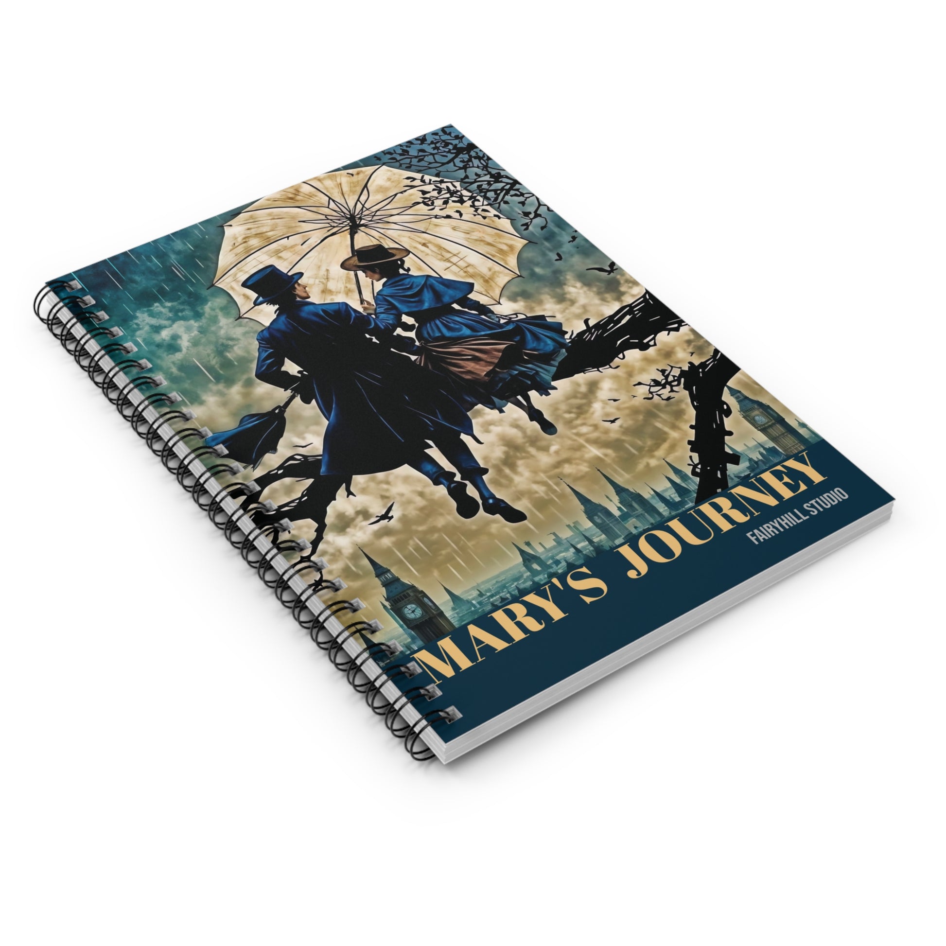 Personalized spiral notebook featuring a young couple watching the London city under rain with an umbrella design by fairyhill studio. Perfect for those who love romantic and whimsical vibes. Ideal for journaling, taking notes, or sketching. Great for gifting on Valentine's Day, birthdays, or anniversaries.