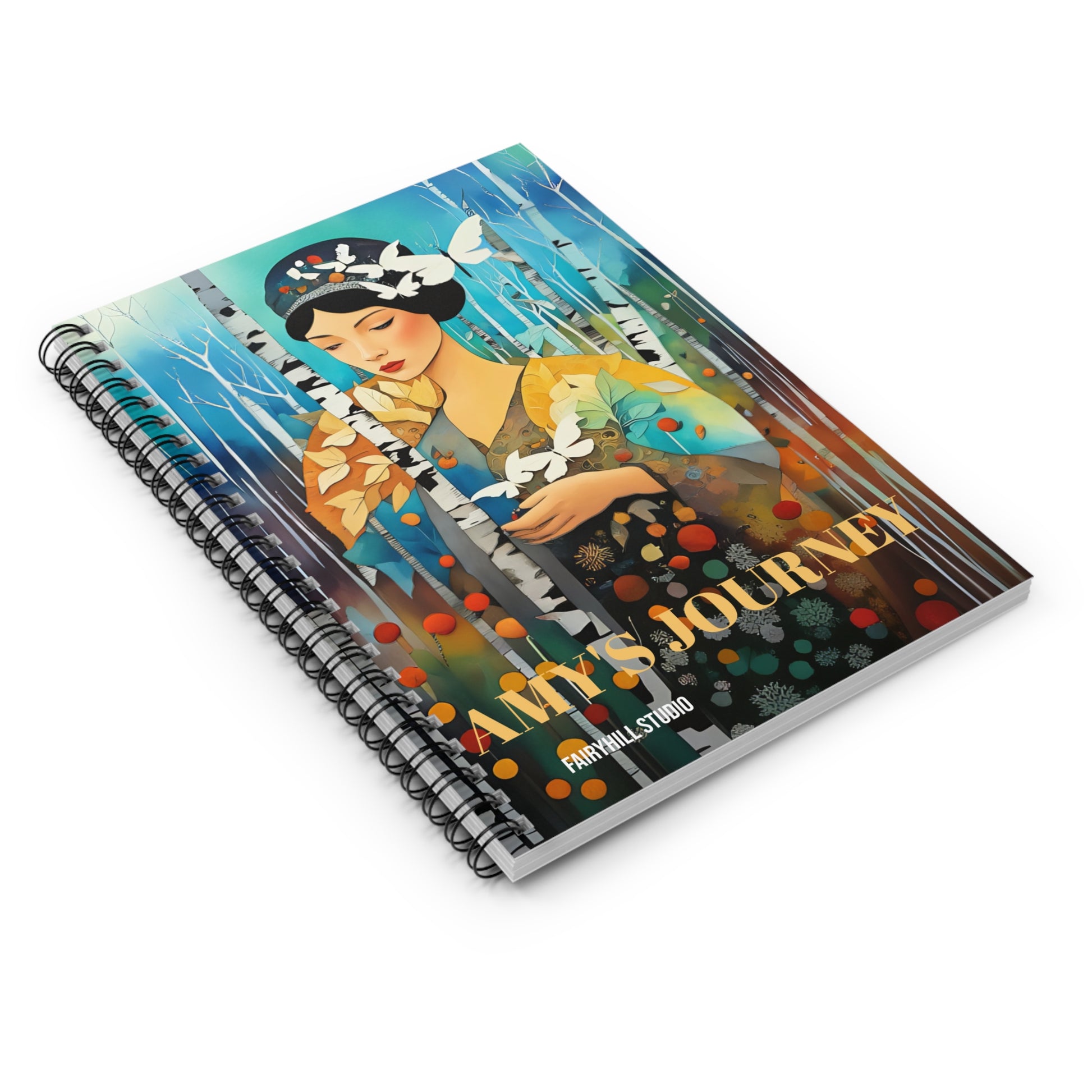 Colorful and whimsical spiral notebook featuring a girl with butterflies in a birch tree forest design. Perfect for journaling, note-taking, and planning. Ideal for nature lovers and those who appreciate personalized gifts. Great for birthdays, holidays, and special occasions.