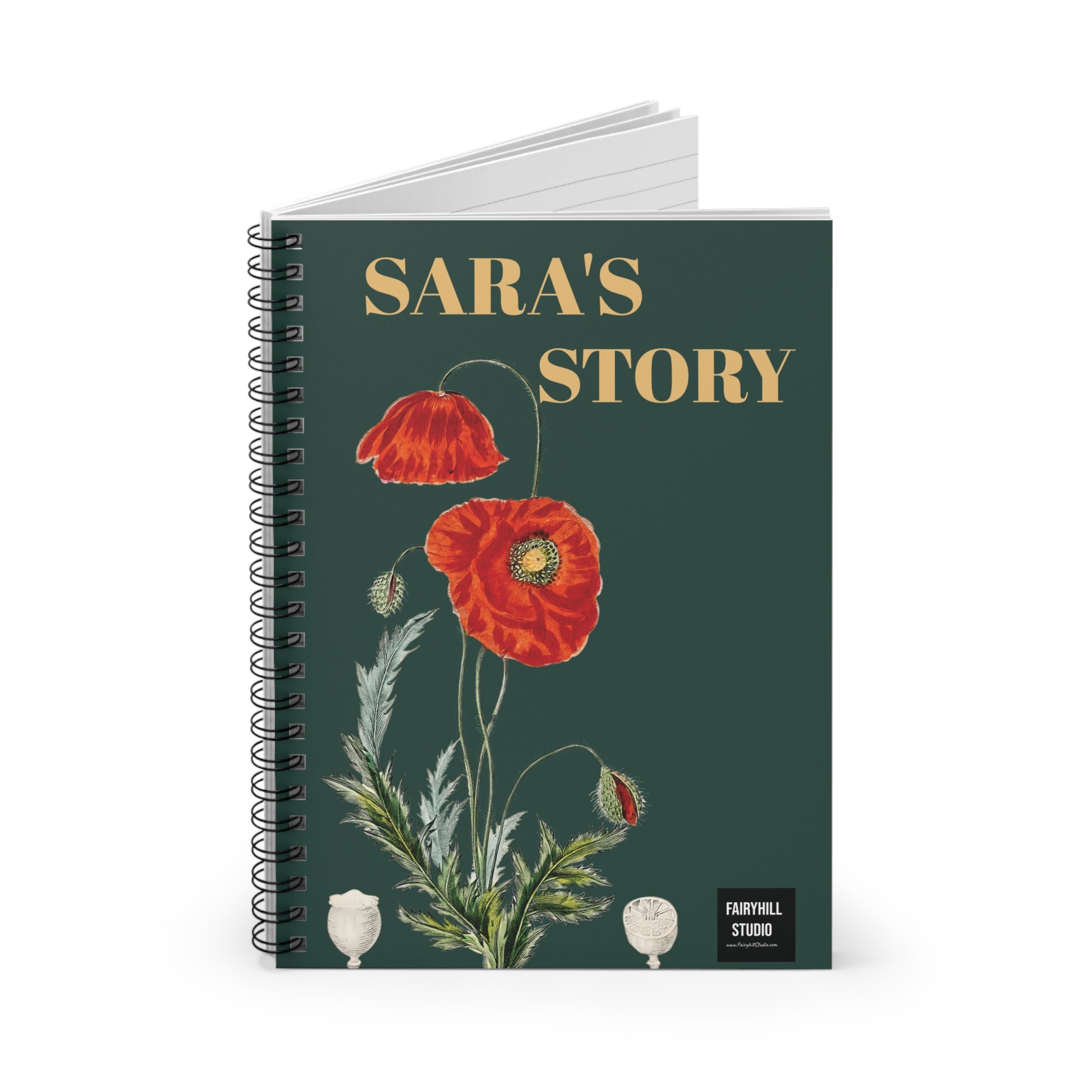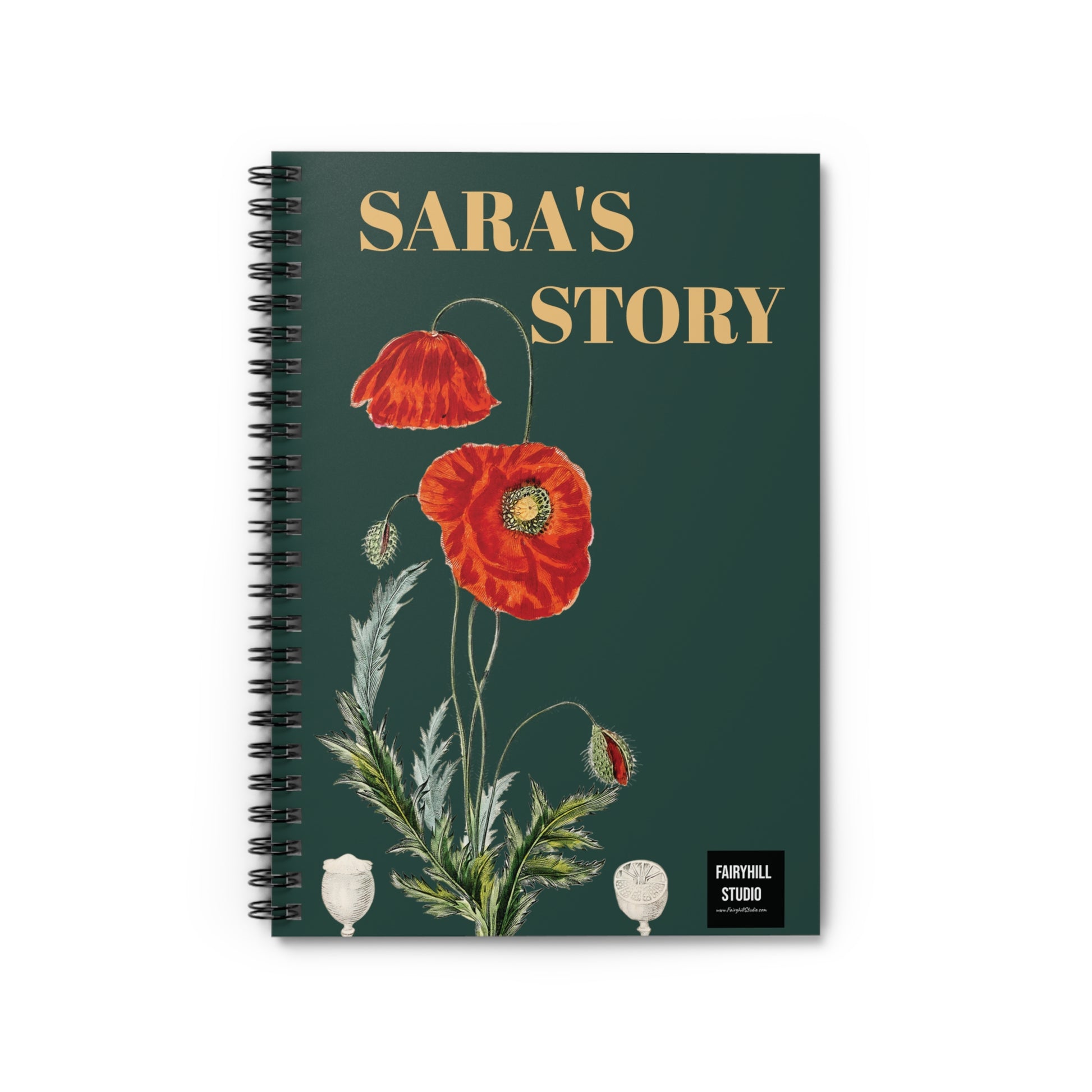 A personalized Spiral Notebook with Red Poppies art on a green background by fairyhill studio. This notebook is perfect for writing, with 118 ruled line pages and a document pocket for added storage. The metal spiral binding gives it a fancy look and makes removing pages easy. The design gives off a whimsical and artistic vibe, making it ideal for nature lovers and creative individuals. It is relevant for gifting on birthdays, holidays, and special occasions.