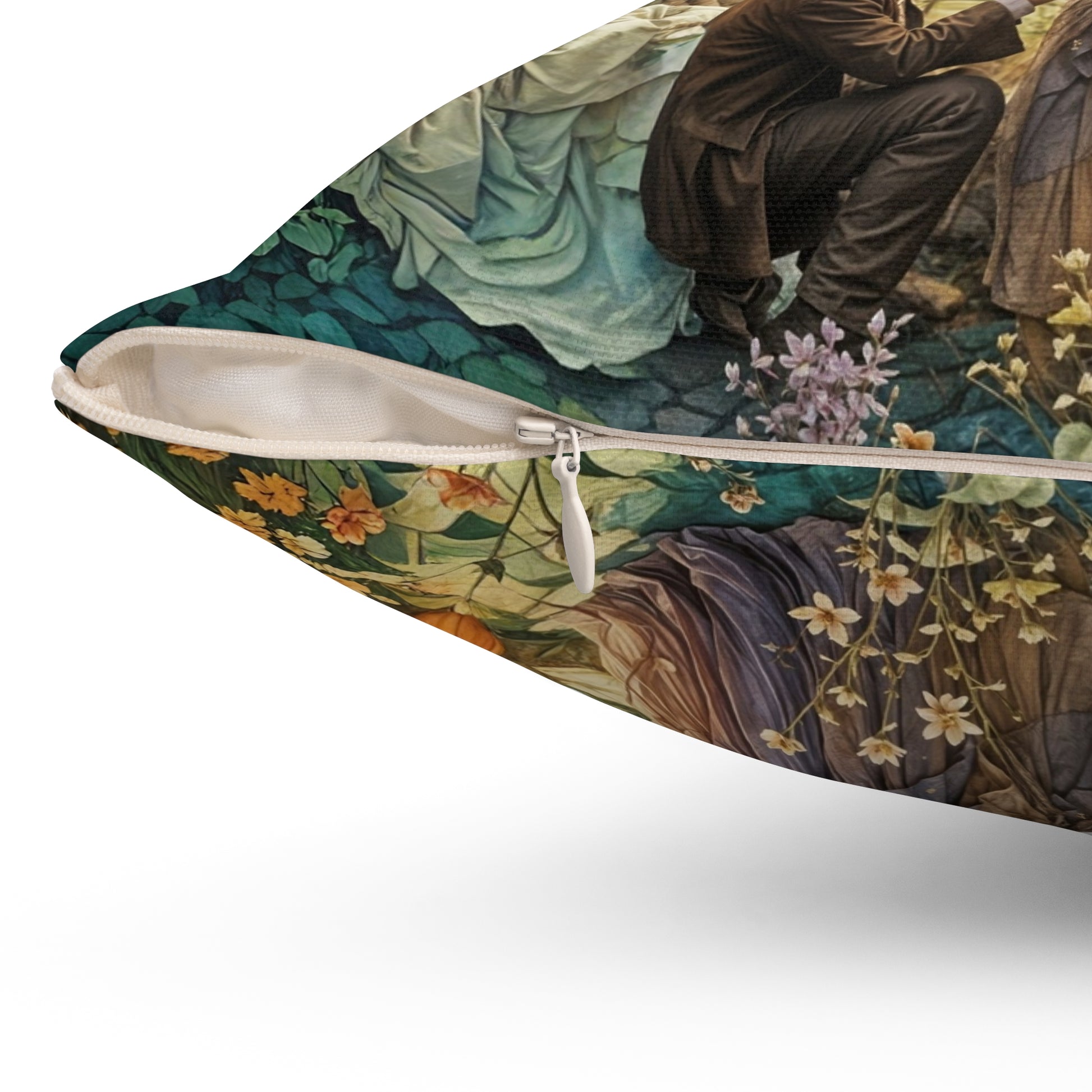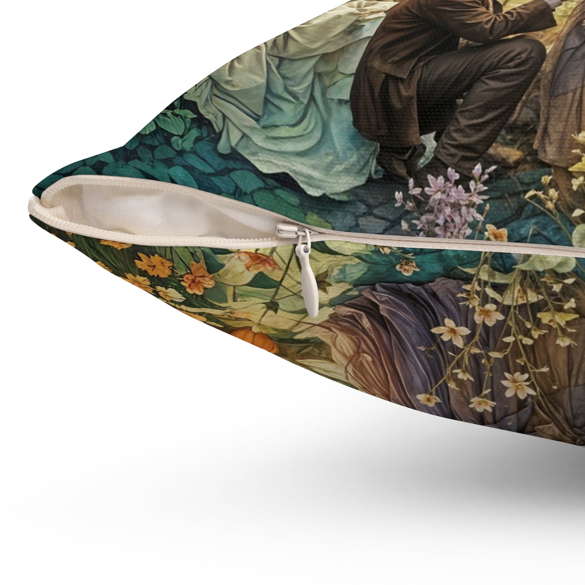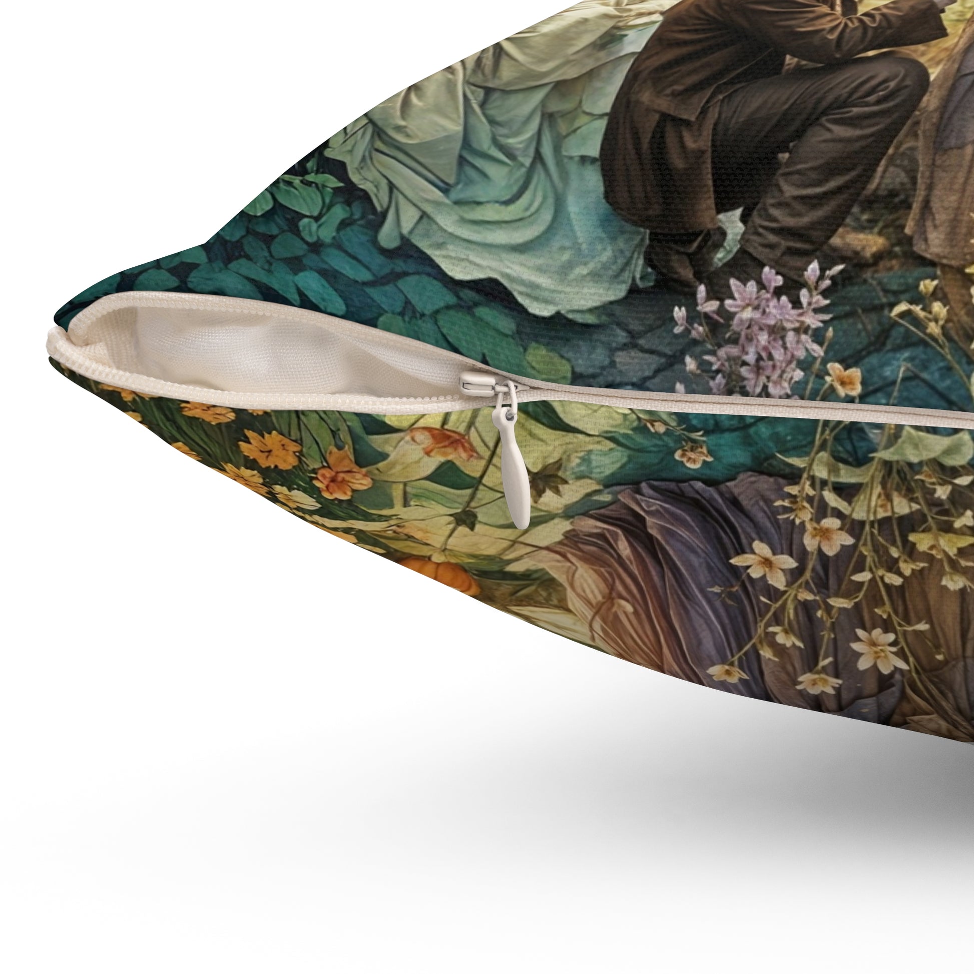 A whimsical Spun Polyester Pillow featuring artwork of a young guy proposing to a Princess in Fairytale land. This pillow adds a touch of magic to a room and is perfect for fairy tale lovers or those looking for a unique home decor piece. Ideal for romantic occasions, Valentine's Day, or as a gift for dreamers.