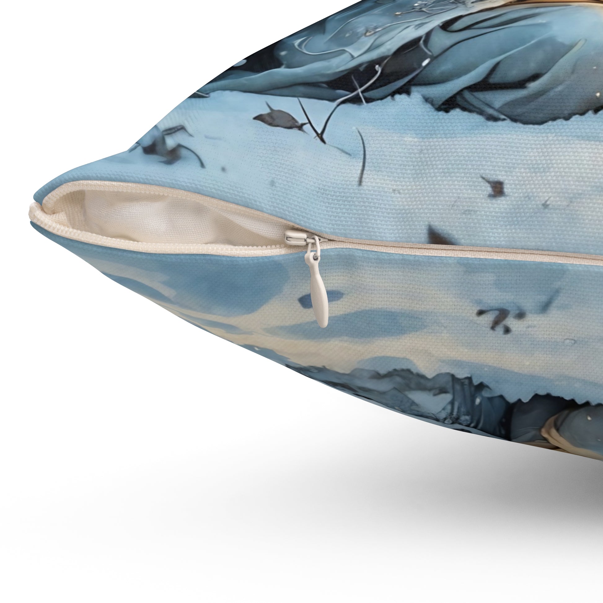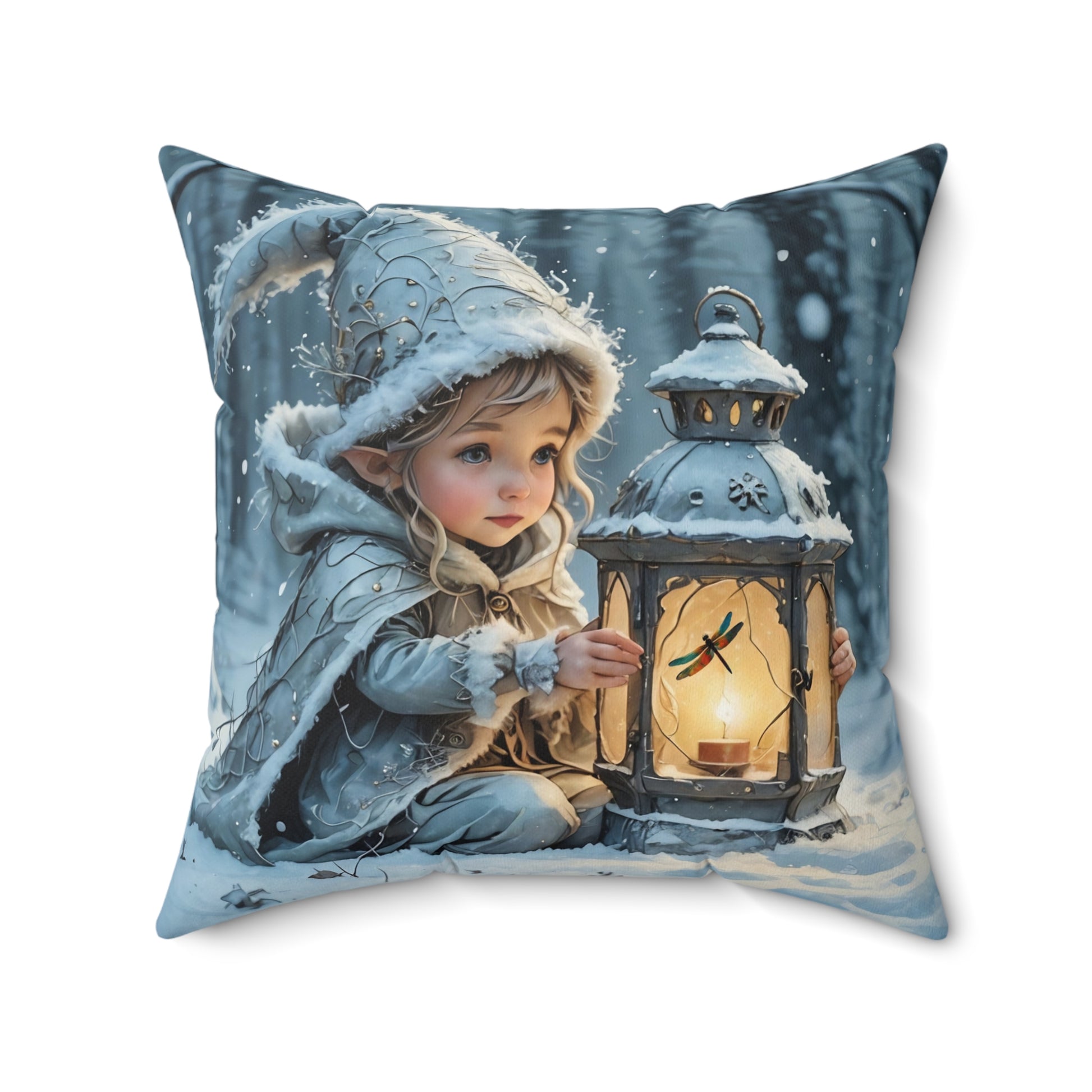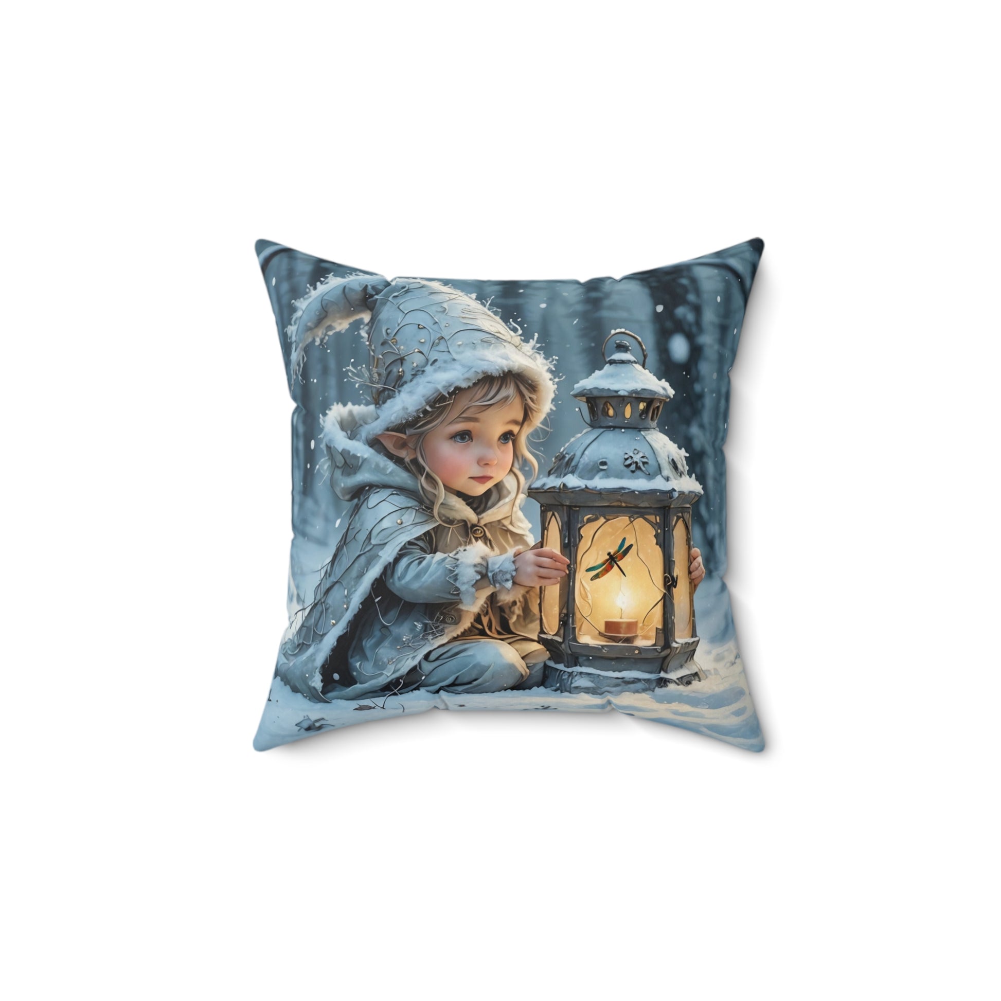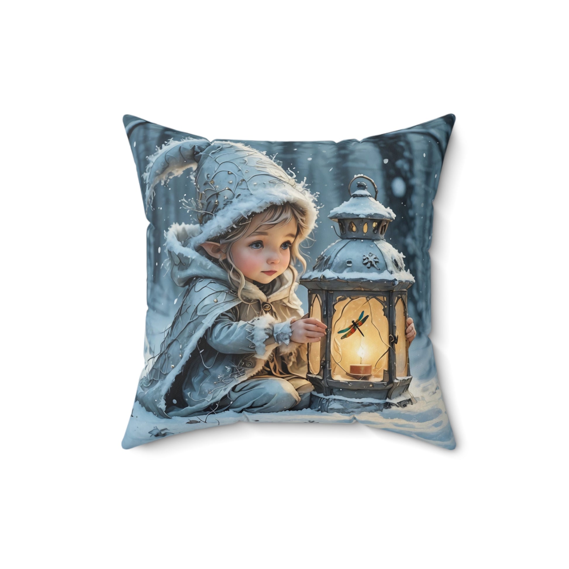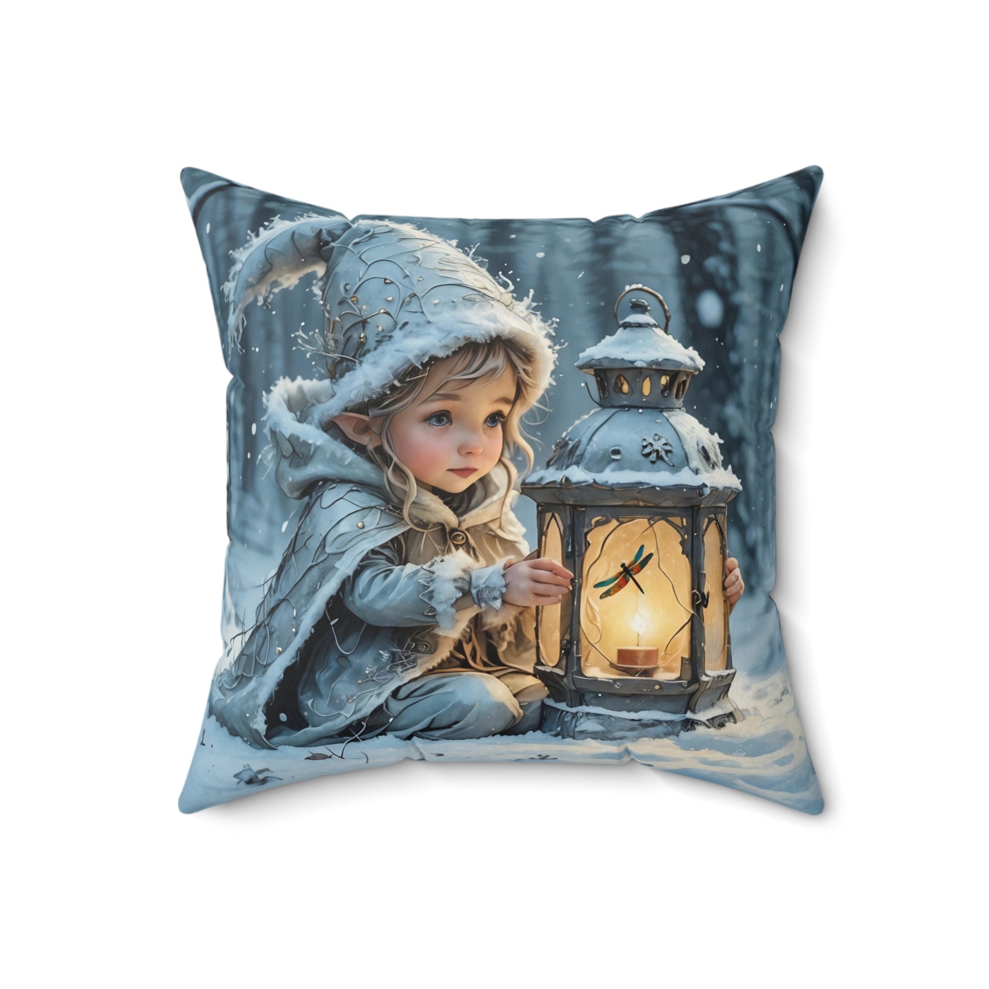 A magical holiday Pillow featuring a cute elf with a dragonfly lantern in winter snow. Perfect for adding a whimsical touch to your home decor during the holiday season. Ideal for fairy tale lovers and those who appreciate fantasy art. Great for Christmas, winter celebrations, and magical-themed events.