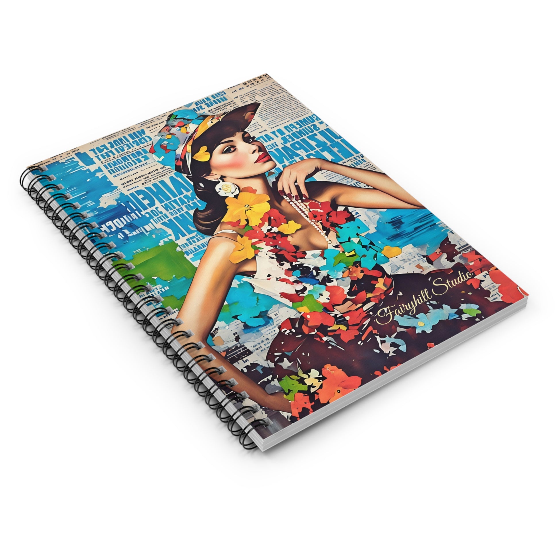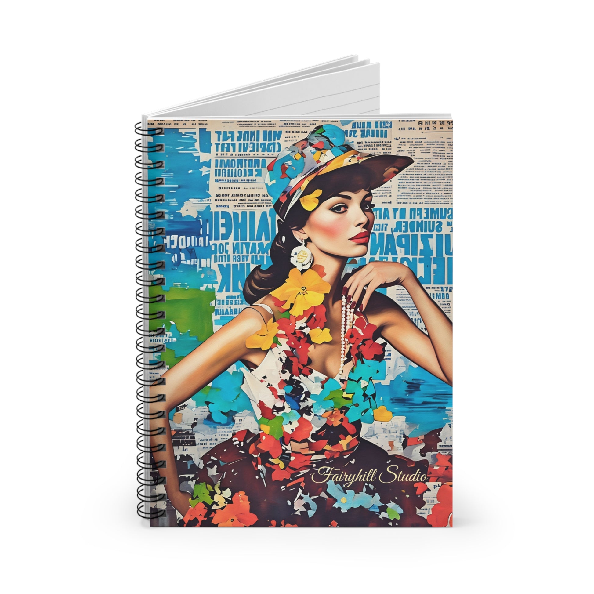 Fashion Model Collage art journal with ruled lines, perfect for writing and sketching. Gives a fancy and stylish vibe, fitting into a fashionista's life. Relevant for back to school, journaling, and creative writing enthusiasts.