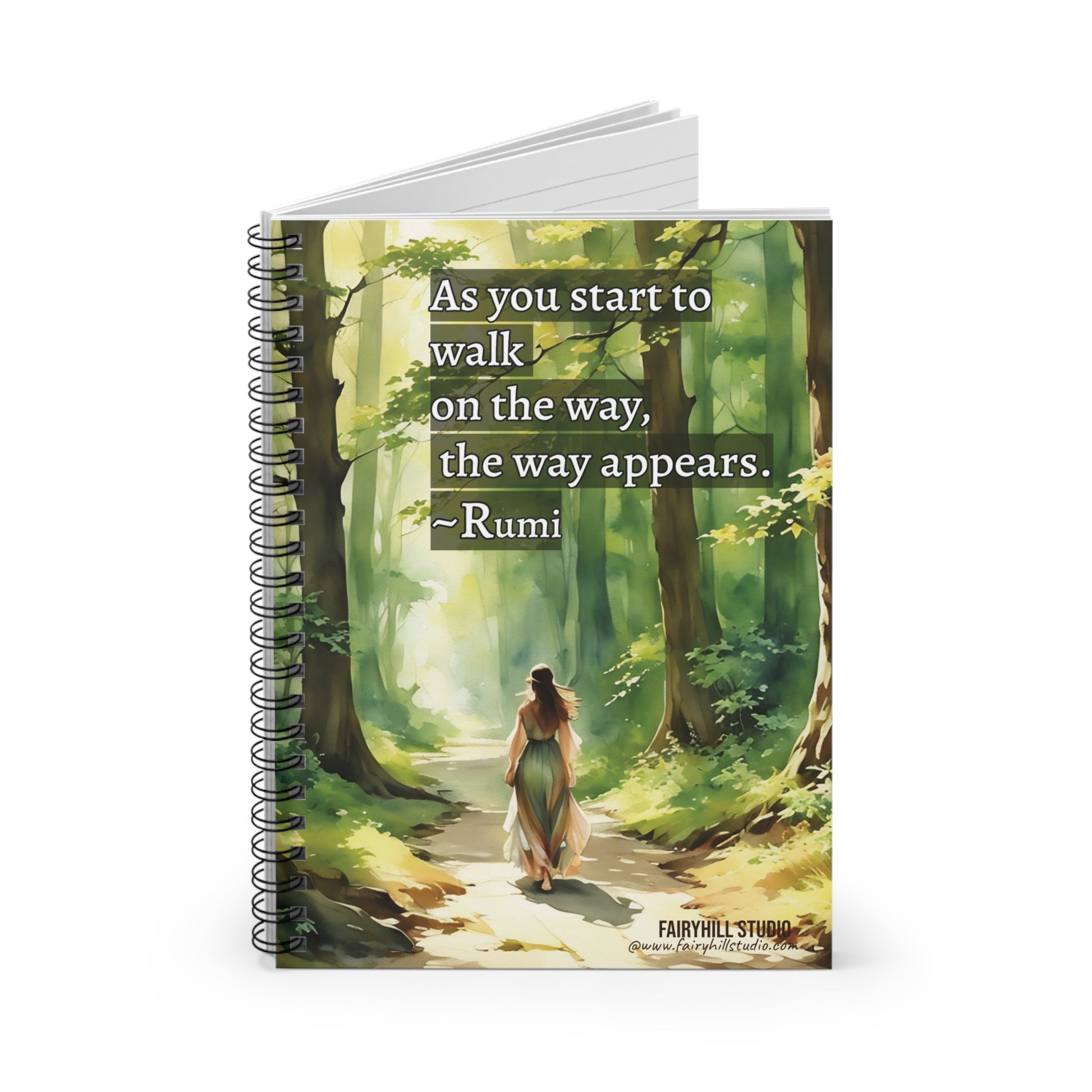 Personalized ruled line spiral notebook with a Rumi quote on the cover. Perfect for writing and reflection, giving a fancy look with a metal spiral binding and a document pocket for added storage. Ideal for journaling and note-taking.