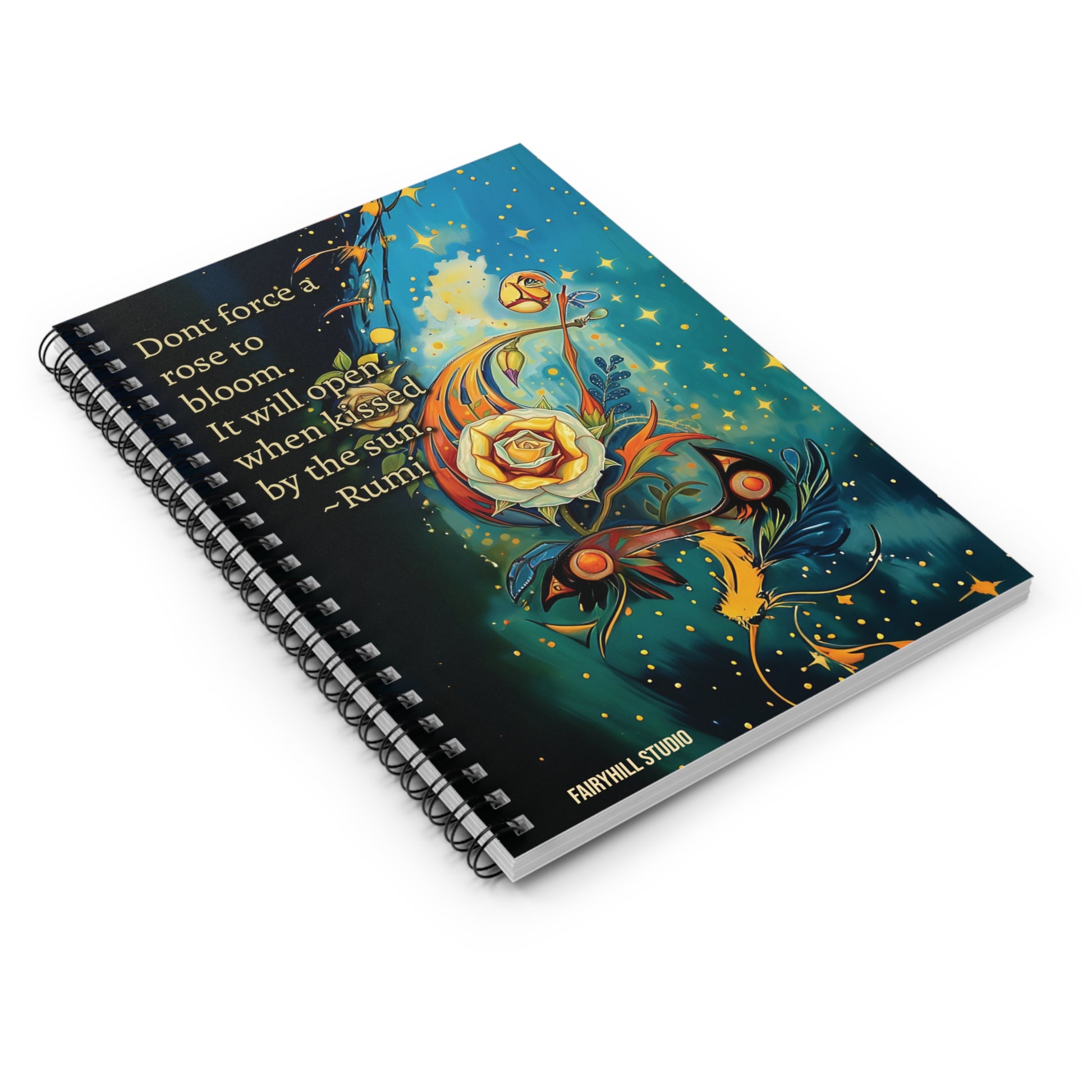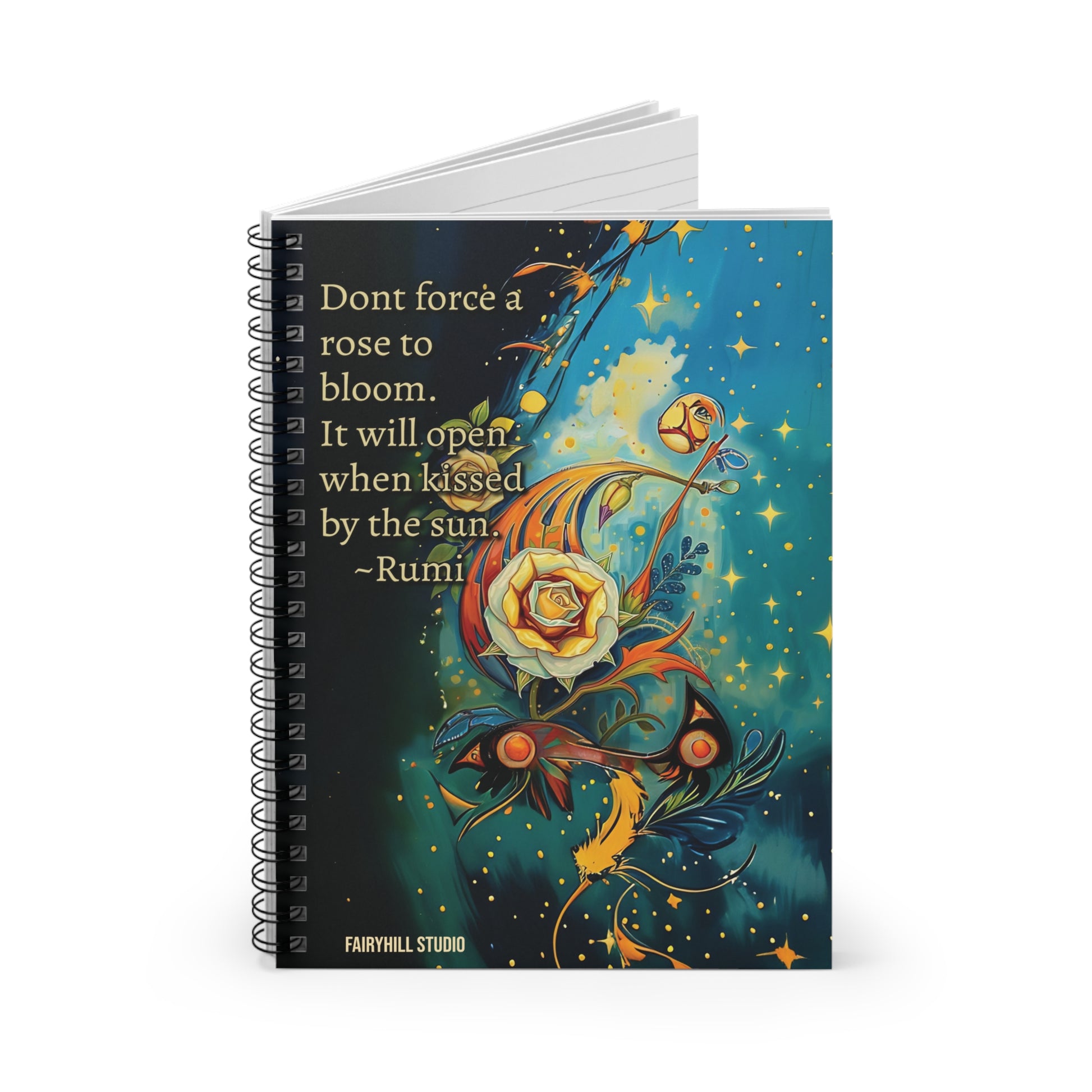 This ruled line spiral notebook features a beautiful Rumi quote art by fairyhill studio. The paper is perfect for writing and the metal spiral gives it a fancy look. With a document pocket for added storage, this notebook is ideal for those who appreciate thoughtful quotes and elegant design. Perfect for journaling, note-taking, or as a thoughtful gift for a creative soul.