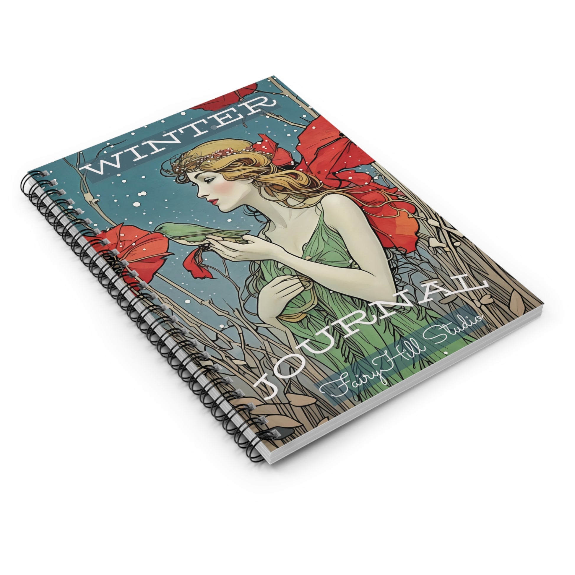 Spiral Notebook a girl in winter Poinsettas with a green bird /FairyHill Studio Journal Ruled Line Journal