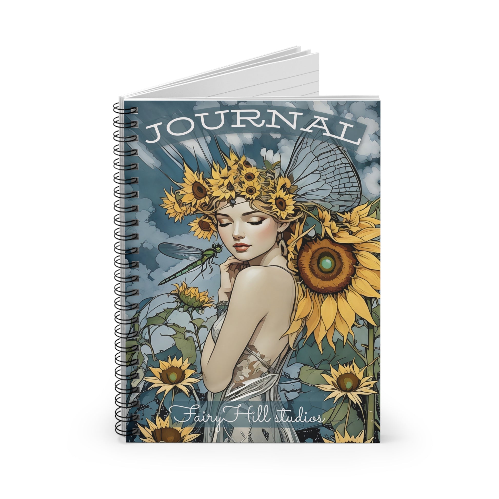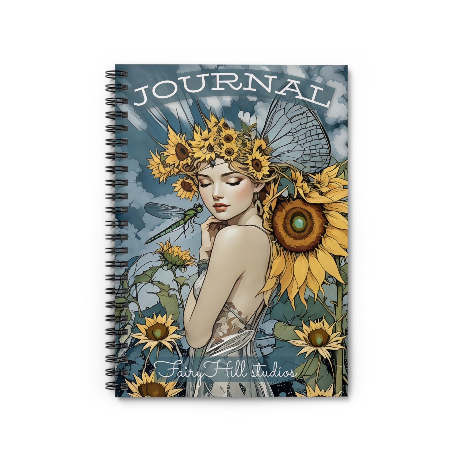This Notebook features a Sunflower Girl Art illustration with a lovely girl and a dragonfly surrounded by sunflowers, creating a whimsical and artistic vibe. Perfect for journaling, note-taking, or sketching, this notebook is ideal for art enthusiasts and nature lovers. It is relevant for occasions like back to school, birthdays, or as a thoughtful gift for a creative individual.