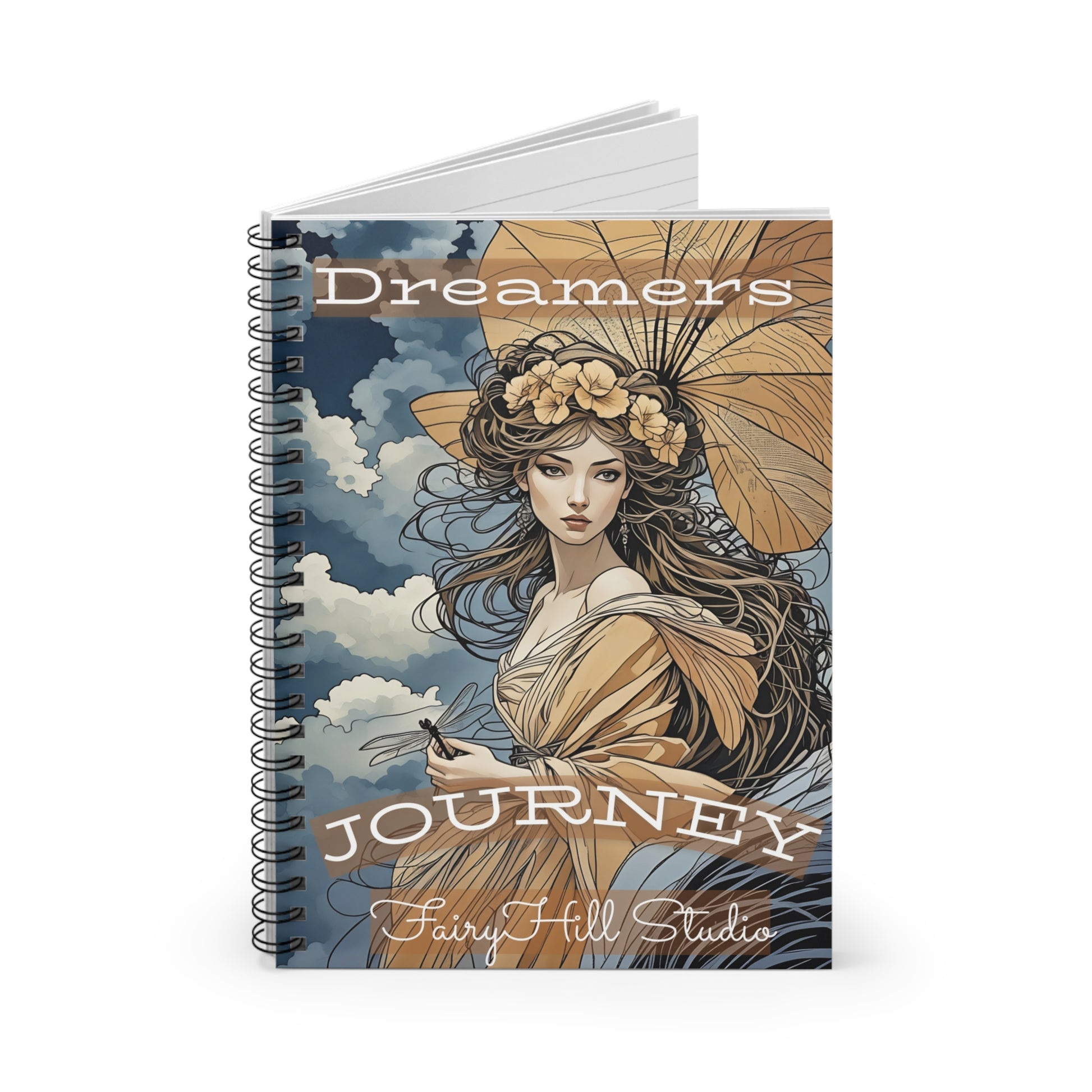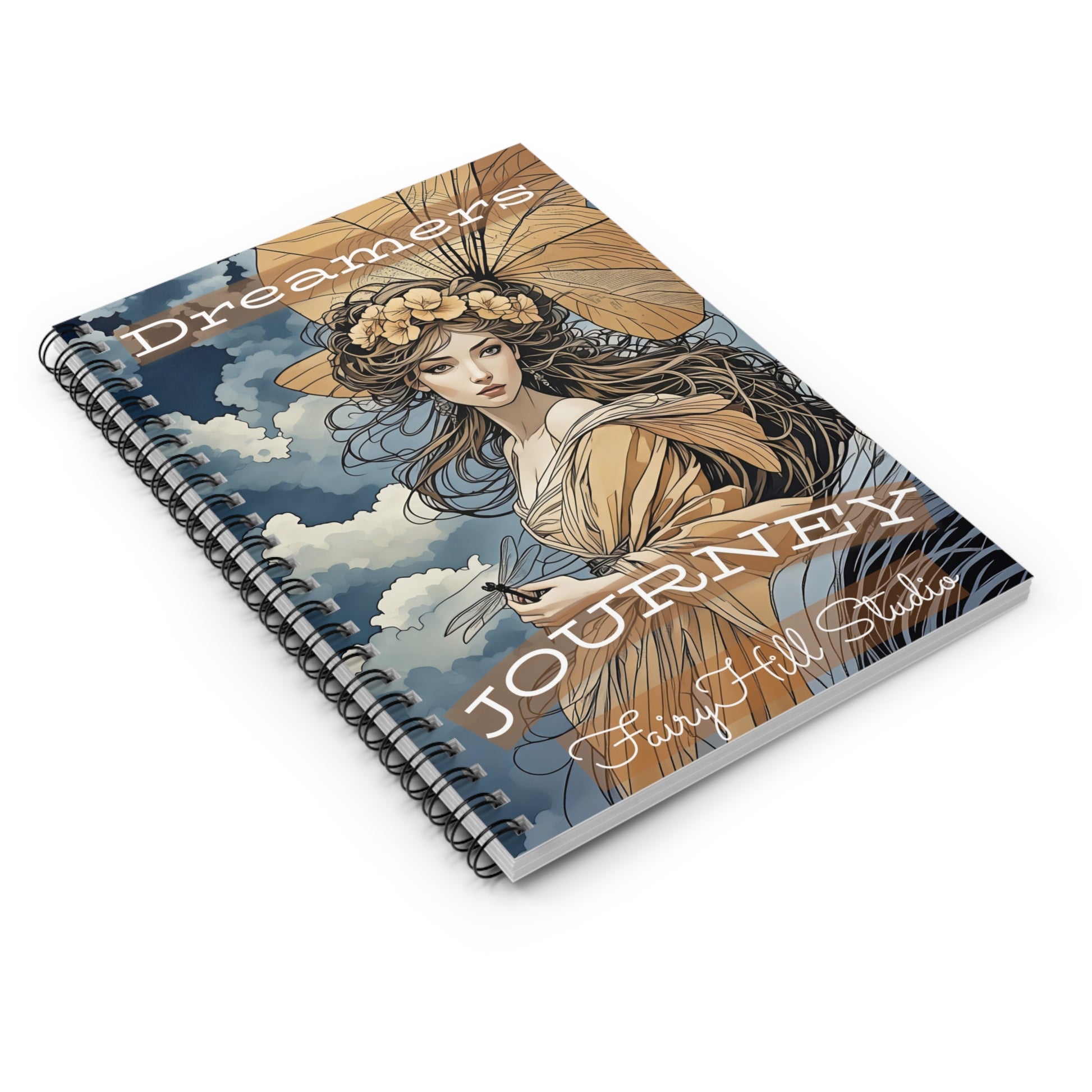 A charming My Art Journal /Dreamers Journey spiral notebook featuring a lovely girl with a dragonfly art illustration in peach pastel tones by Fairyhill studio. Perfect for writers and dreamers, this notebook is ideal for jotting down thoughts, ideas, and inspirations. Great for artists, students, and anyone who loves whimsical designs. A wonderful gift for birthdays, holidays, and special occasions.