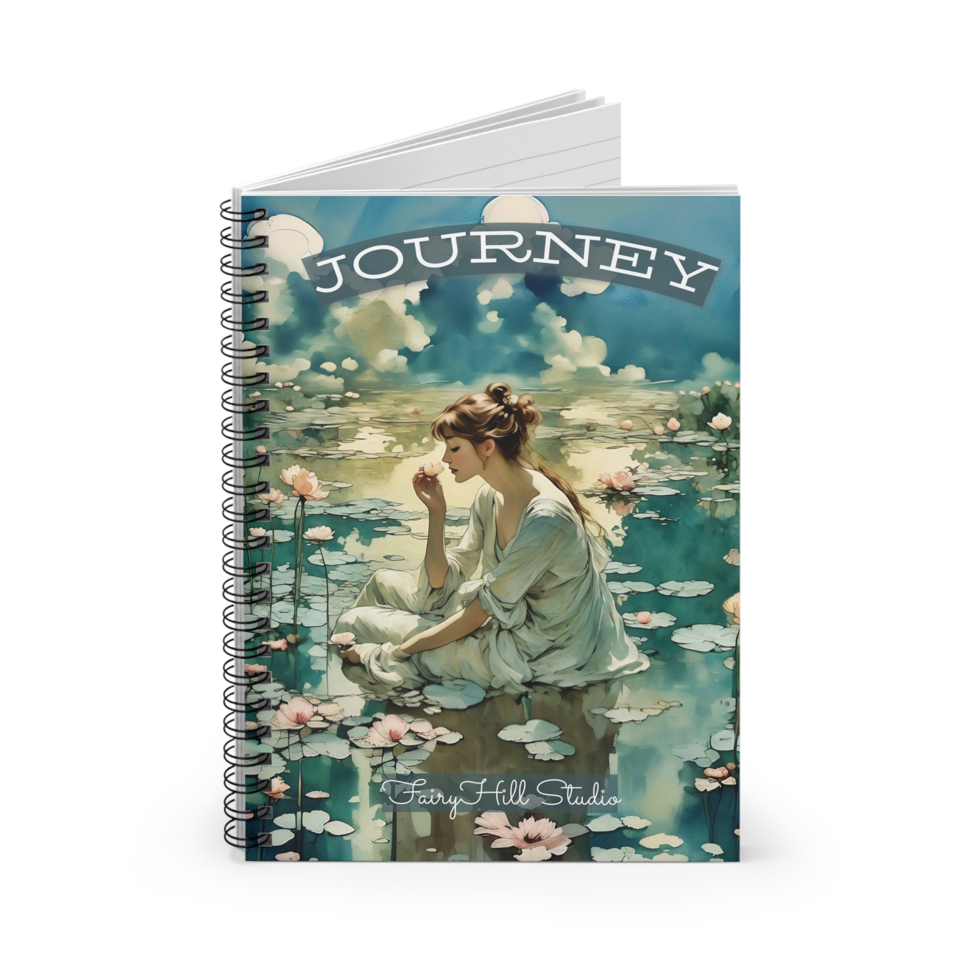 A beautifully designed spiral notebook featuring a girl sitting in a lotus flower lake, perfect for journaling and art lovers. The notebook is ideal for travel journeys and would make a great gift for those who enjoy writing and sketching. Relevant for occasions like birthdays, holidays, and special celebrations.