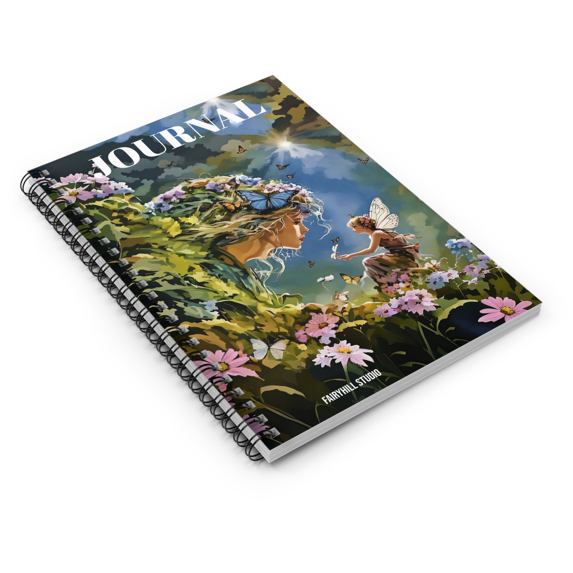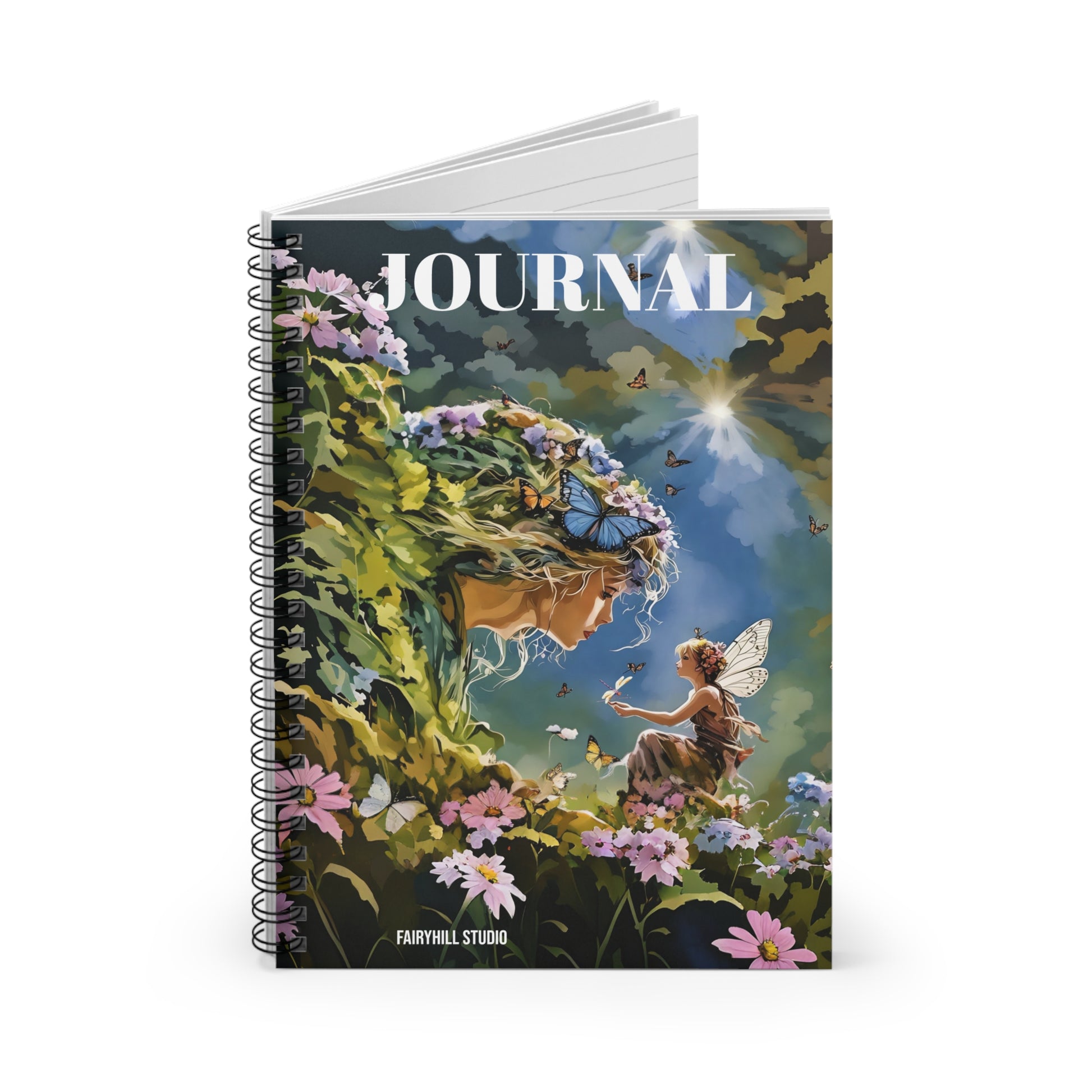 A magical spiral notebook featuring a small nature fairy offering gifts to the Nature Fairy Tree/Goddess for thanks and appreciation. With 118 ruled line pages, metal spiral binding, and a document pocket, this notebook is perfect for those who love nature and whimsical designs. Ideal for journaling, note-taking, or sketching, this notebook brings a sense of enchantment to your everyday life. Perfect for nature lovers, fantasy enthusiasts, and those who appreciate mystical and magical themes. Great for birthdays, holidays, and special occasions.
