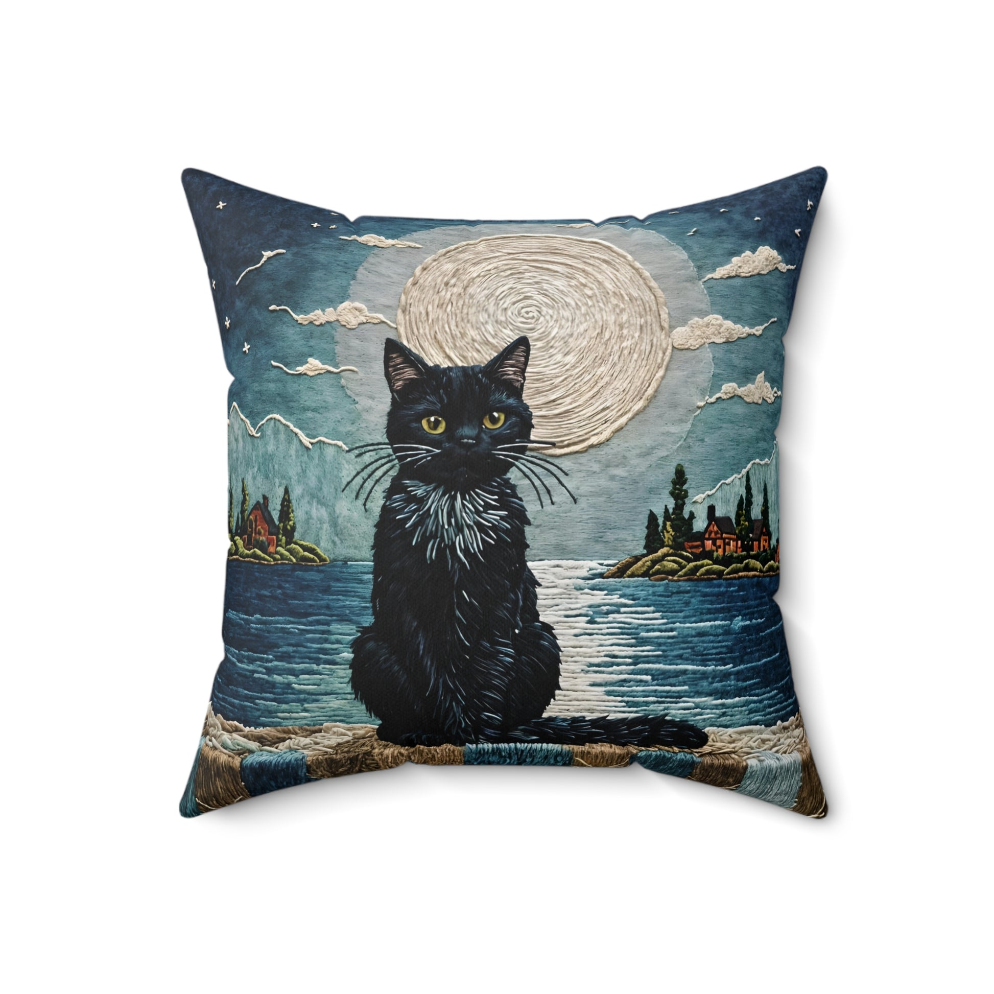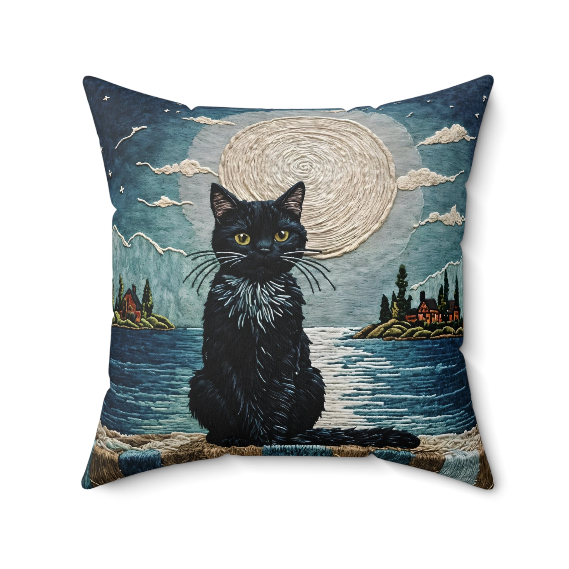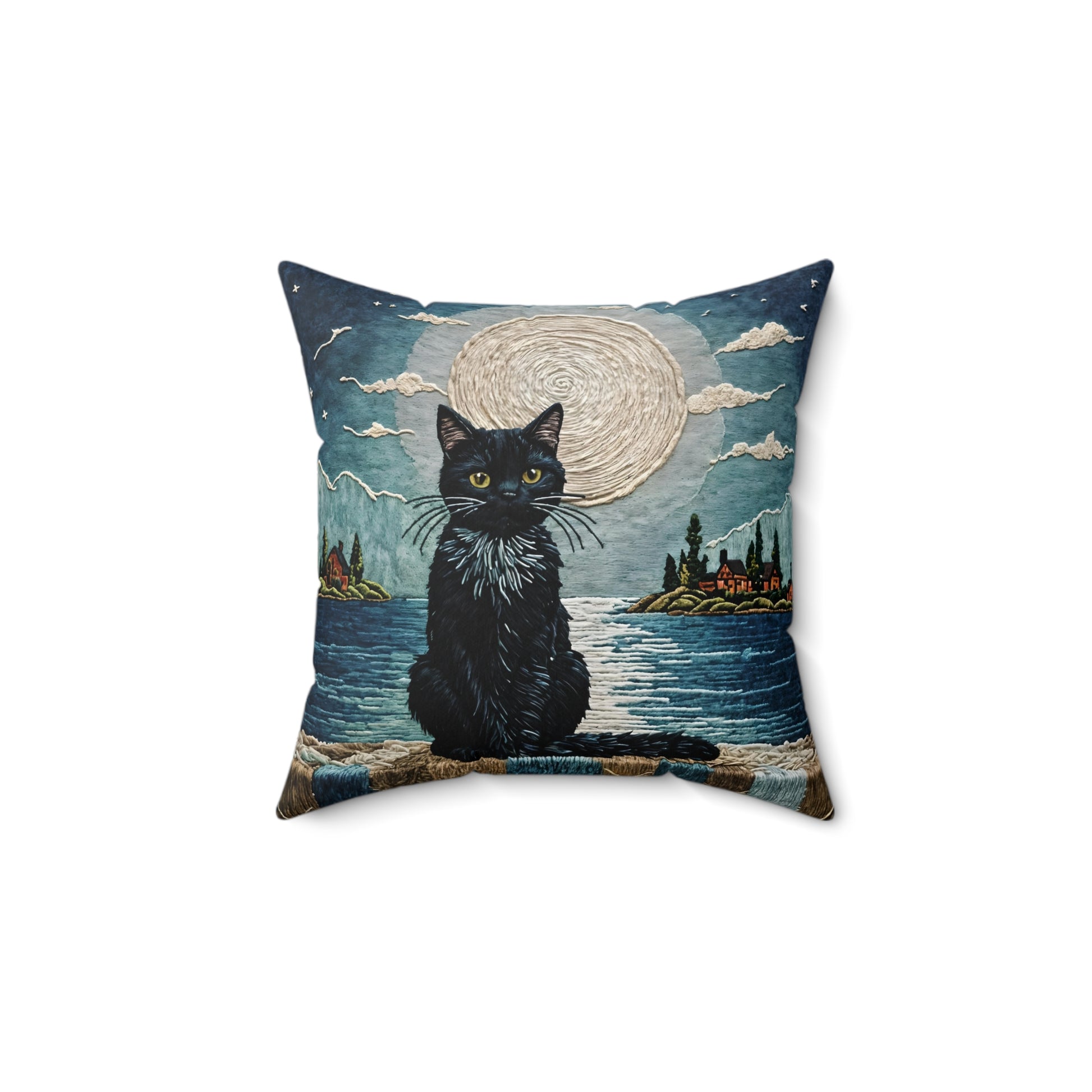 Spun Polyester Square Pillow featuring a black Cat on Moonlight design by Fairyhill Studio. This cozy pillow creates a mystical and enchanting vibe, perfect for cat lovers and those who enjoy celestial themes. Ideal for adding a touch of magic to a living room or bedroom. Relevant for Halloween, cat lovers, and celestial enthusiasts.