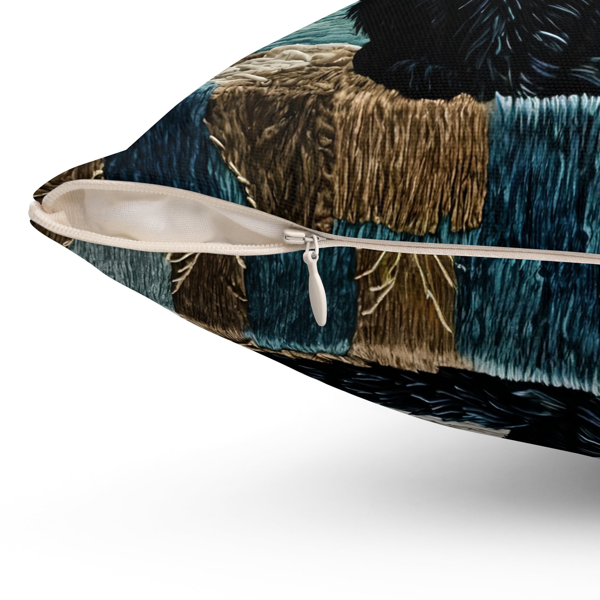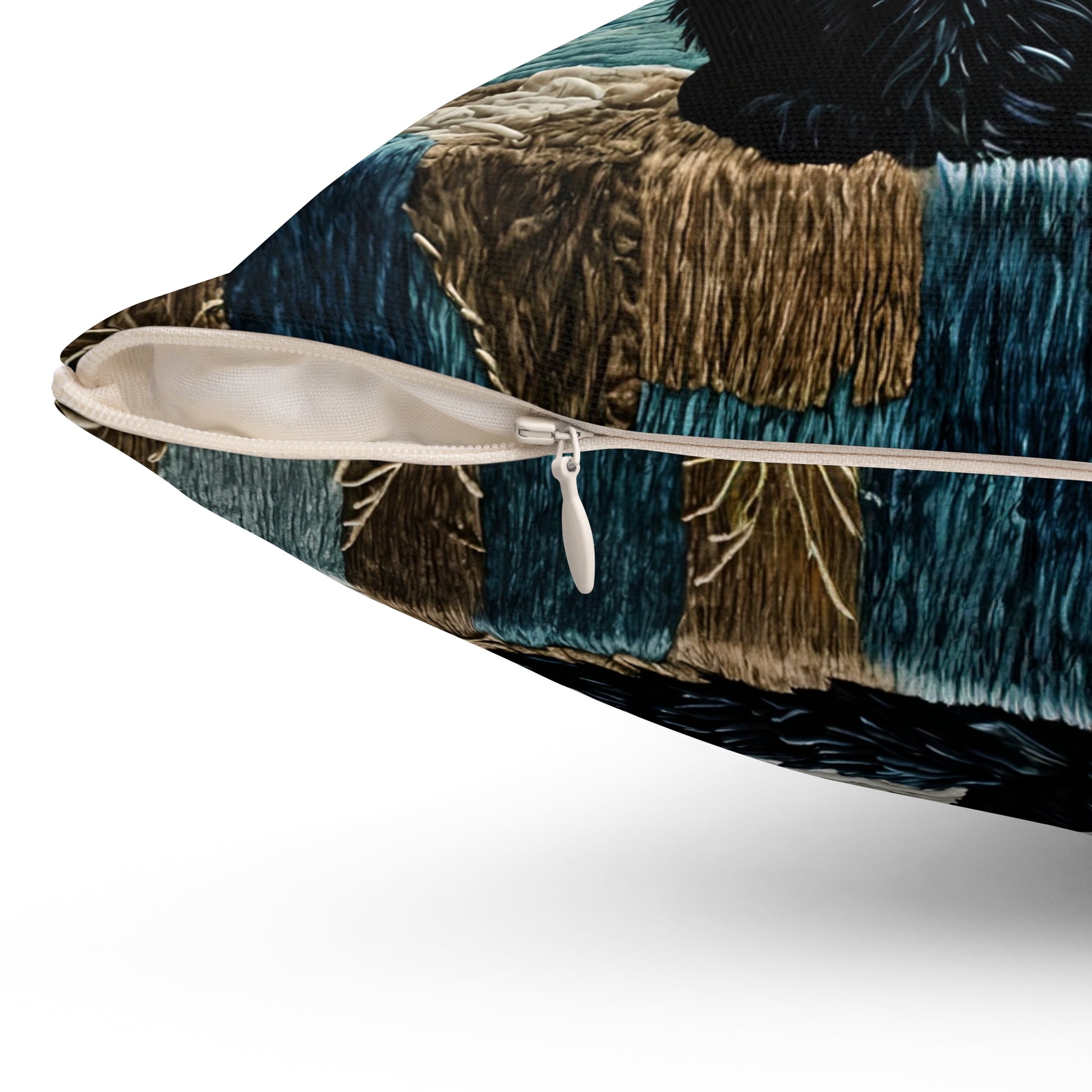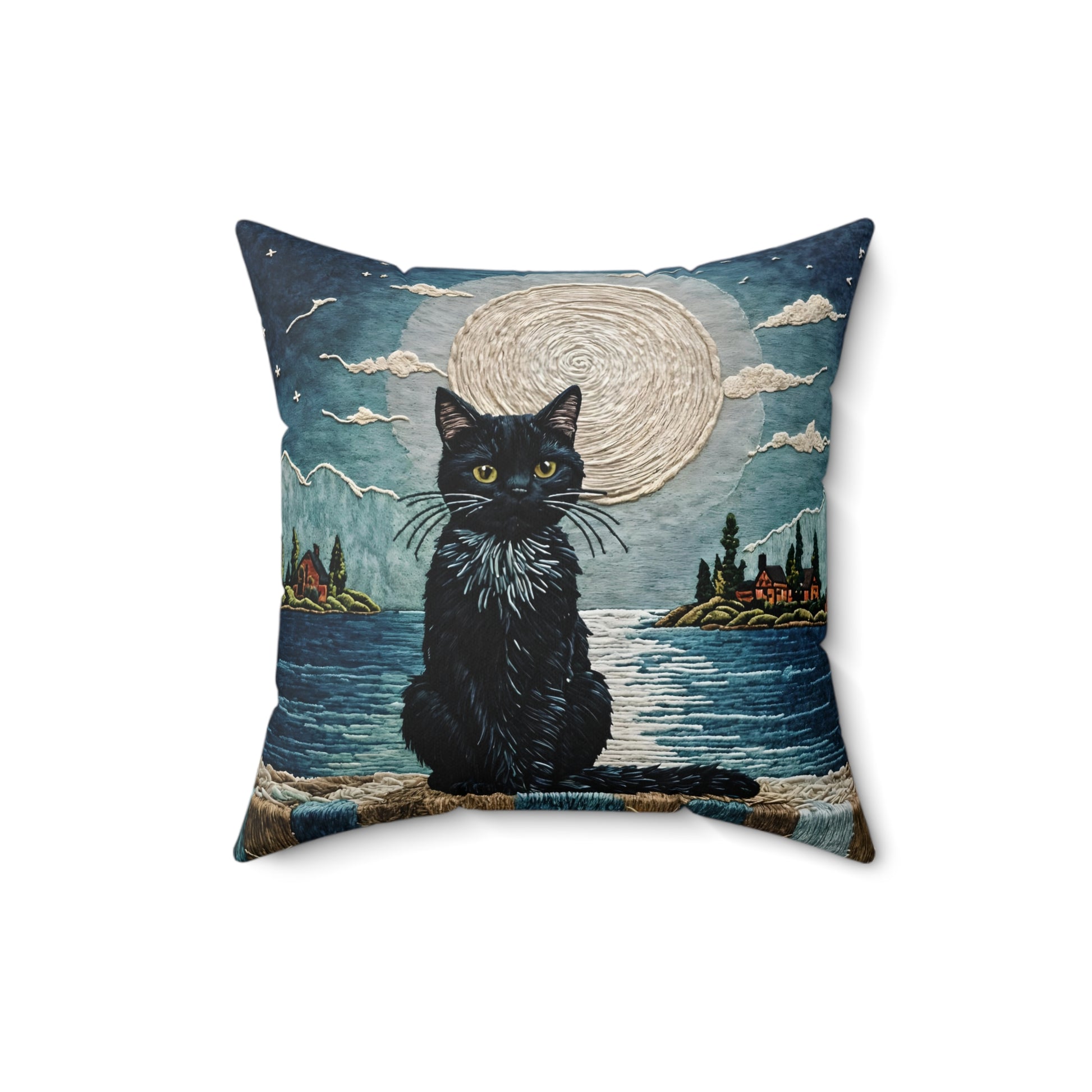 Spun Polyester Square Pillow featuring a black Cat on Moonlight design by Fairyhill Studio. This cozy pillow creates a mystical and enchanting vibe, perfect for cat lovers and those who enjoy celestial themes. Ideal for adding a touch of magic to a living room or bedroom. Relevant for Halloween, cat lovers, and celestial enthusiasts.