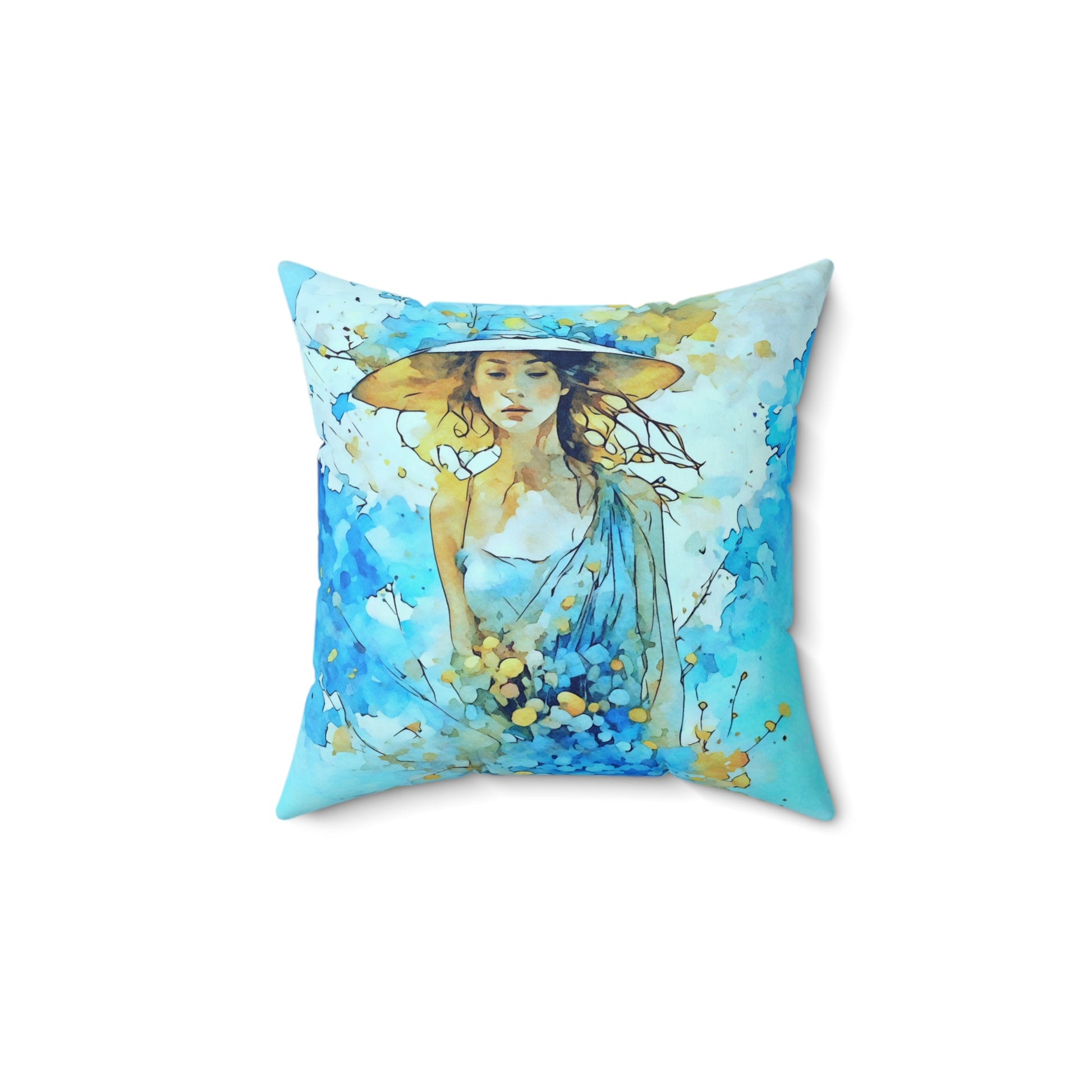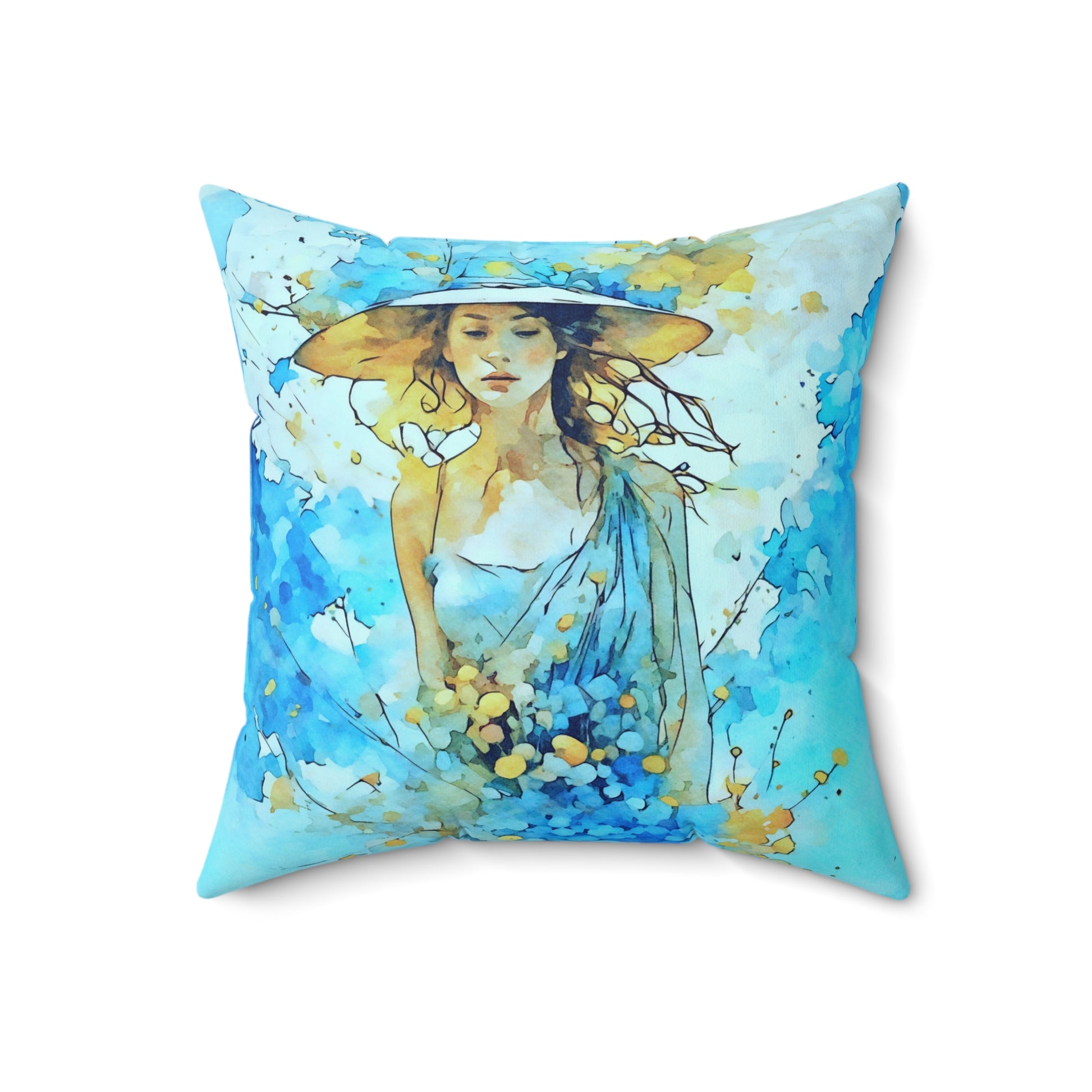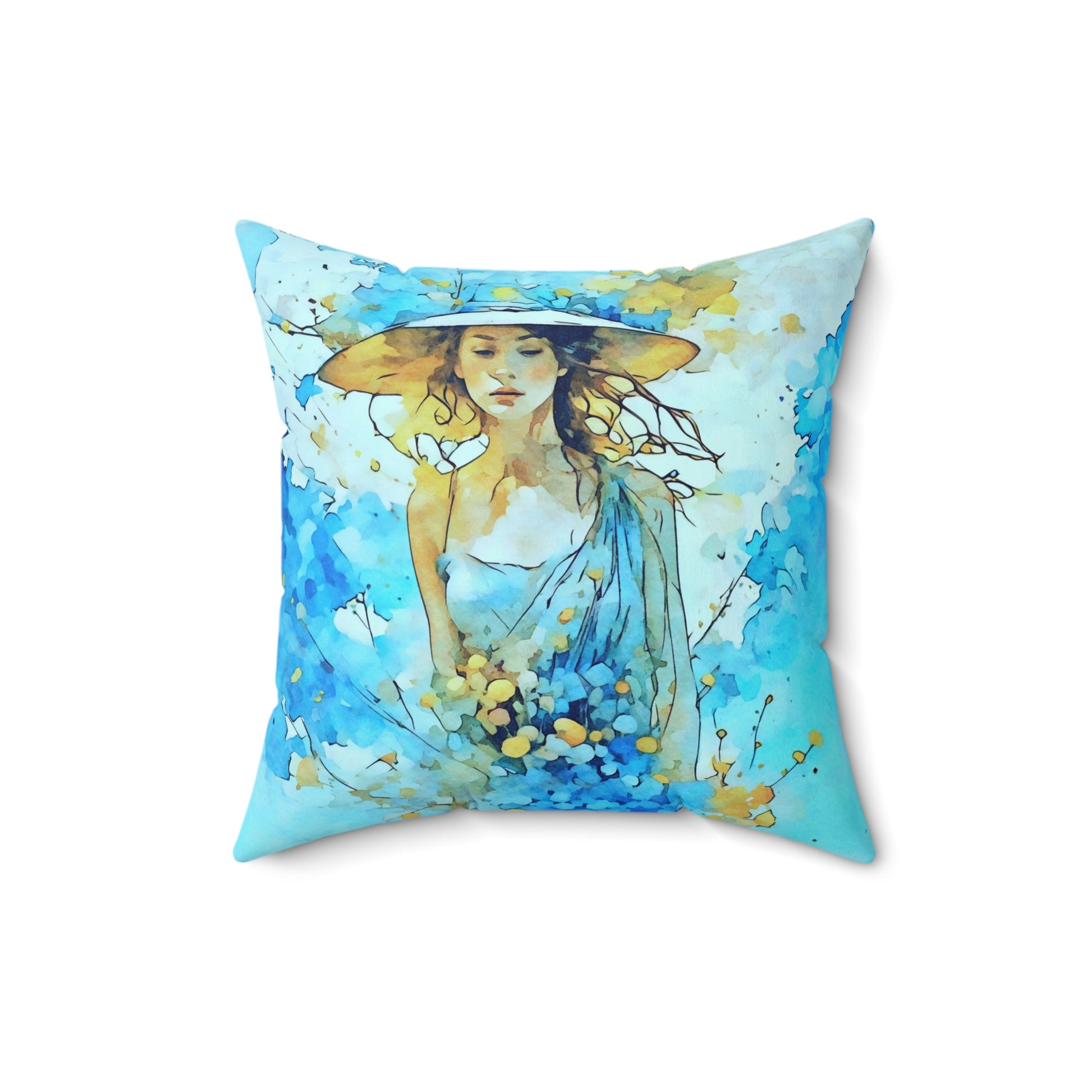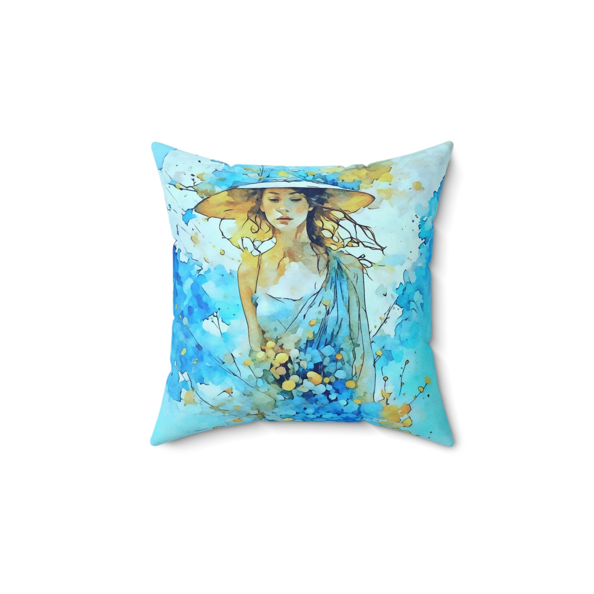 This Blue dress and hat summer art pillow will add a touch of whimsy and charm to any room. Perfect for those who love colorful and unique home decor items, this pillow is ideal for summer decorating or as a gift for an art lover. Relevant for summer home decor, art lovers, and gift-giving occasions.