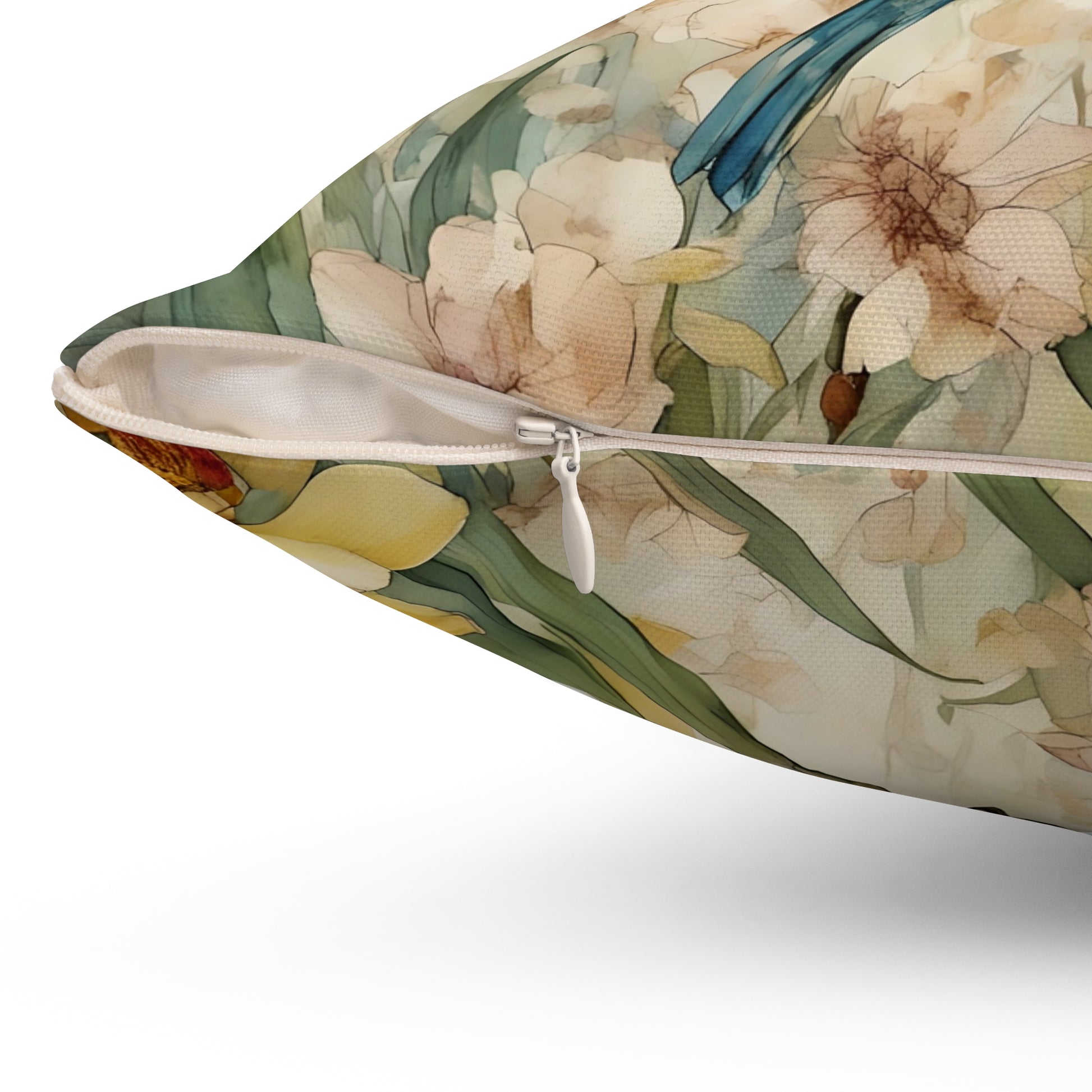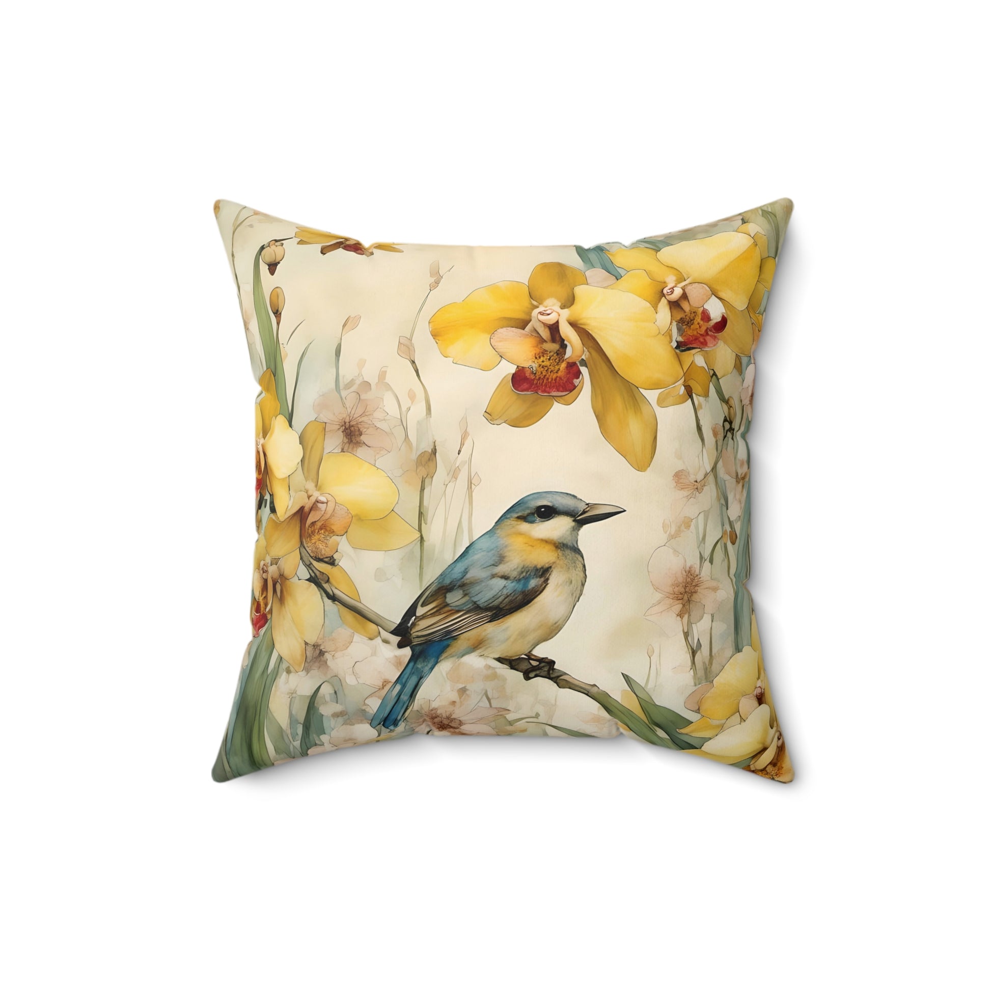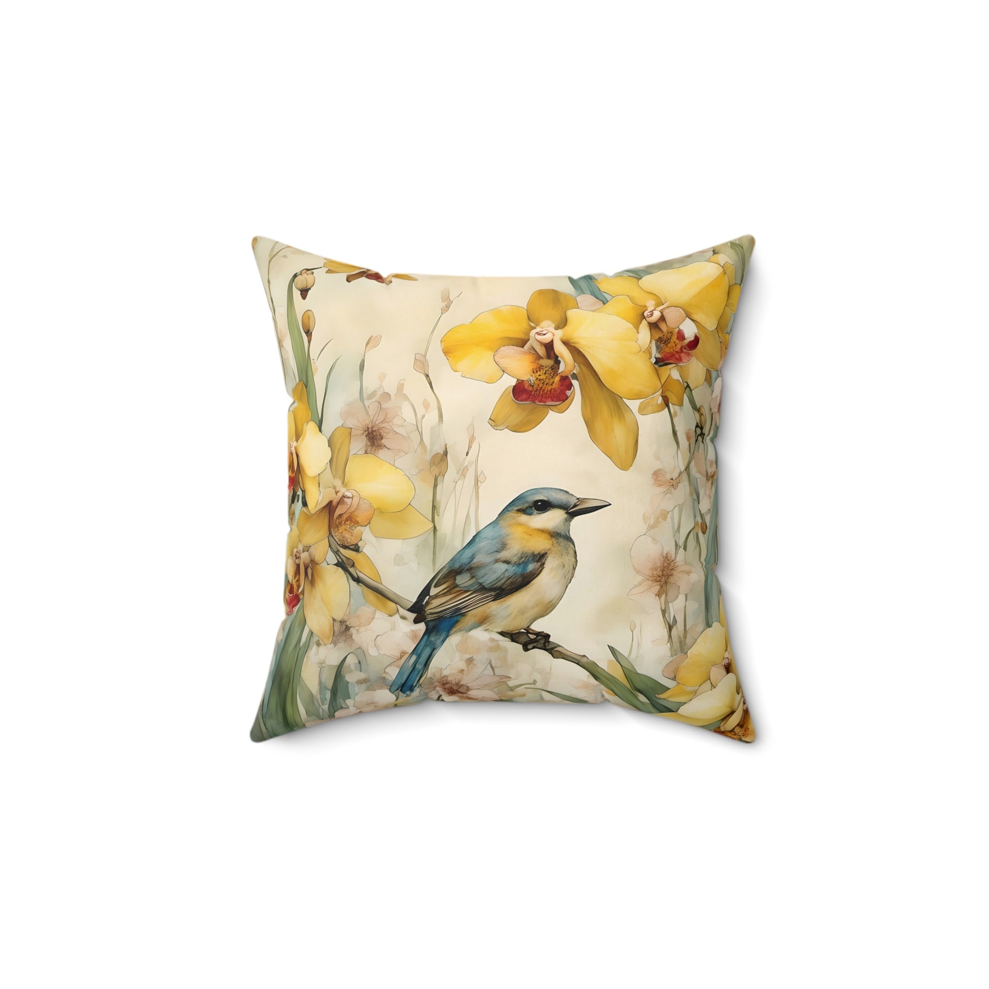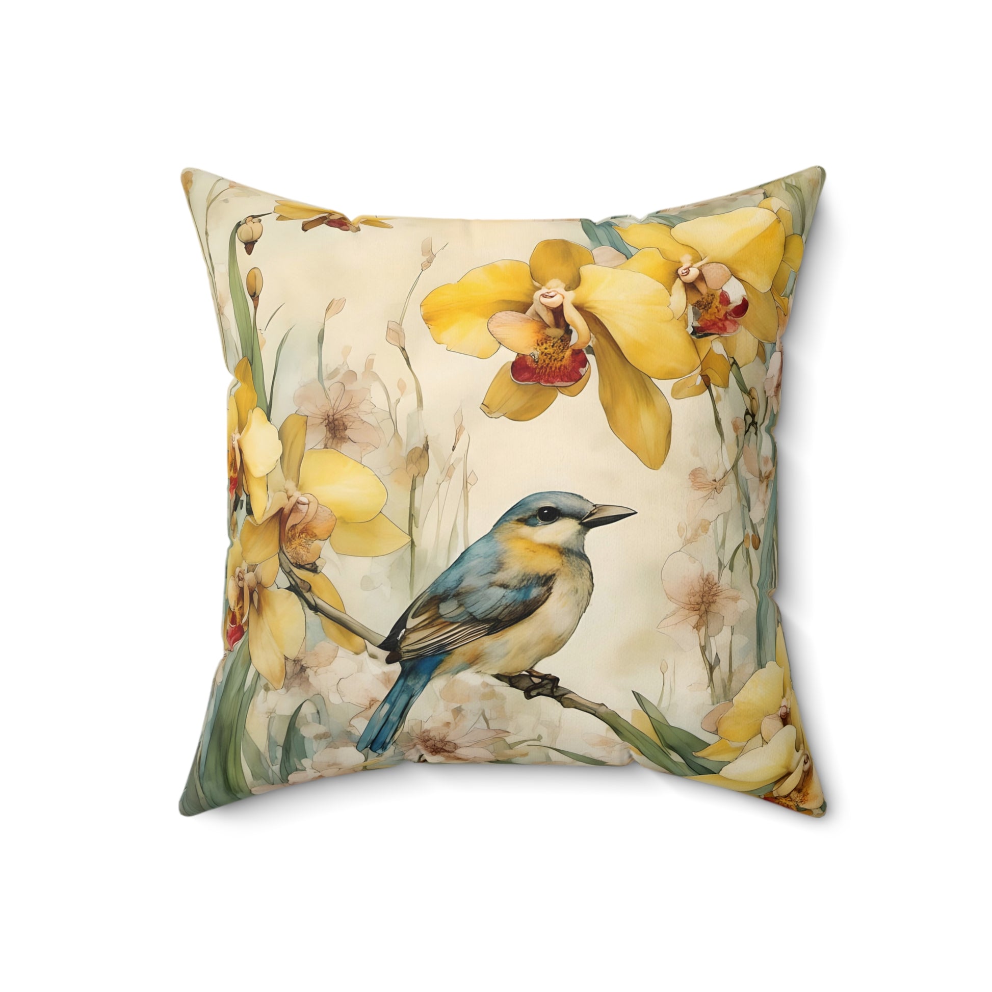 A square Pillow featuring a lovely pastel yellow bird sitting on a bush design by Fairyhill Studio. The soft yellow tones create a serene and charming atmosphere, perfect for adding a touch of nature to any room. Ideal for bird lovers or those who appreciate whimsical artwork. Perfect for adding a pop of color to your living space or as a thoughtful gift for nature enthusiasts. Suitable for home decor, birthdays, spring, and Easter celebrations.