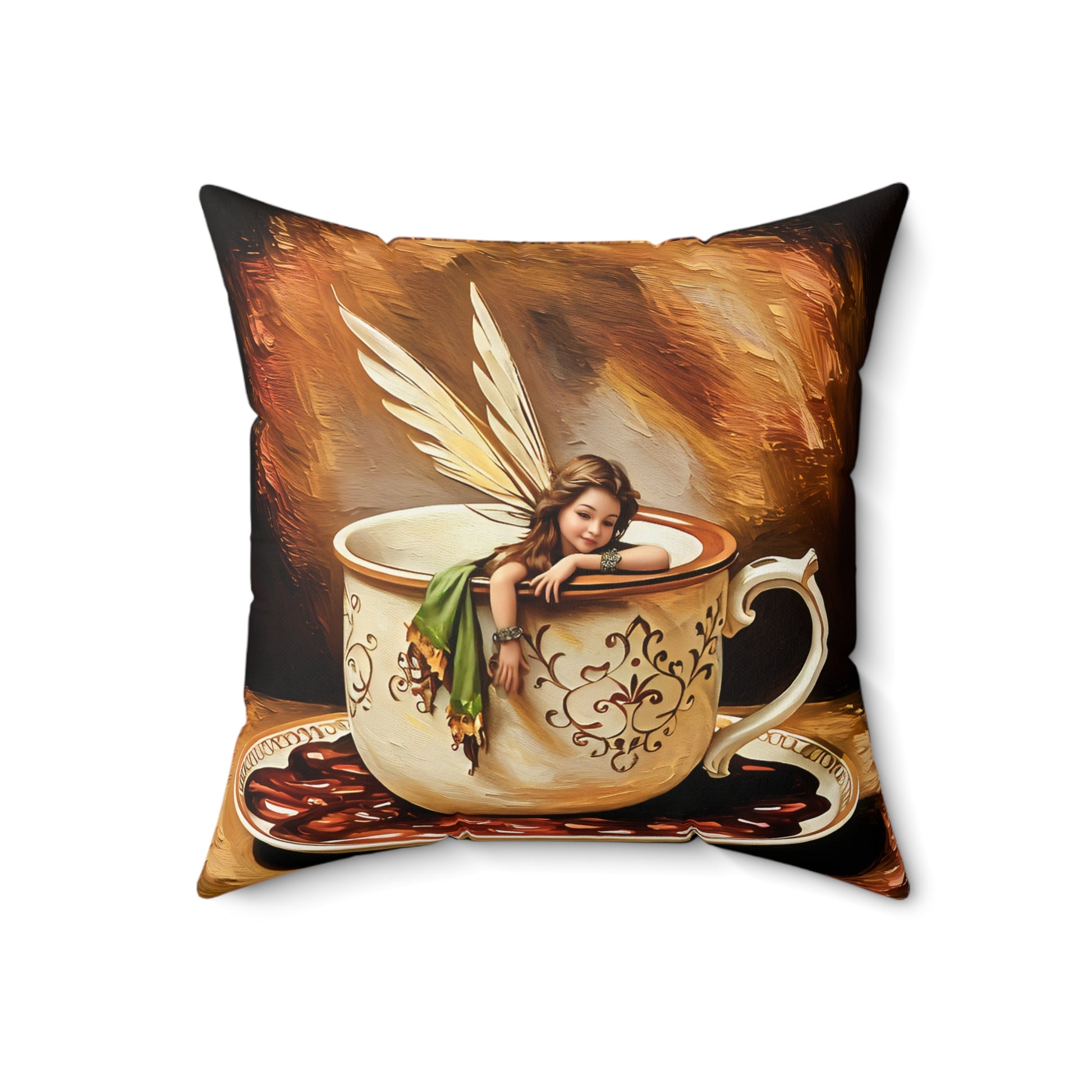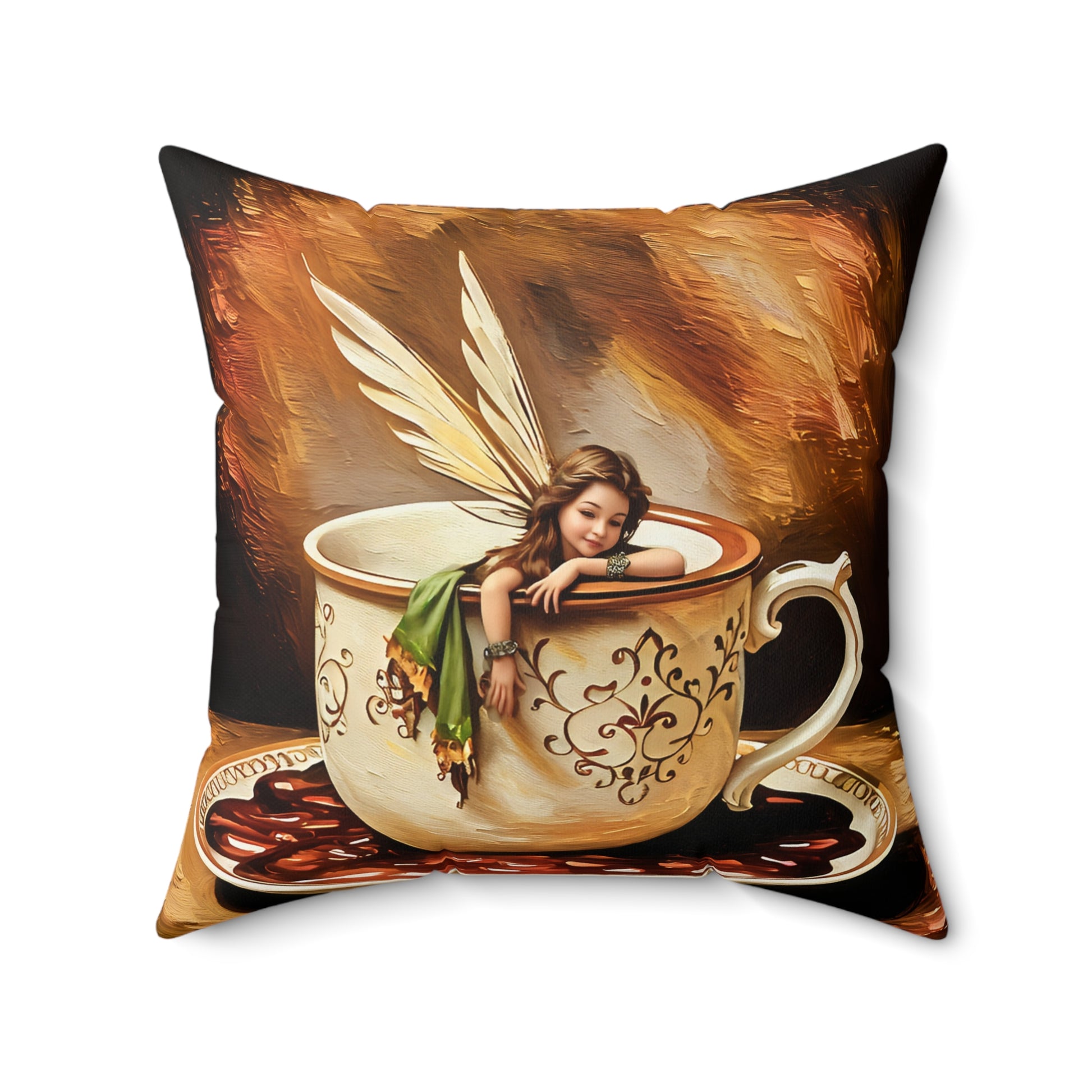 This Square Pillow features a design of a fairy in a coffee cup, perfect for coffee and hot chocolate lovers. It adds a whimsical and magical touch to any living space, creating a cozy and enchanting atmosphere. Ideal for those who enjoy unique and fantasy-themed home decor. Perfect for gifting during Christmas, birthdays, or any special occasion.