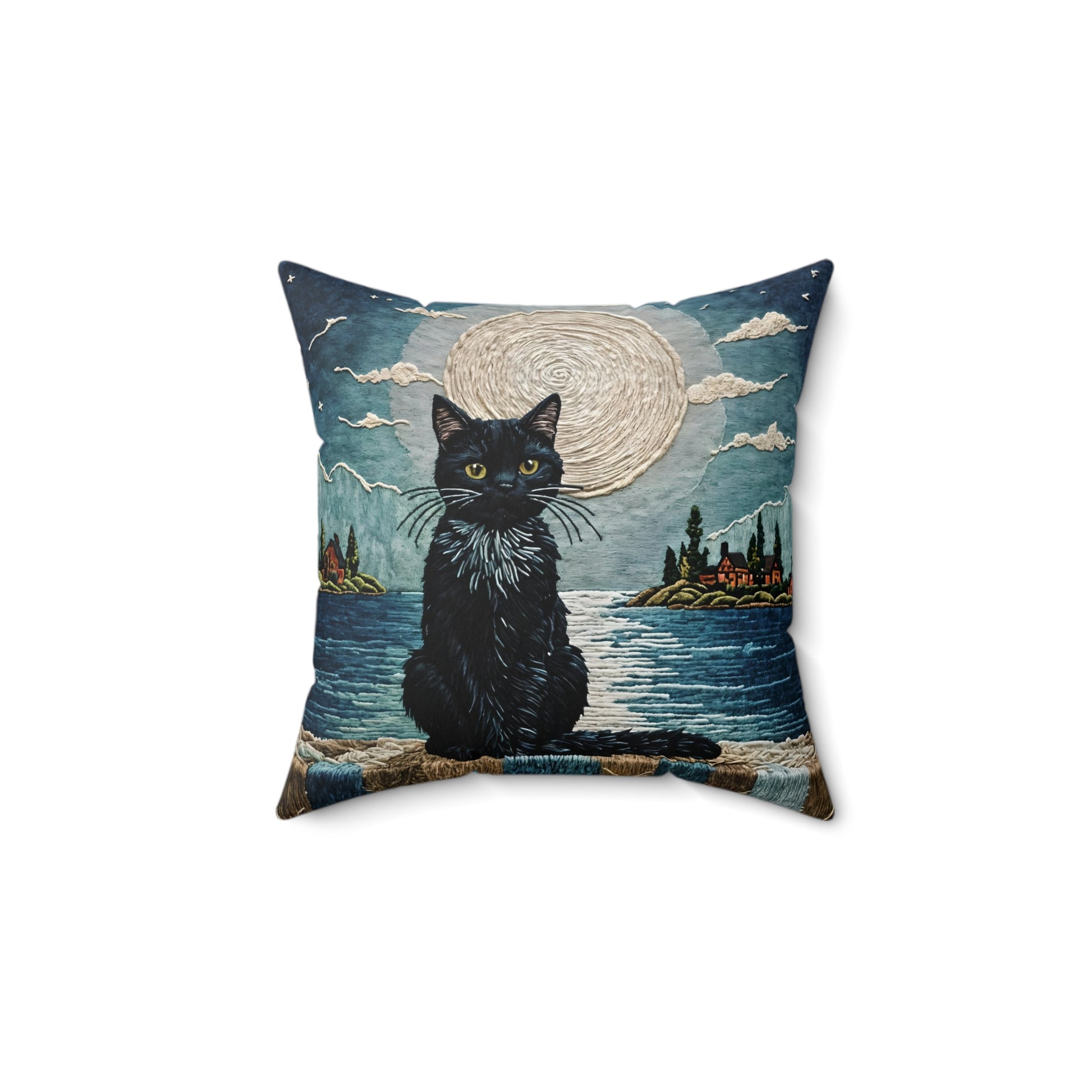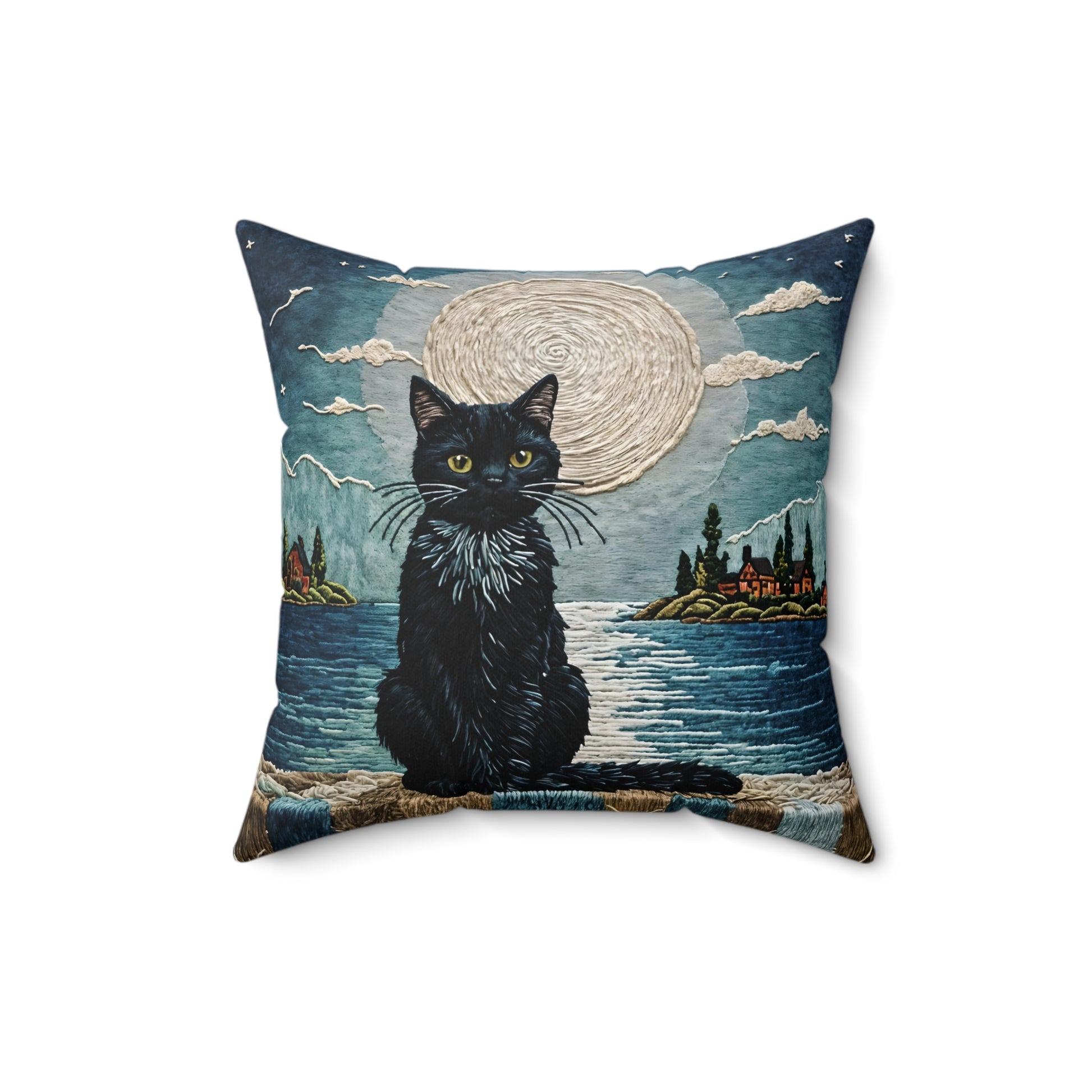 This pillow features a cute black cat sitting on a wall with a sea view background on a large moon, under the moonlight. Perfect for cat lovers and those who enjoy unique and whimsical home decor. Great for adding a touch of coziness and charm to your living space. Ideal for Halloween, cat-themed parties, or anyone who loves a peaceful nighttime vibe.