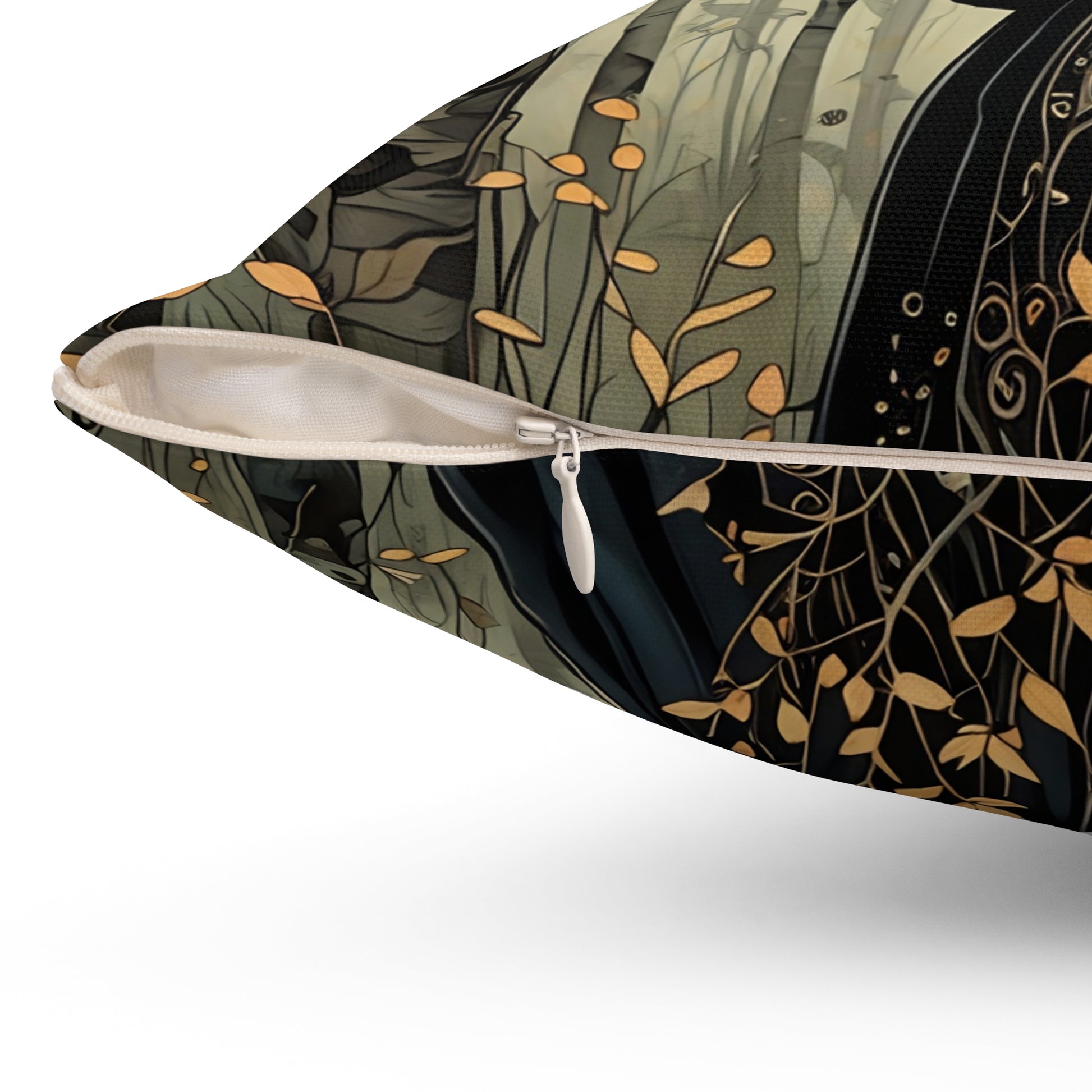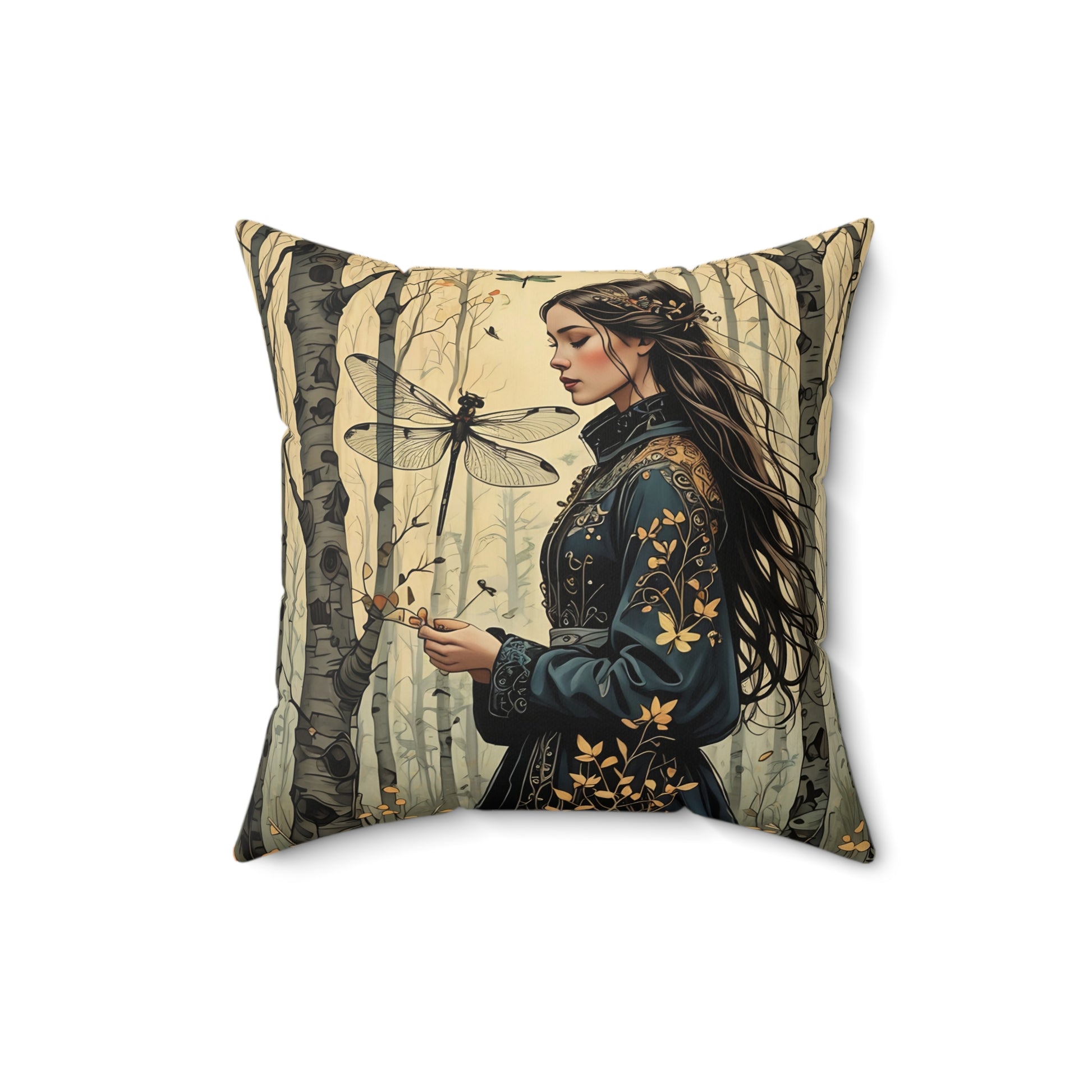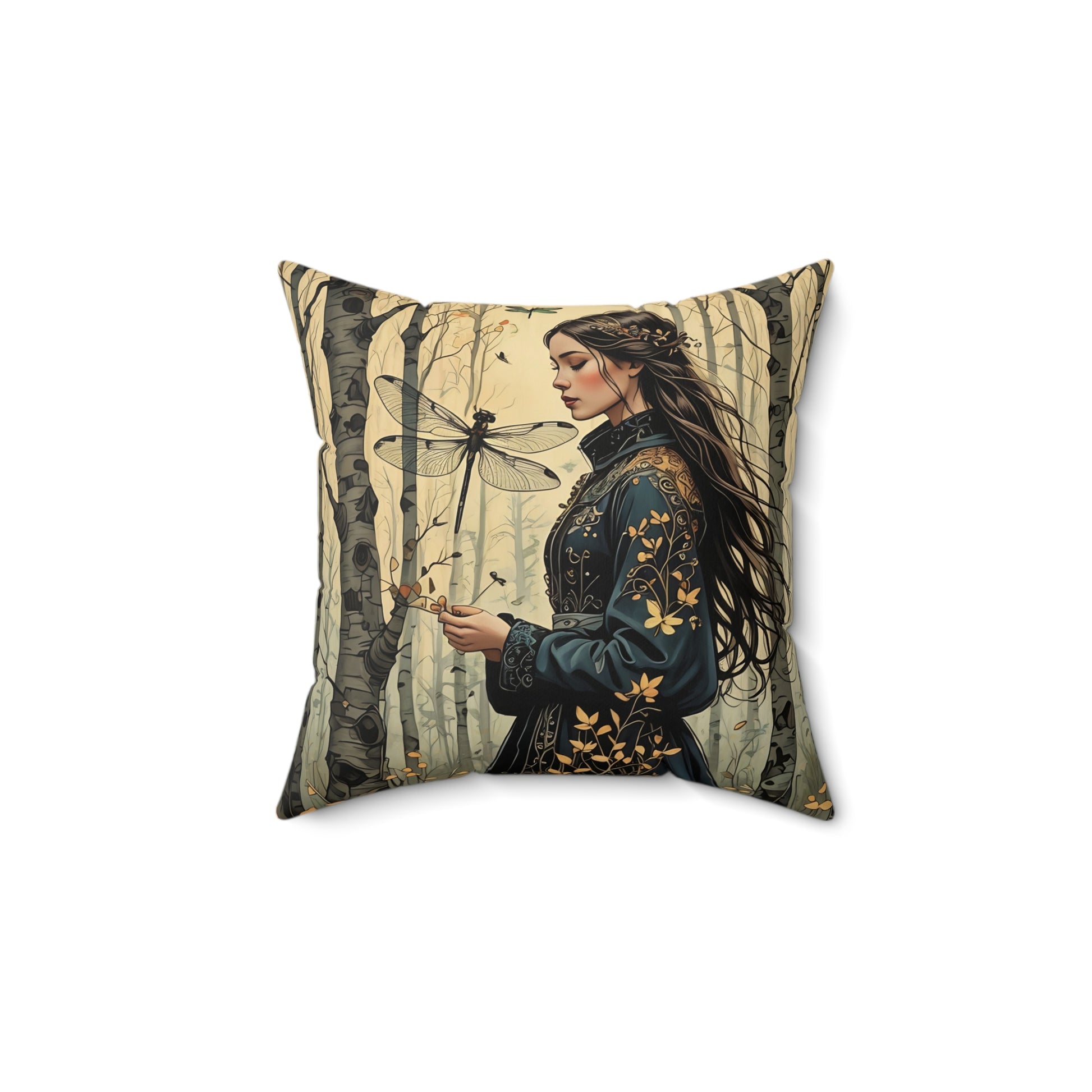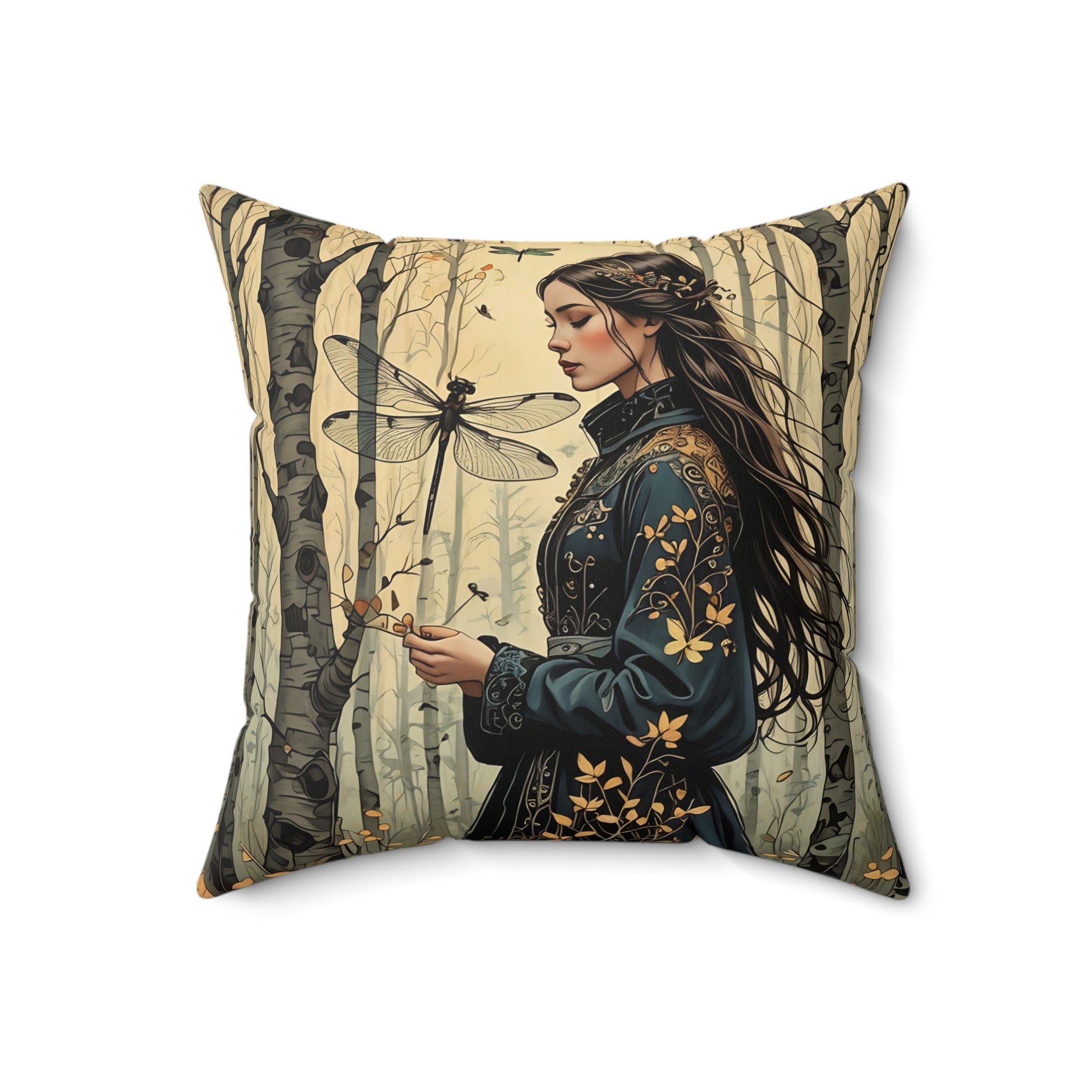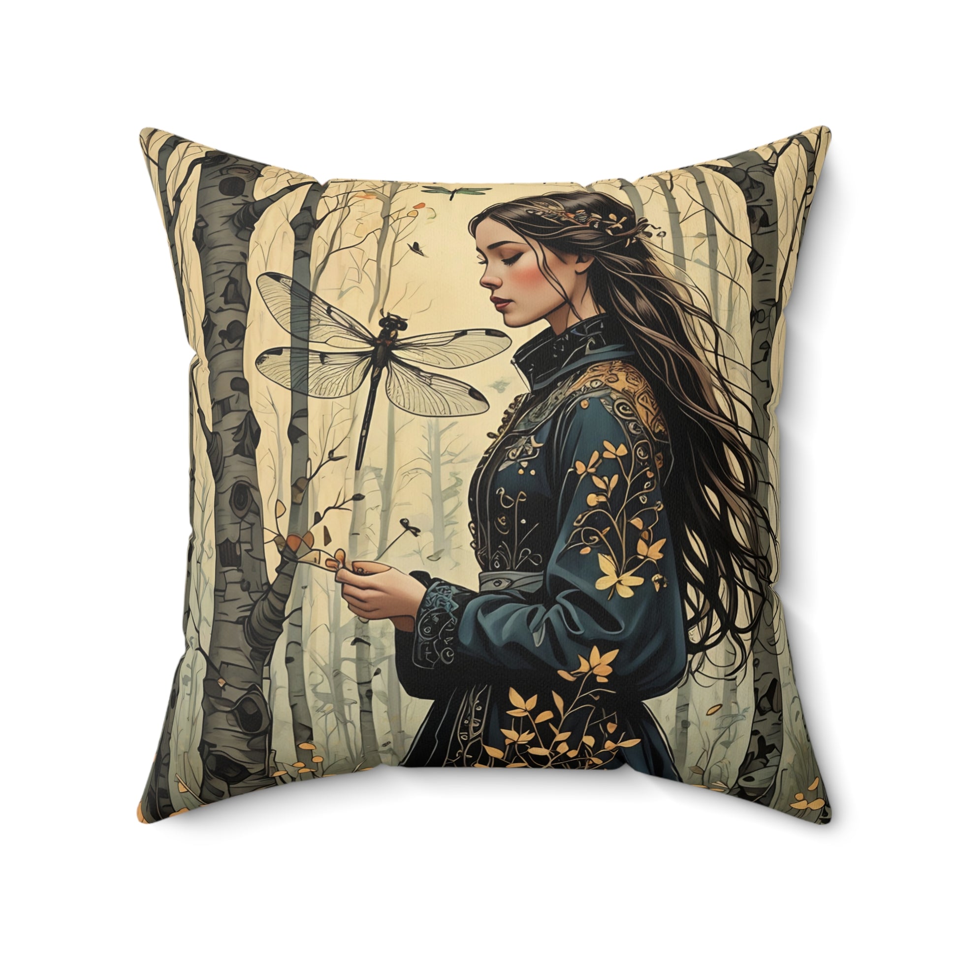 Princess and the Dragonfly in the forest pillow featuring art by Fairyhill Studio. This spun polyester square pillow gives a whimsical and magical vibe, perfect for fairy tale lovers and nature enthusiasts. Ideal for adding a touch of enchantment to any living space. Relevant for fantasy-themed home decor, children's rooms, and nature-inspired celebrations.