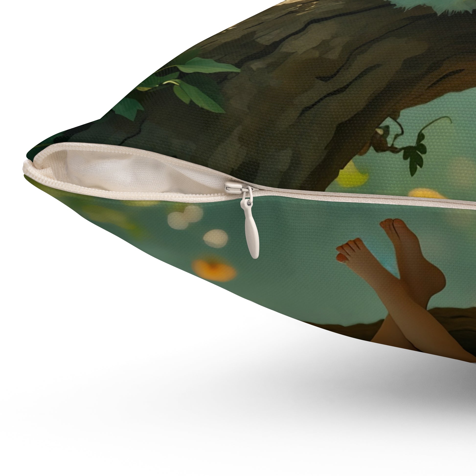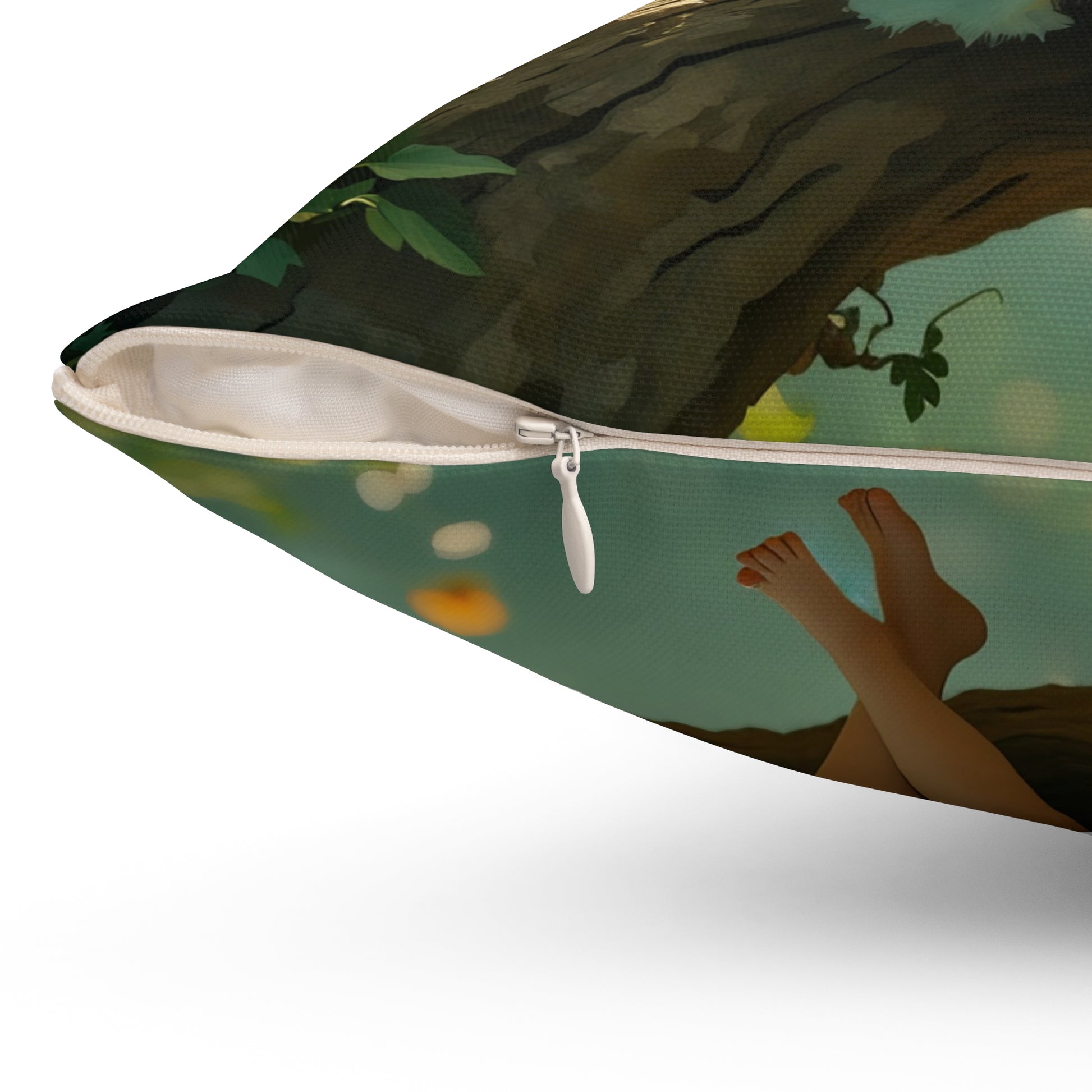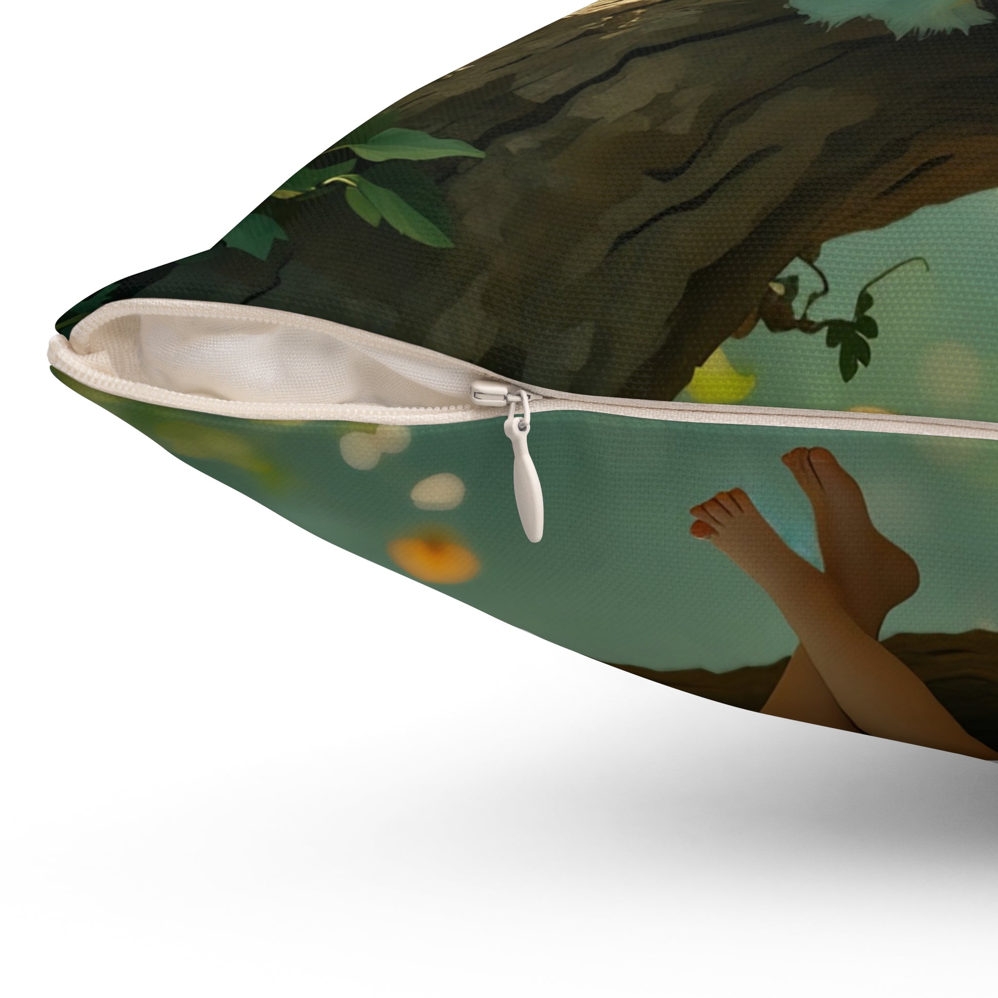 Add a whimsical touch to your home decor with this fairy-themed pillow featuring a fairy sitting on a tree branch holding a sign. Perfect for fairy lovers and those who appreciate magical, mystical designs. Ideal for adding a touch of enchantment to any room, especially relevant for fantasy-themed decor and fairy enthusiasts.