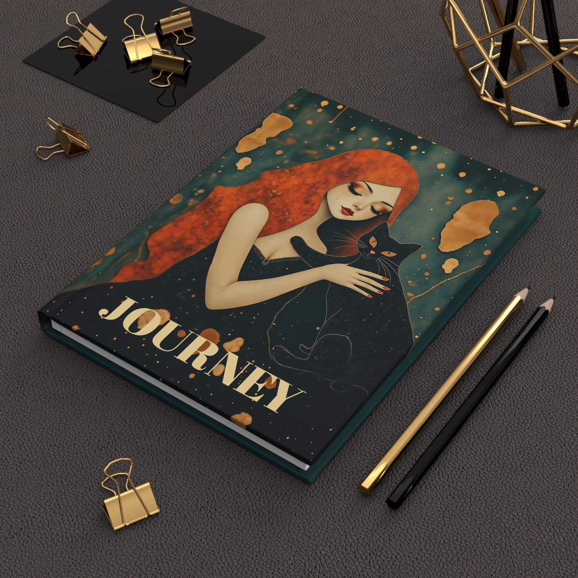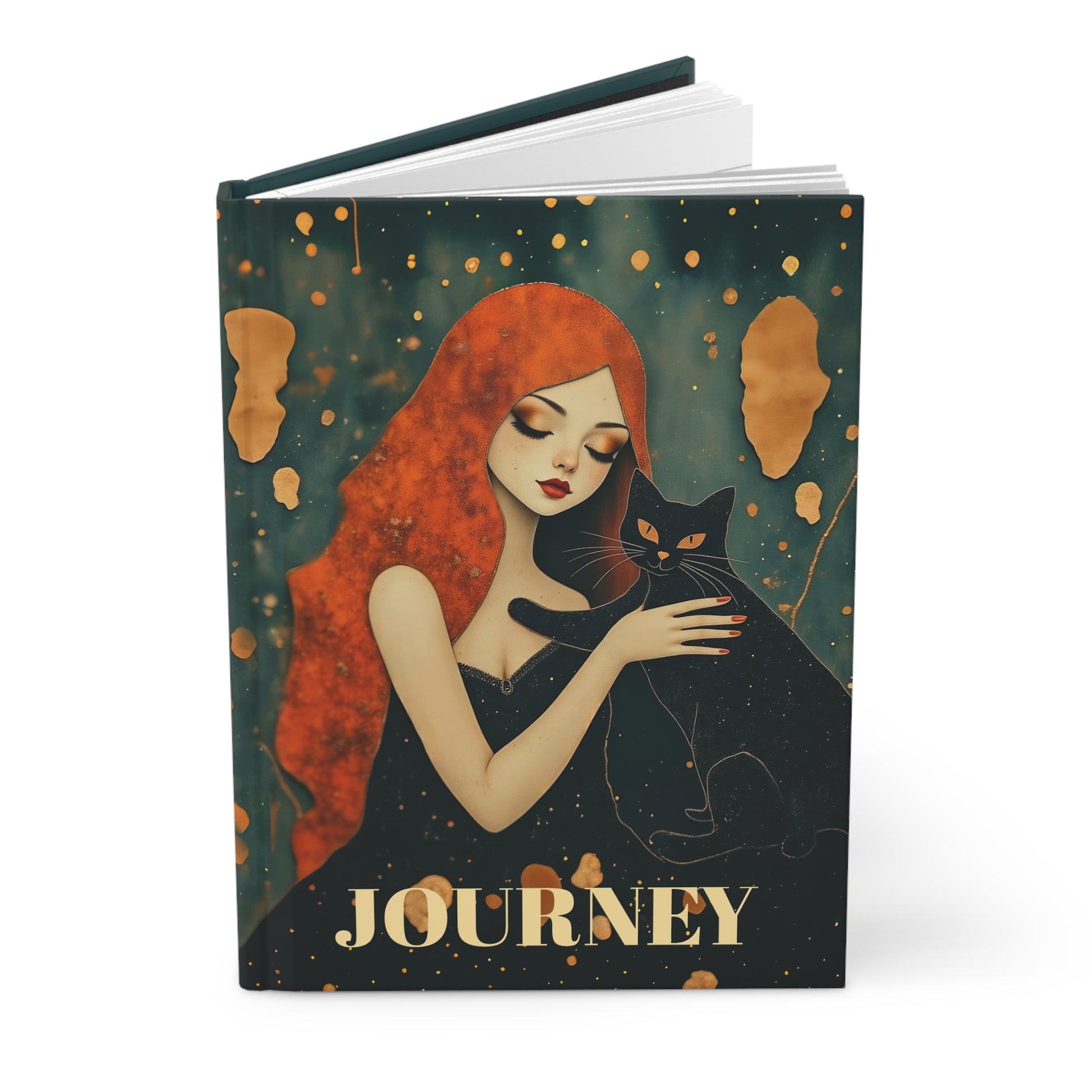 Make your everyday journaling more personal, private, and stylish with The Witching Hour Hug with this matte hardcover journal.lady with a a black cat Available in 5.75"x8", with 150 lined pages, these sturdy hardcover journals are fully customizable on the front and on the back covers. The matte laminate coating on the cover will make them stay true to your personal style. .: Full wraparound print .: 150 lined pages (75 sheets) .: Matte finish .: Casewrap binding .: Note: 0.5"x0.5" production barcode visible on the back cover