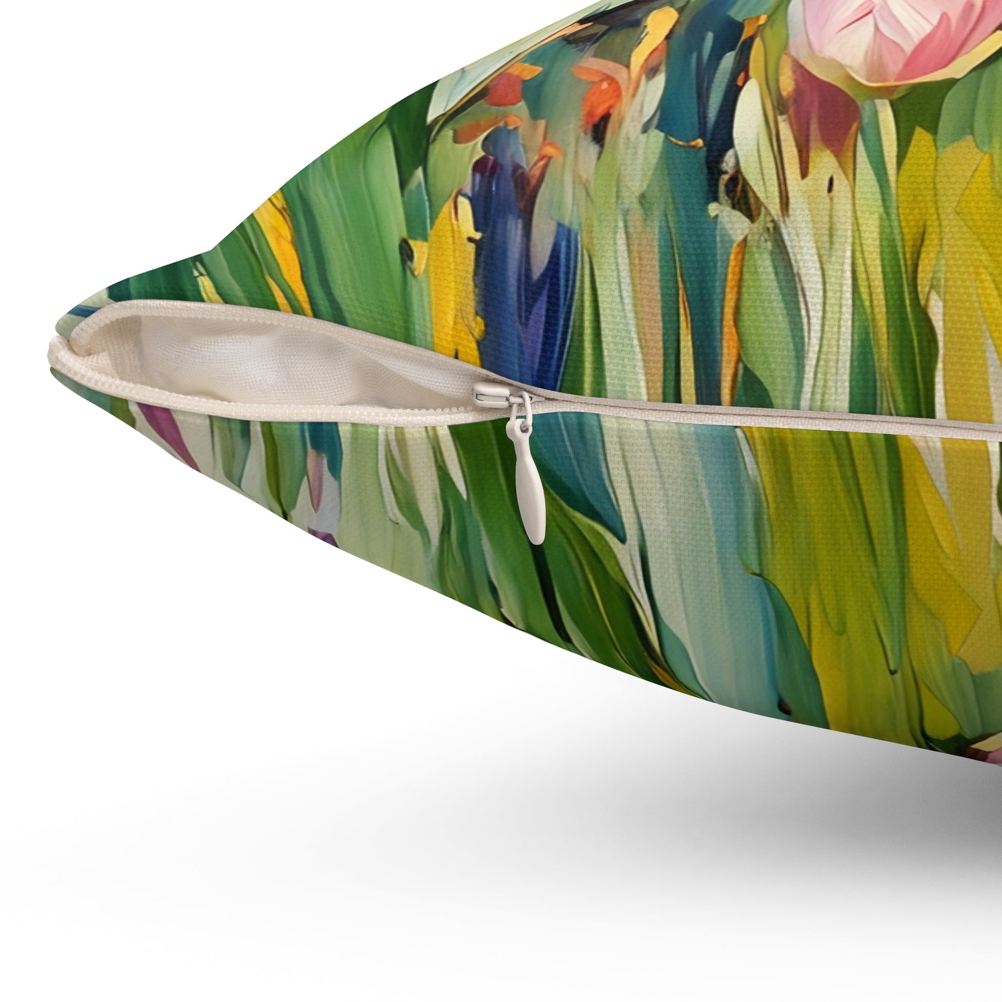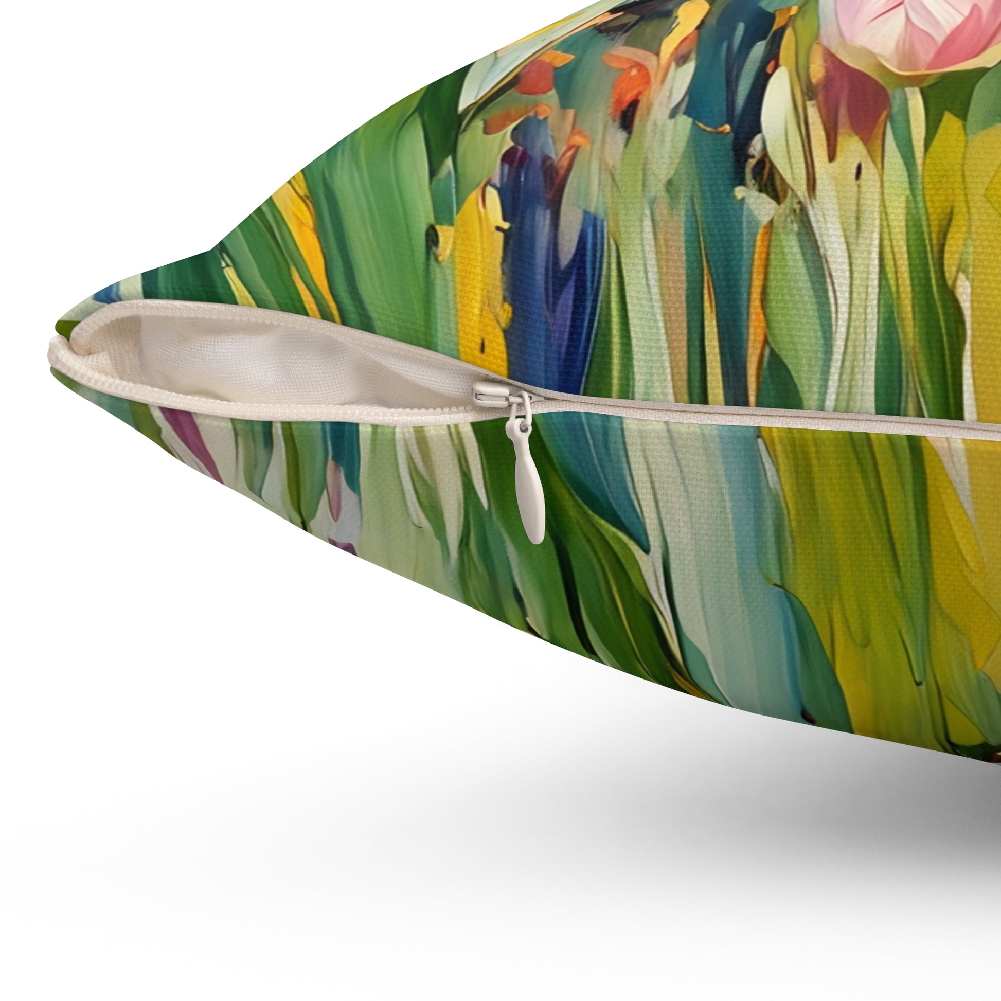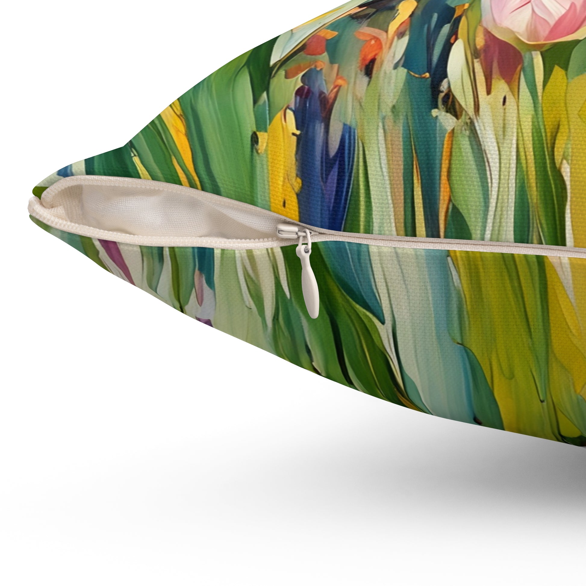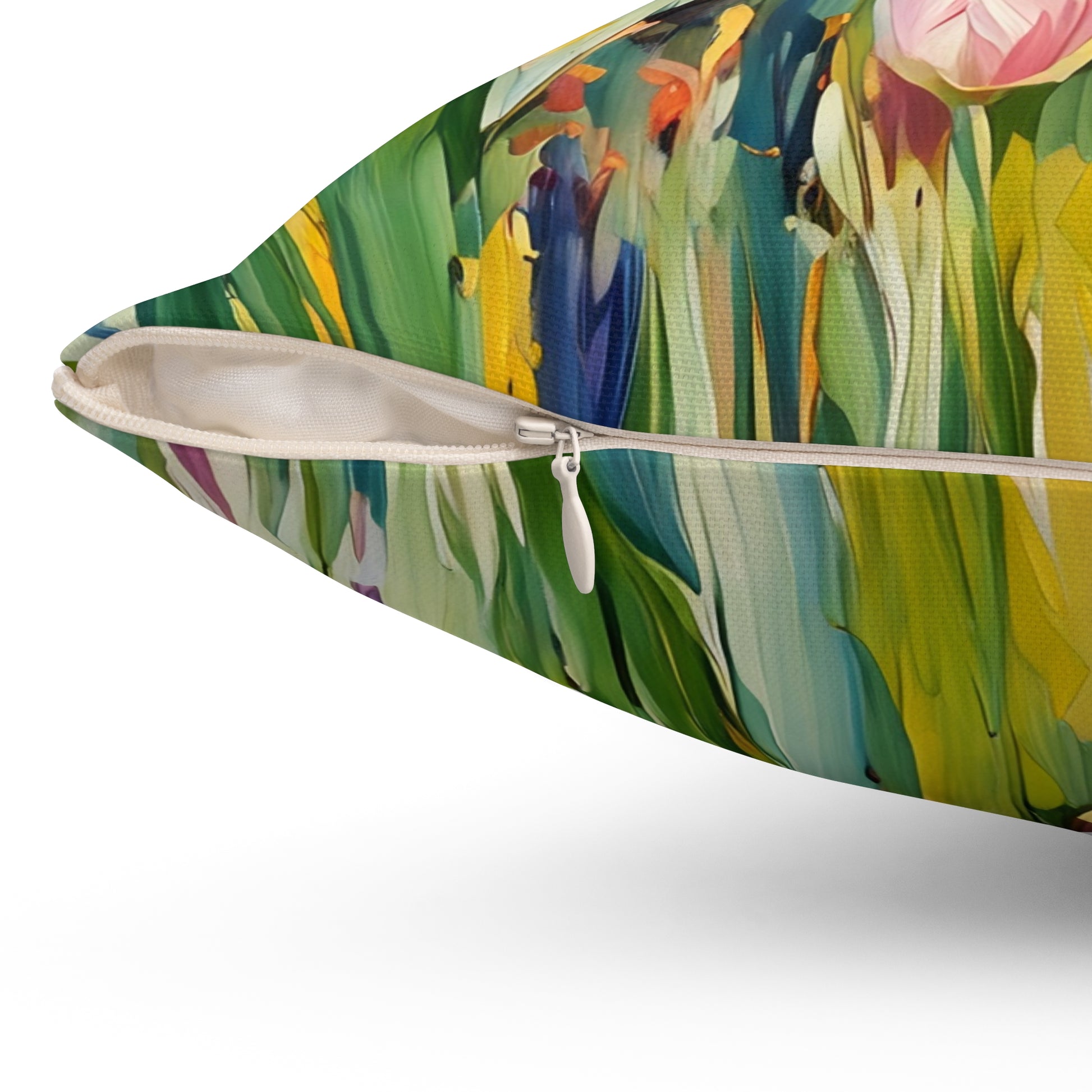 This double-sided printed The Witching Hour Hug Square pillow features a Lady with a Gentle Guardian a black cat Square Pillow by fairyhill studio, giving off a whimsical and charming vibe. Perfect for book art lovers lovers and those who enjoy a touch of whimsy in their decor. Ideal for spring and summer home decor, garden parties, and bee-themed celebrations.