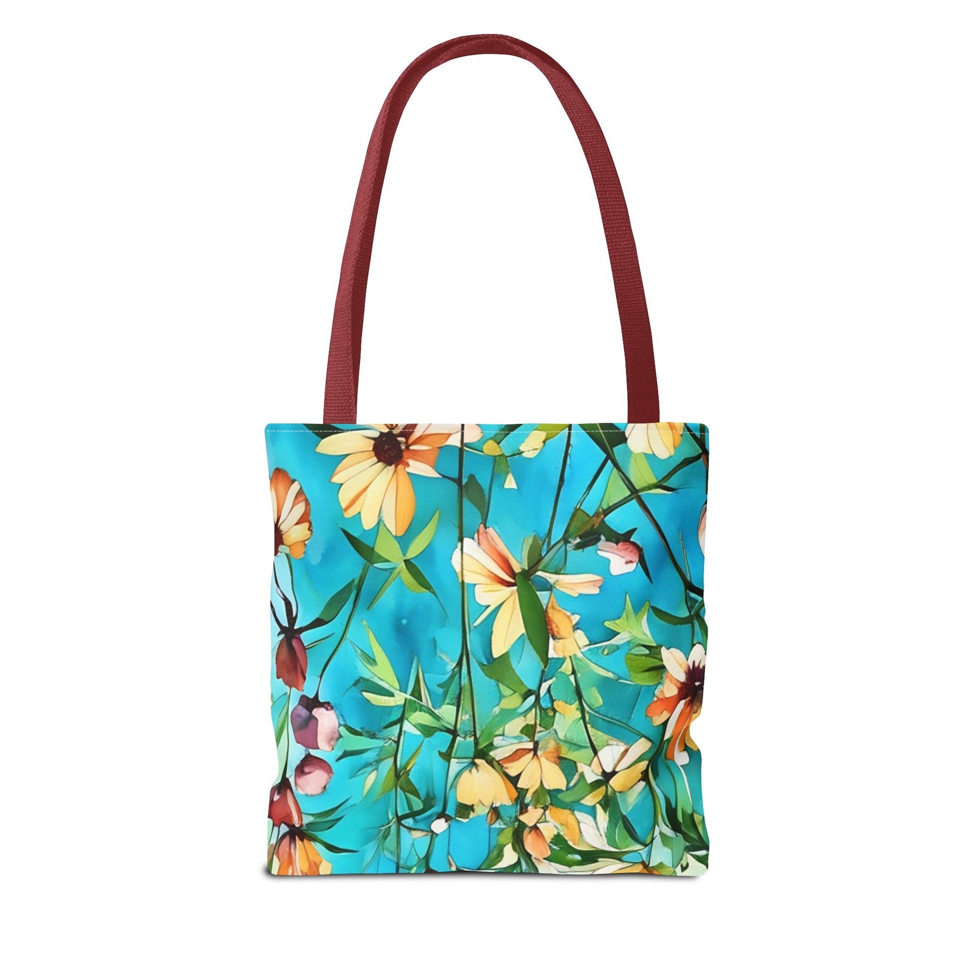 This Tote Bag features wild peach color flowers on an aqua background, designed by fairyhill Studio. It gives off a vibrant and floral vibe, perfect for adding a pop of color to your outfit or carrying your essentials. Ideal for nature lovers, garden enthusiasts, and those who appreciate artistic flair. Great for spring and summer outings, farmers' markets, and picnics.