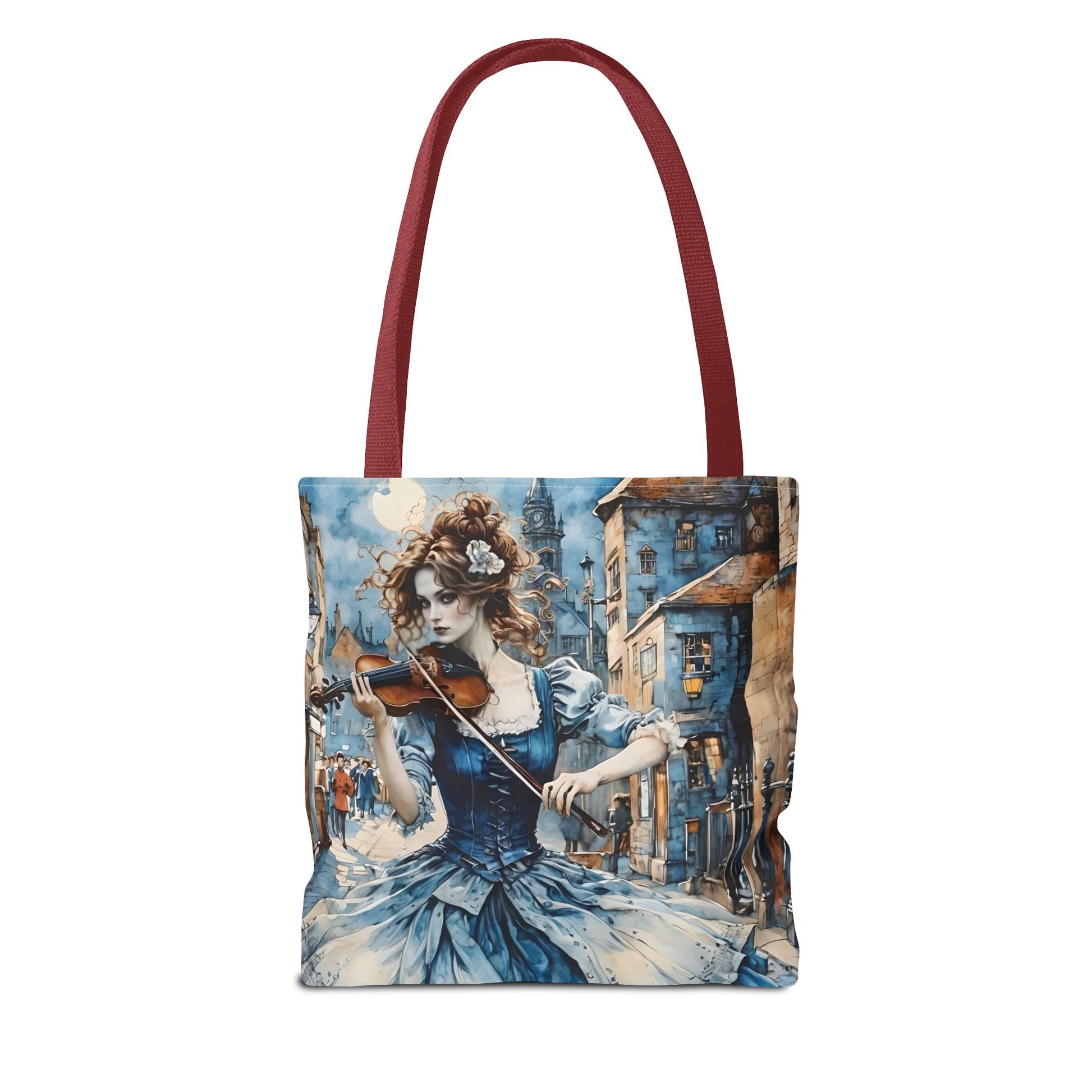 This Tote Bag features a beautiful Blue gypsy with Violin art by Fairyhill Studio, giving off a bohemian and artistic vibe. It is perfect for carrying everyday essentials and can be a statement piece in your outfit. Ideal for music lovers, artists, and those who appreciate unique designs. Suitable for holidays, music festivals, art events, and everyday use.