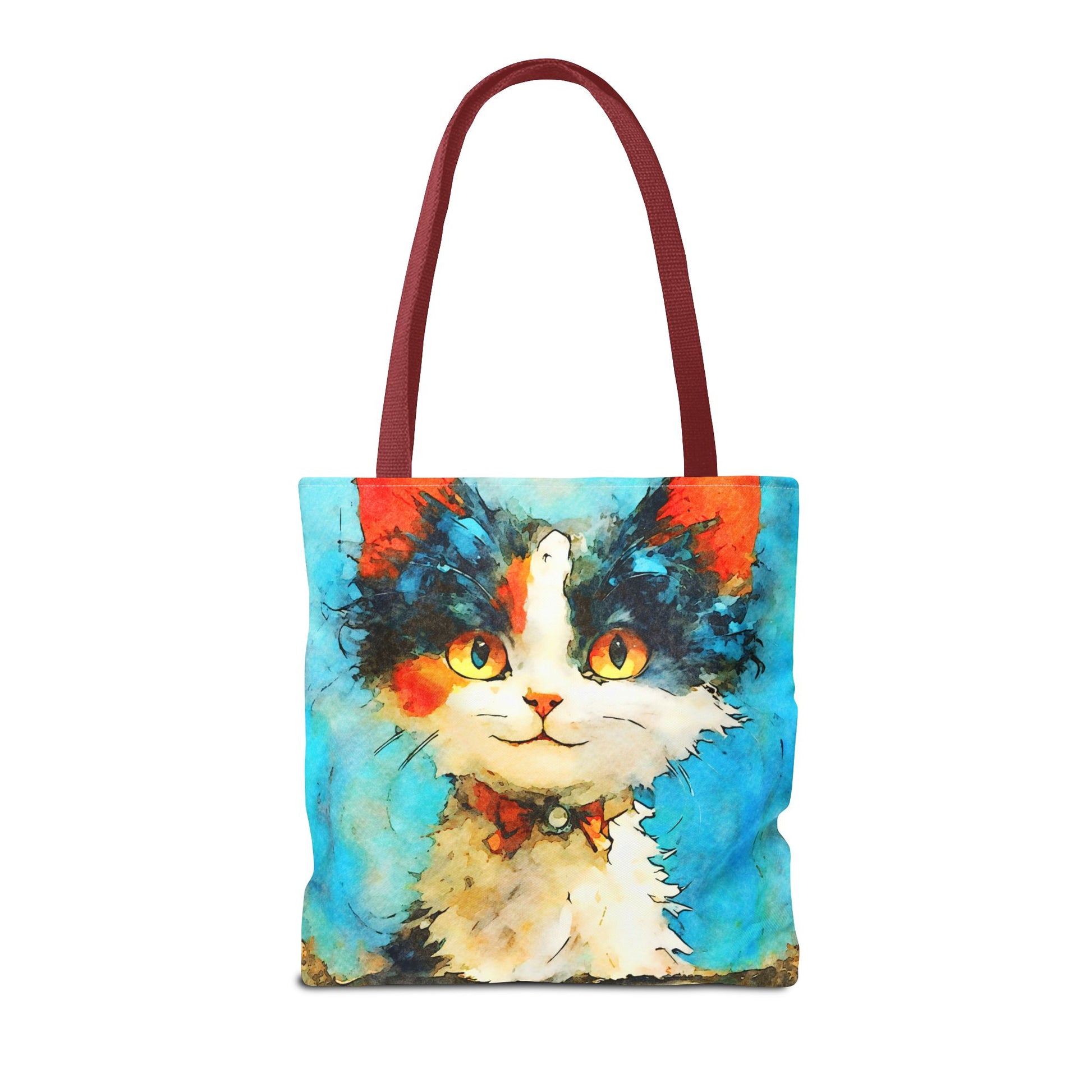 A cute tote bag featuring an adorable cat design in blue and orange tones, perfect for cat lovers. This durable and spacious tote bag is ideal for everyday use and makes a great gift for cat enthusiasts. Suitable for carrying groceries, books, or any essentials, adding a touch of feline charm to your daily outings. Perfect for cat-themed holidays or occasions.