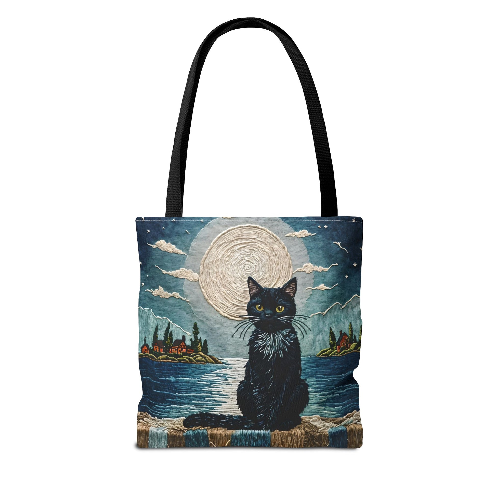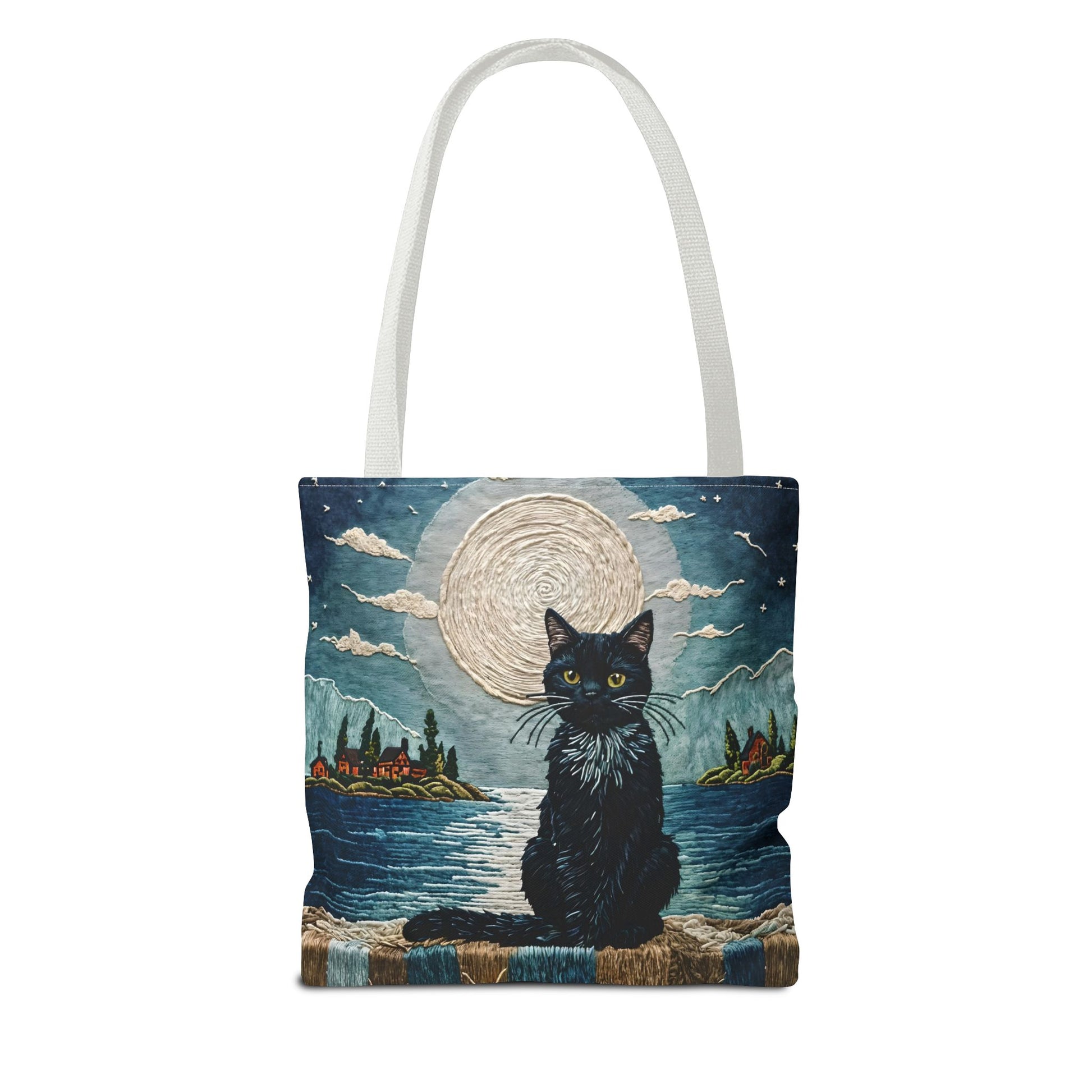 Unique, art-inspired black cat on a sea view background on moonlight tote bags perfect for every occasion. Adds flair and function to daily style, relevant to those who appreciate artistic and creative designs. Ideal for gifting during Halloween, birthdays, or as a daily essential.
