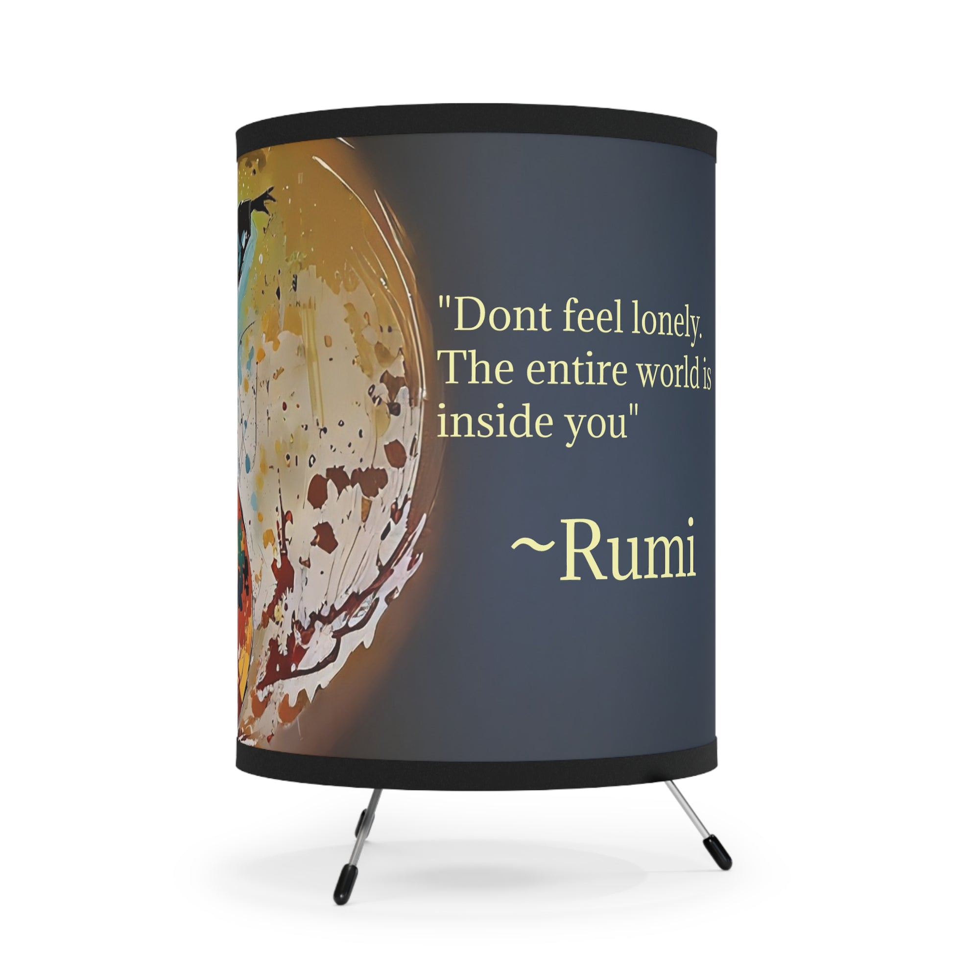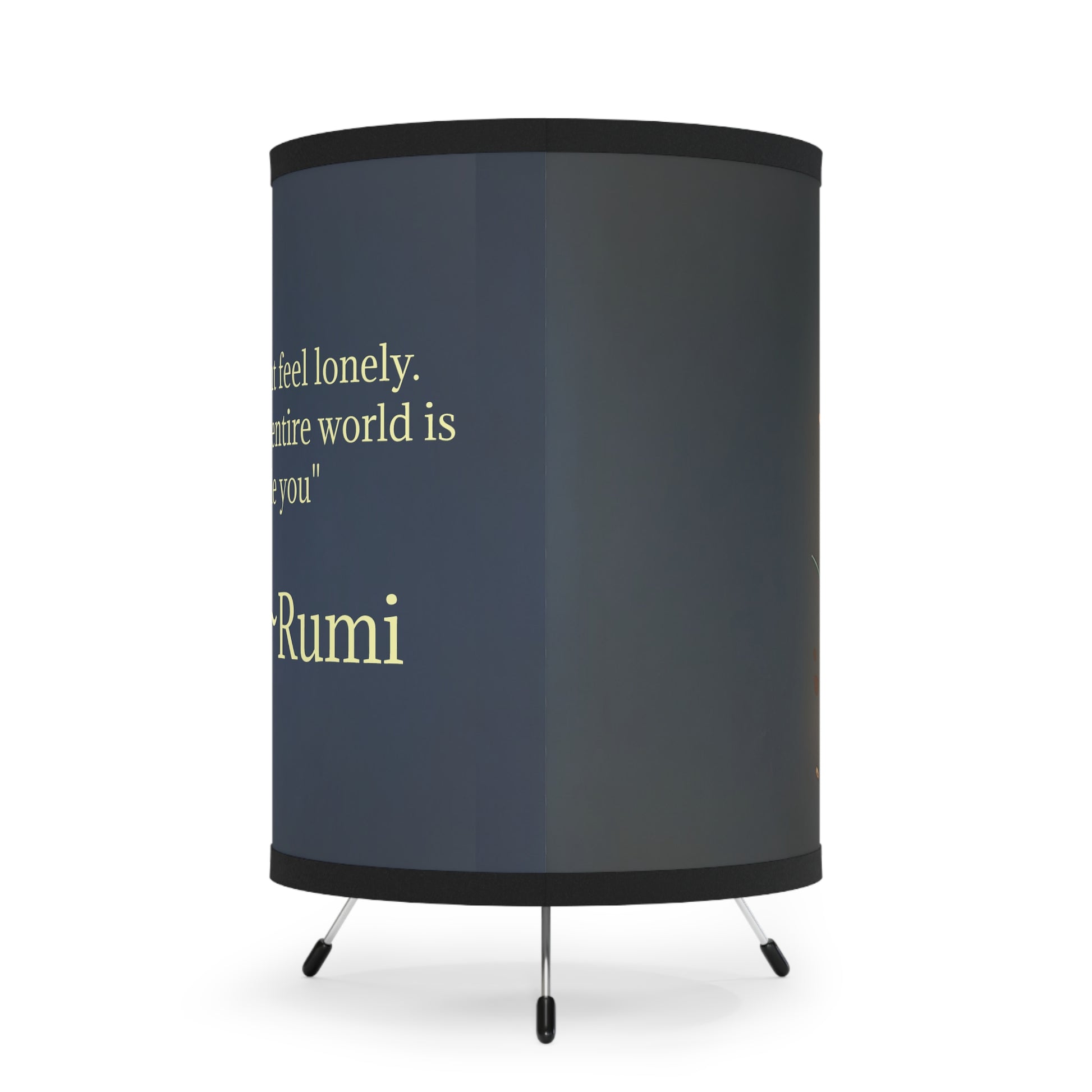 This Tripod Lamp with a Rumi Quote Design by Fairyhill Studio adds a touch of art and warmth to any home decor. The high-resolution print on the shade provides a cozy and inviting atmosphere, perfect for a reading nook or bedside table. Ideal for art enthusiasts and those looking to create a serene ambiance in their living spaces. Relevant for home decor, housewarming gifts, and special occasions.