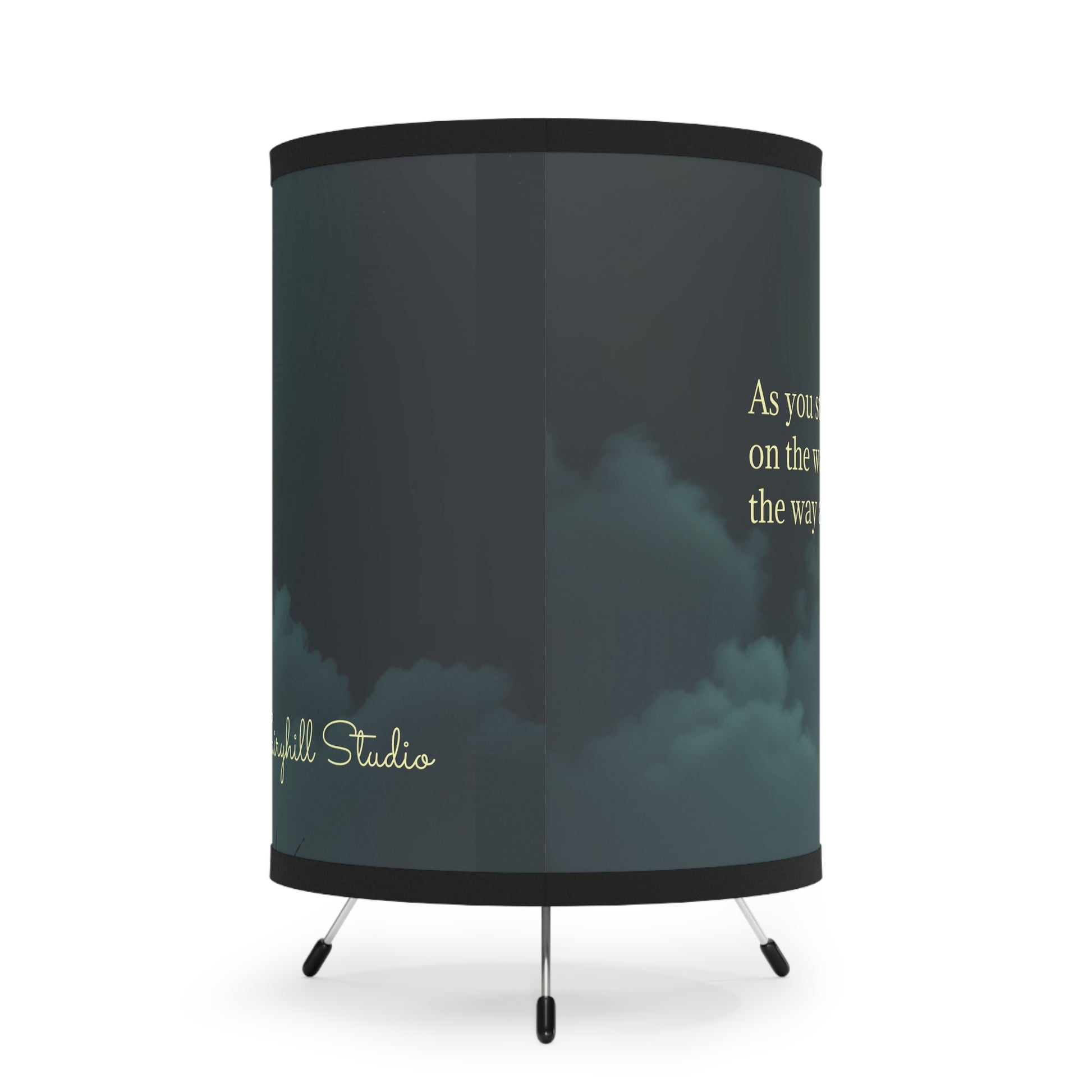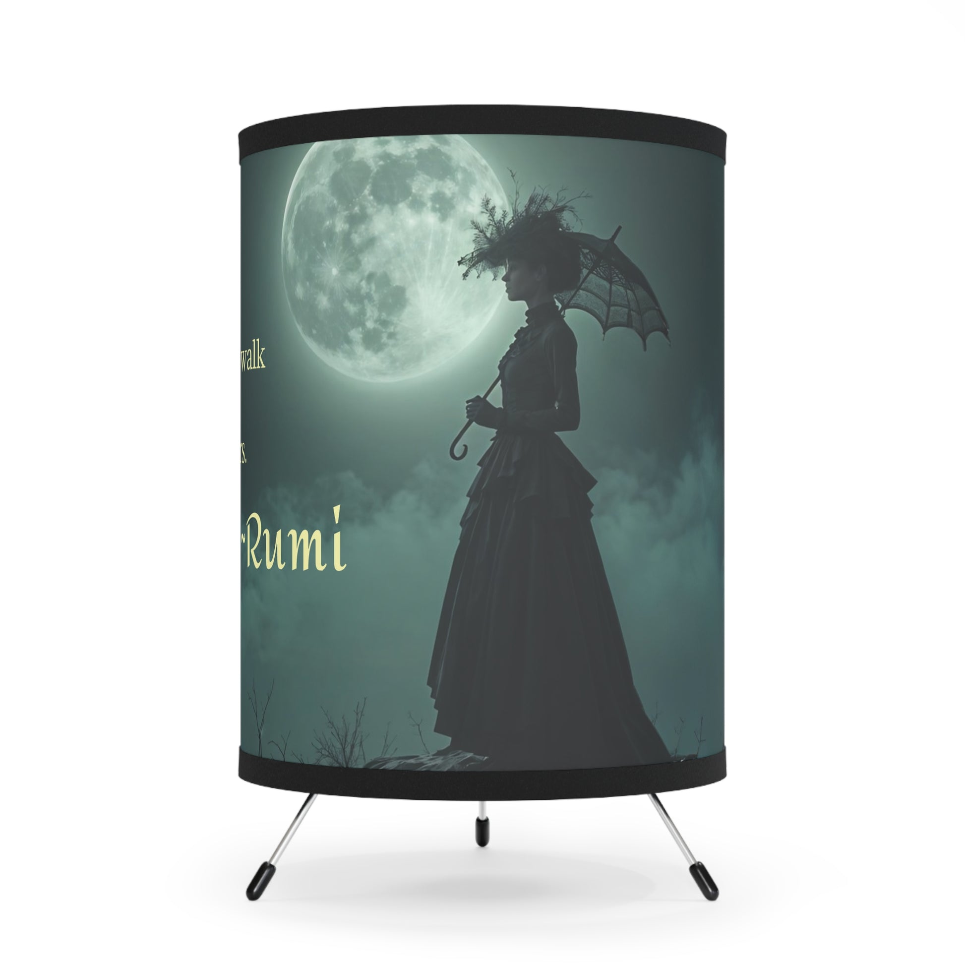 Vibrant Artistic Rumi quote Tripod Lamp with High-Res Printed Shade - Perfect for Home Decor Art by Fairyhill Studio. This tripod lamp provides warm and cozy lighting, featuring a unique, colorful high-resolution print design. Ideal for those looking to add a touch of art to their home decor, perfect for celebrations, special occasions, and everyday use.