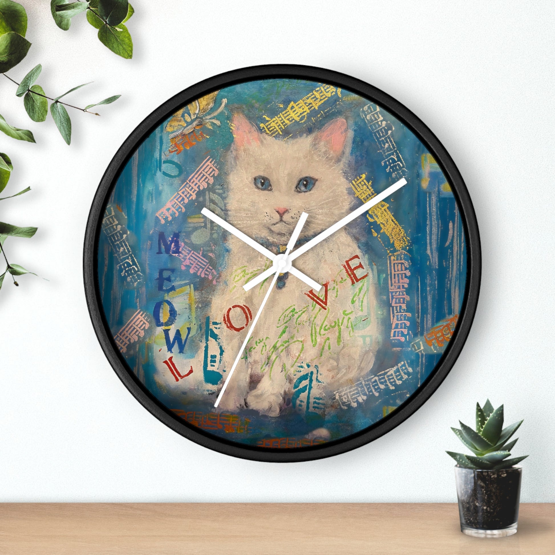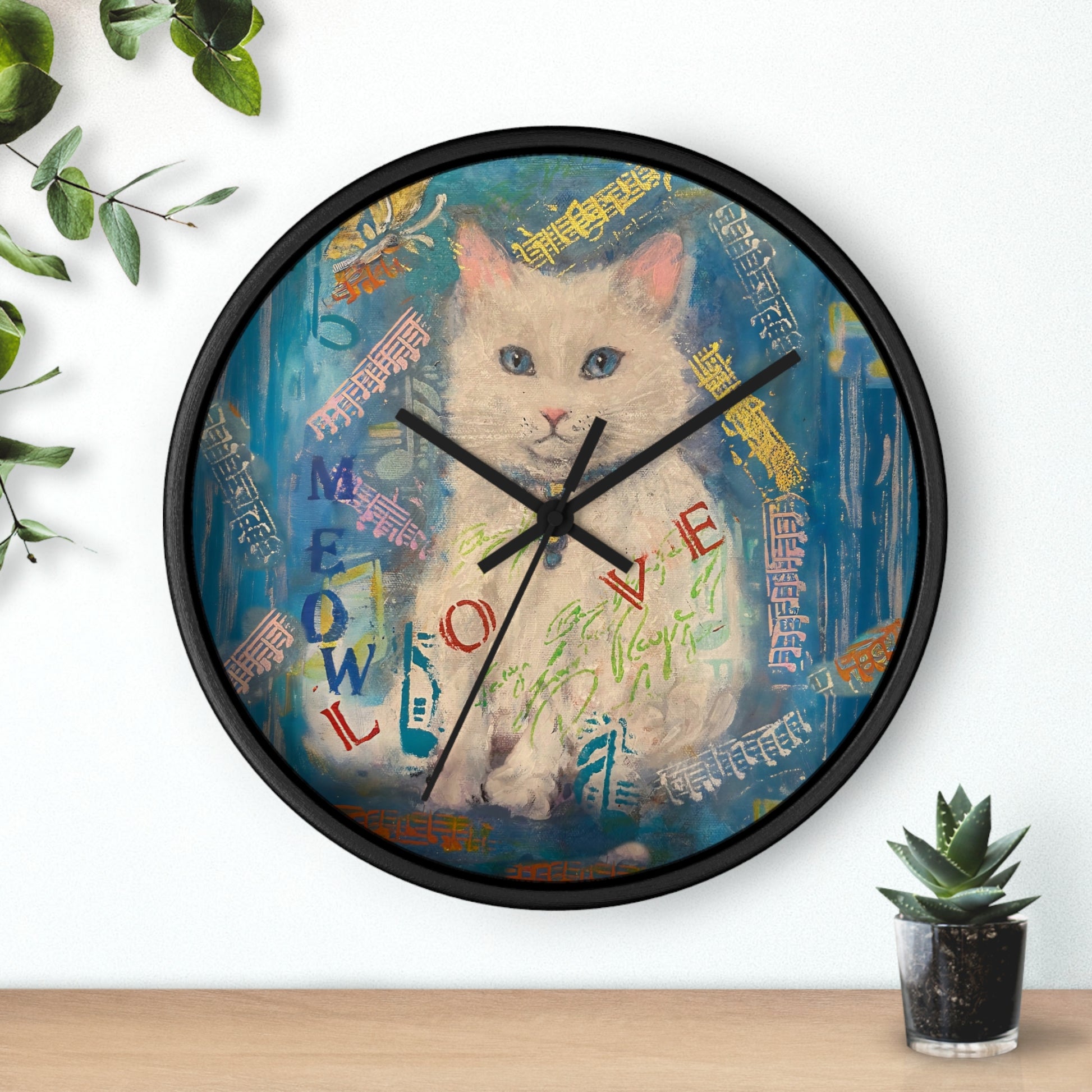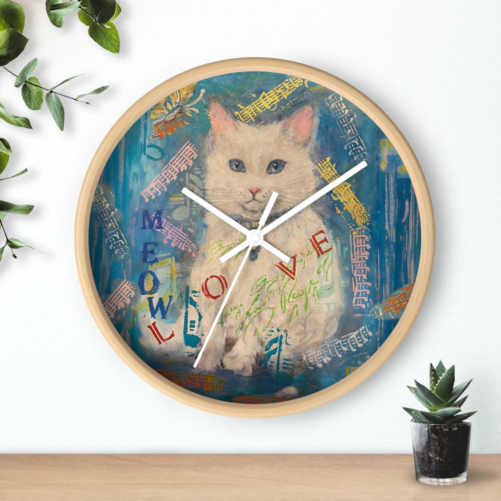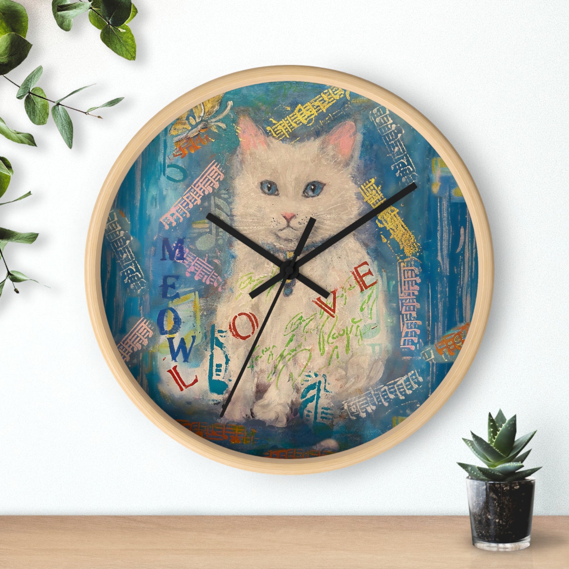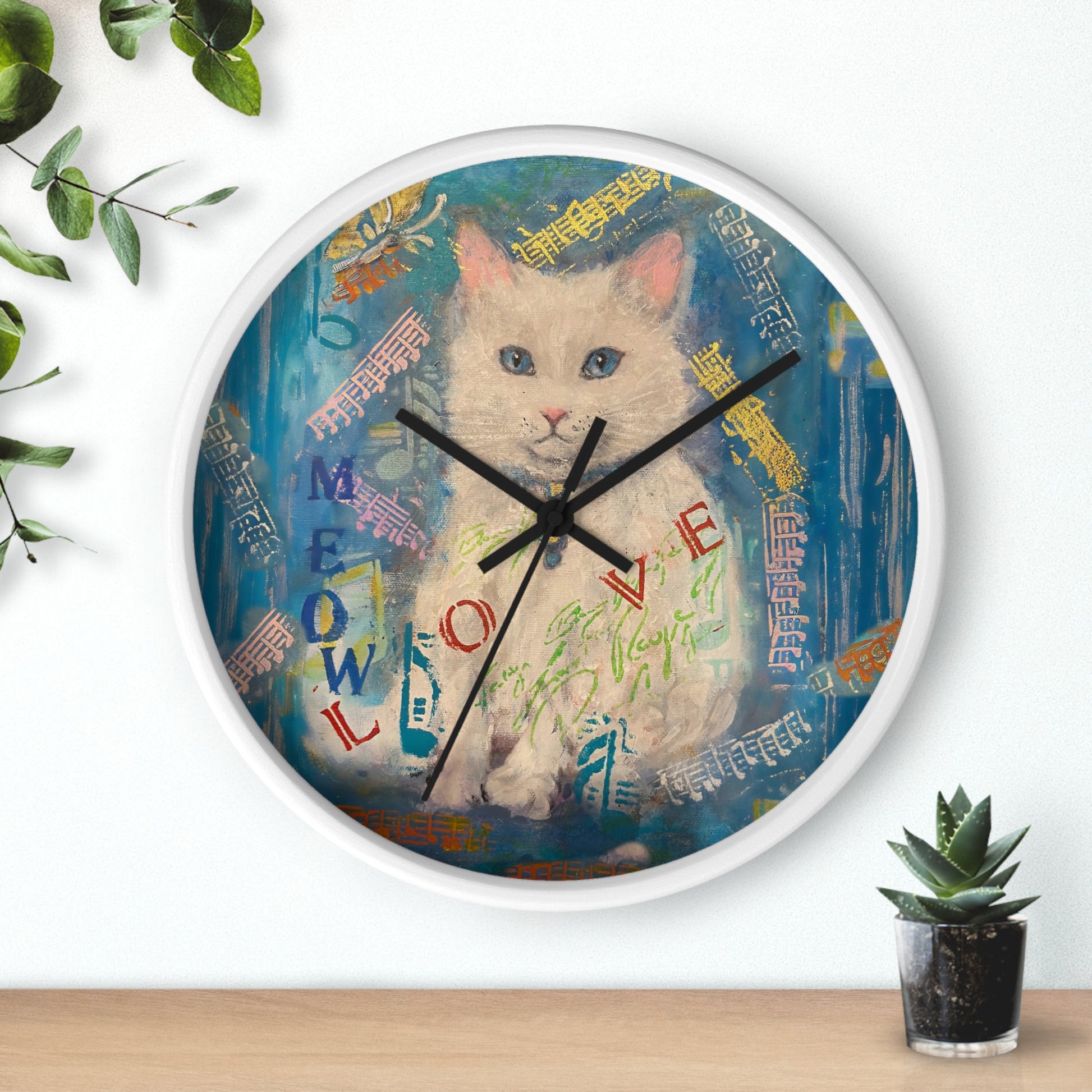 This Wall Clock features a lovely white cat with blue eyes art by Fairyhill Studio, adding a whimsical touch to any room. It is perfect for cat lovers and those who appreciate unique and artistic decor. Ideal for gifting on birthdays, housewarmings, or holidays.