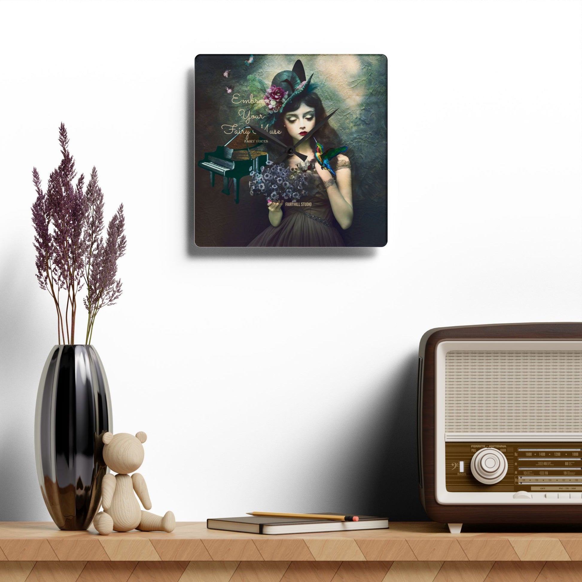 Add a whimsical touch to your home with this Acrylic Wall Clock featuring a girl with a hat looking at a colorful hummingbird art. Perfect for those who appreciate fairy-inspired decor, this clock will brighten up any room and bring a sense of magic to your space. Ideal for gifting during birthdays, housewarmings, or any special occasion.