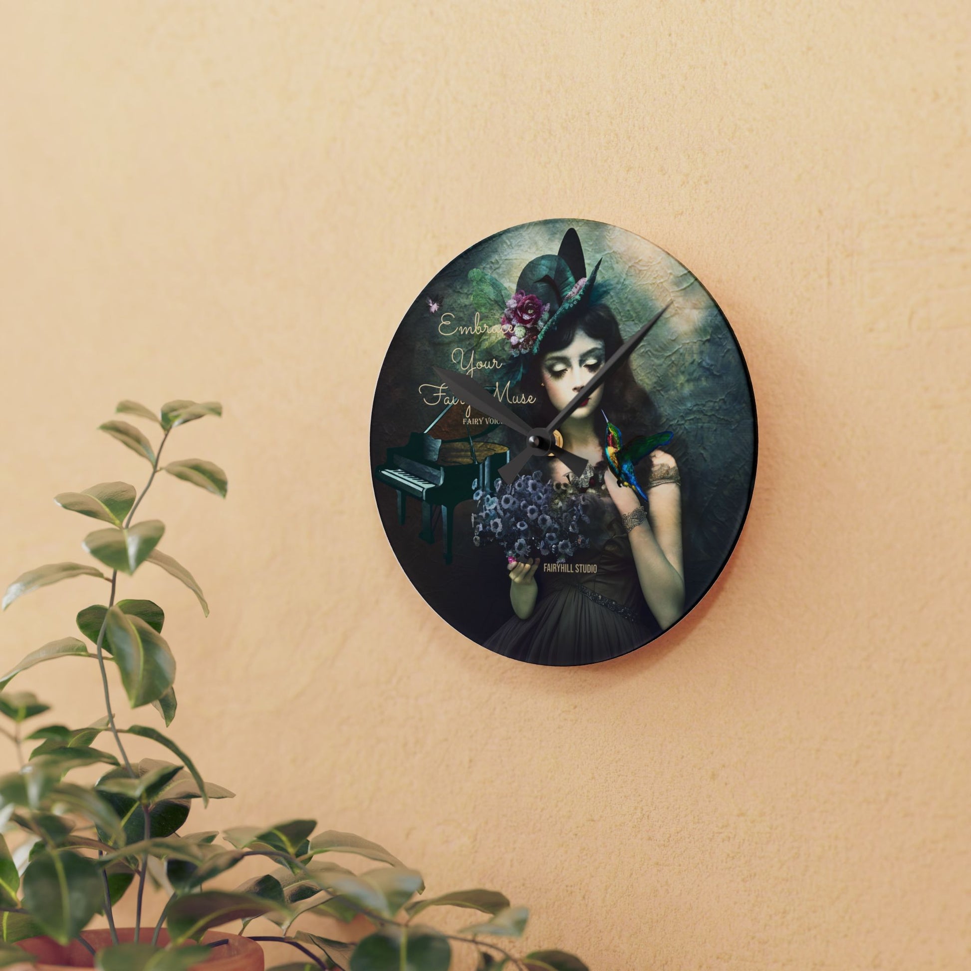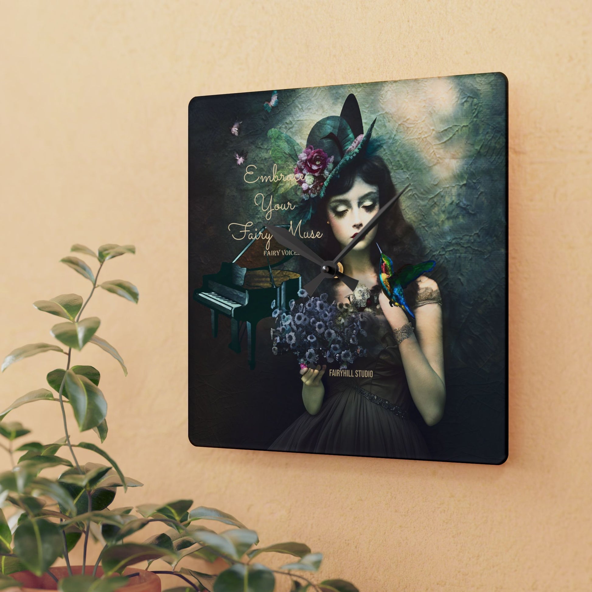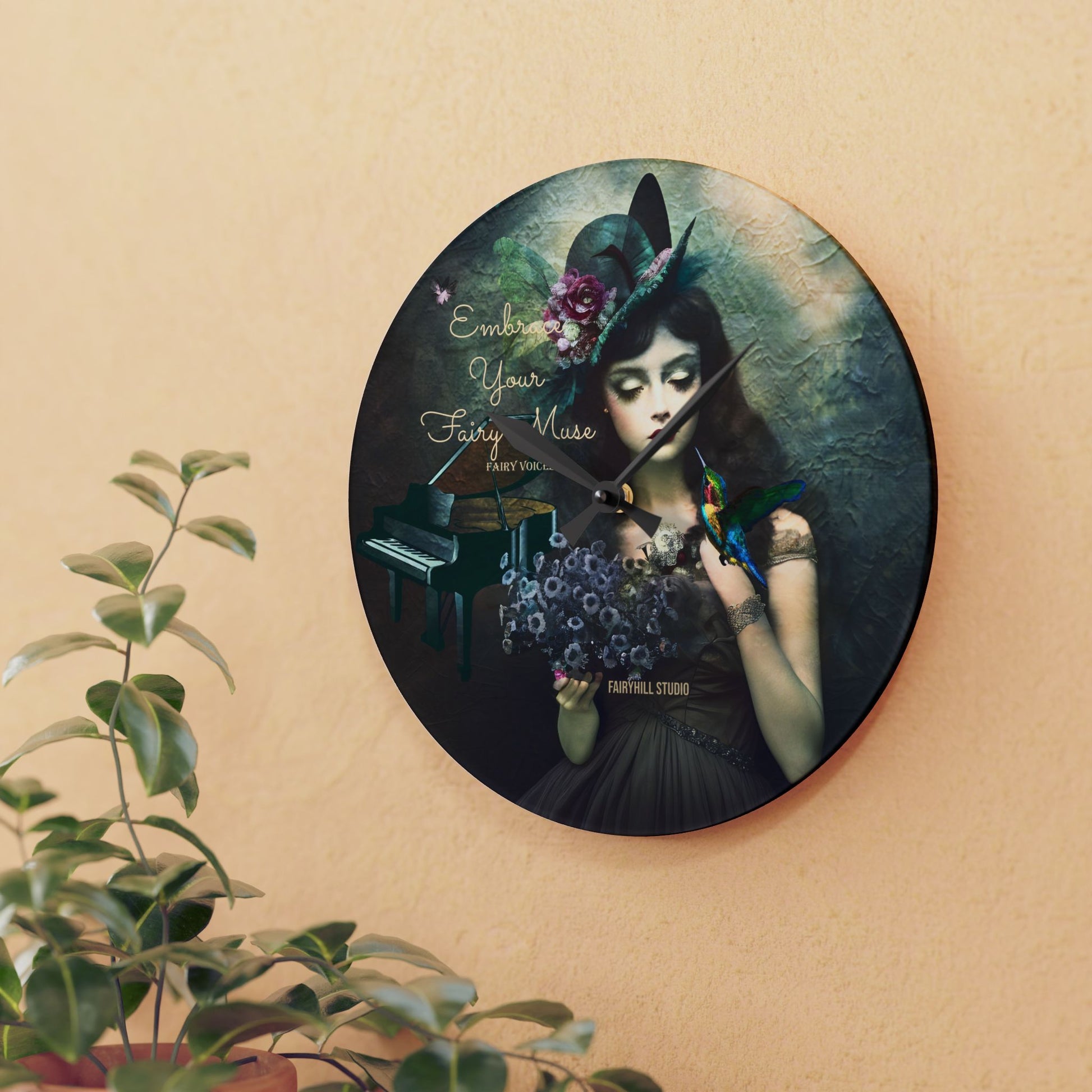 Wall Clock - Fairy Muse Girl with Hat and Hummingbird Art