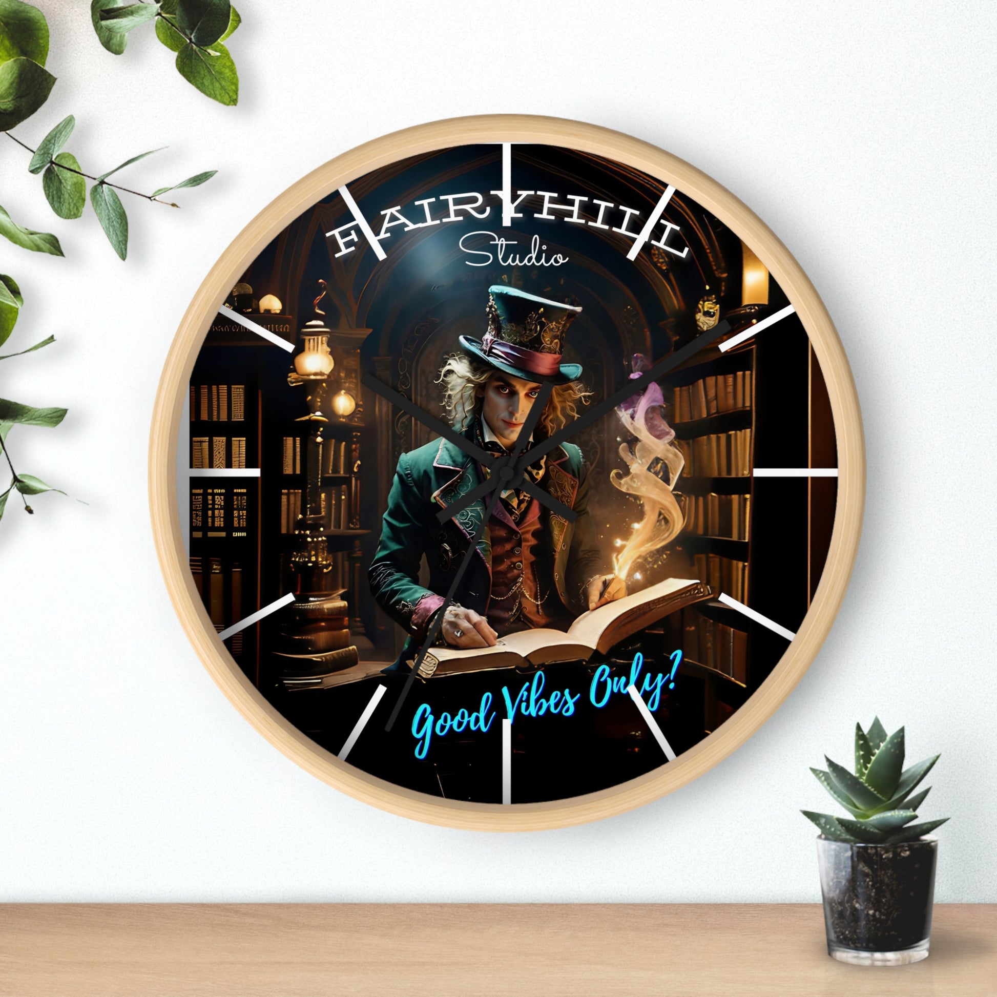 Add a touch of whimsy to your home with this "Good Vibes Only" Wall Clock featuring a whimsical Mad hatter surrounded by books. Perfect for anyone looking to infuse positive energy into their space, this clock is relevant for those who enjoy unique and artistic decor. Ideal for celebrations like birthdays, housewarmings, or simply as a gift to spread good vibes.