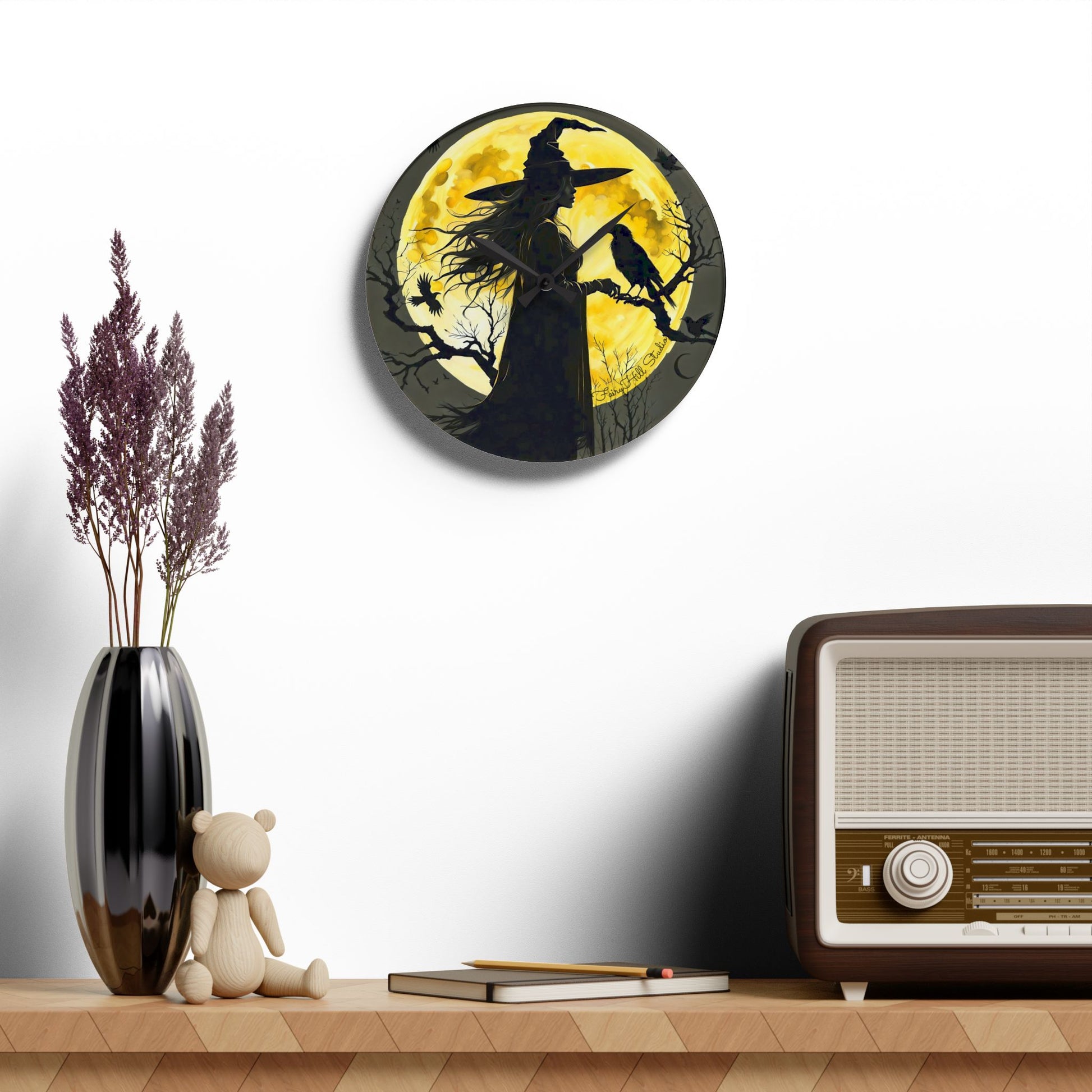 This wall clock features a black witch silhouette with a crow on a large bright yellow moon background, giving off a mystical and spooky vibe. Perfect for those who love witchy and magical decor, this clock is ideal for Halloween and any witch-inspired celebrations.